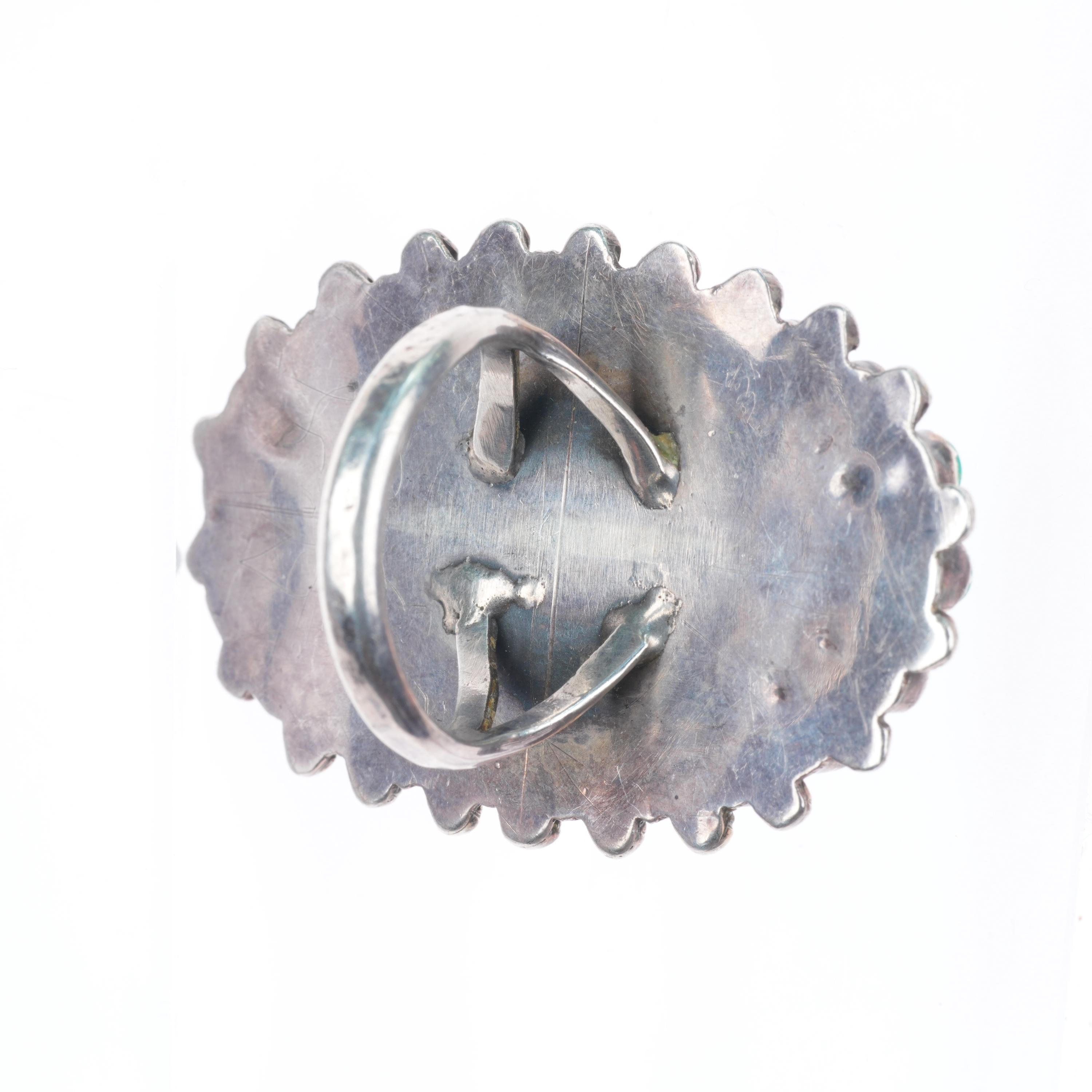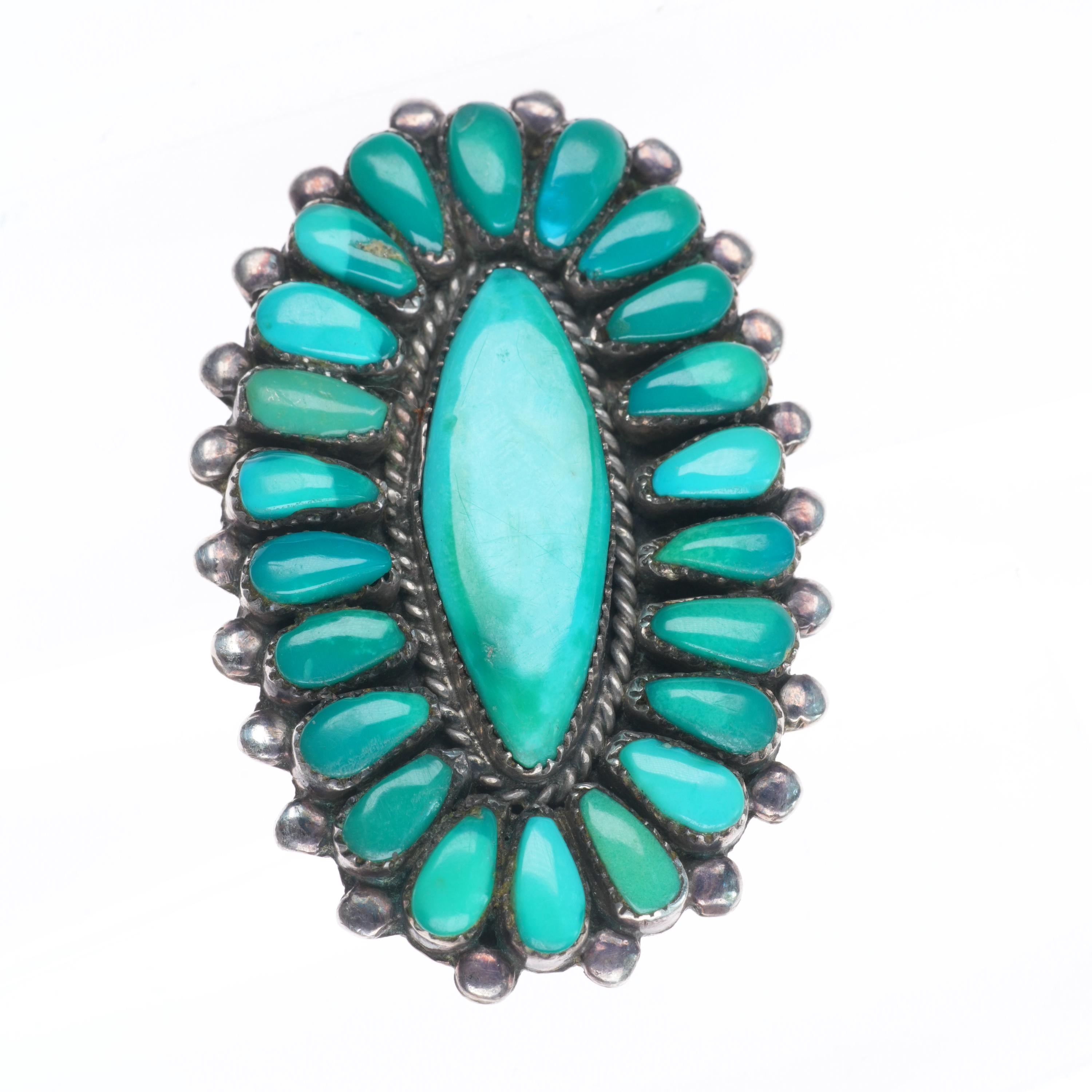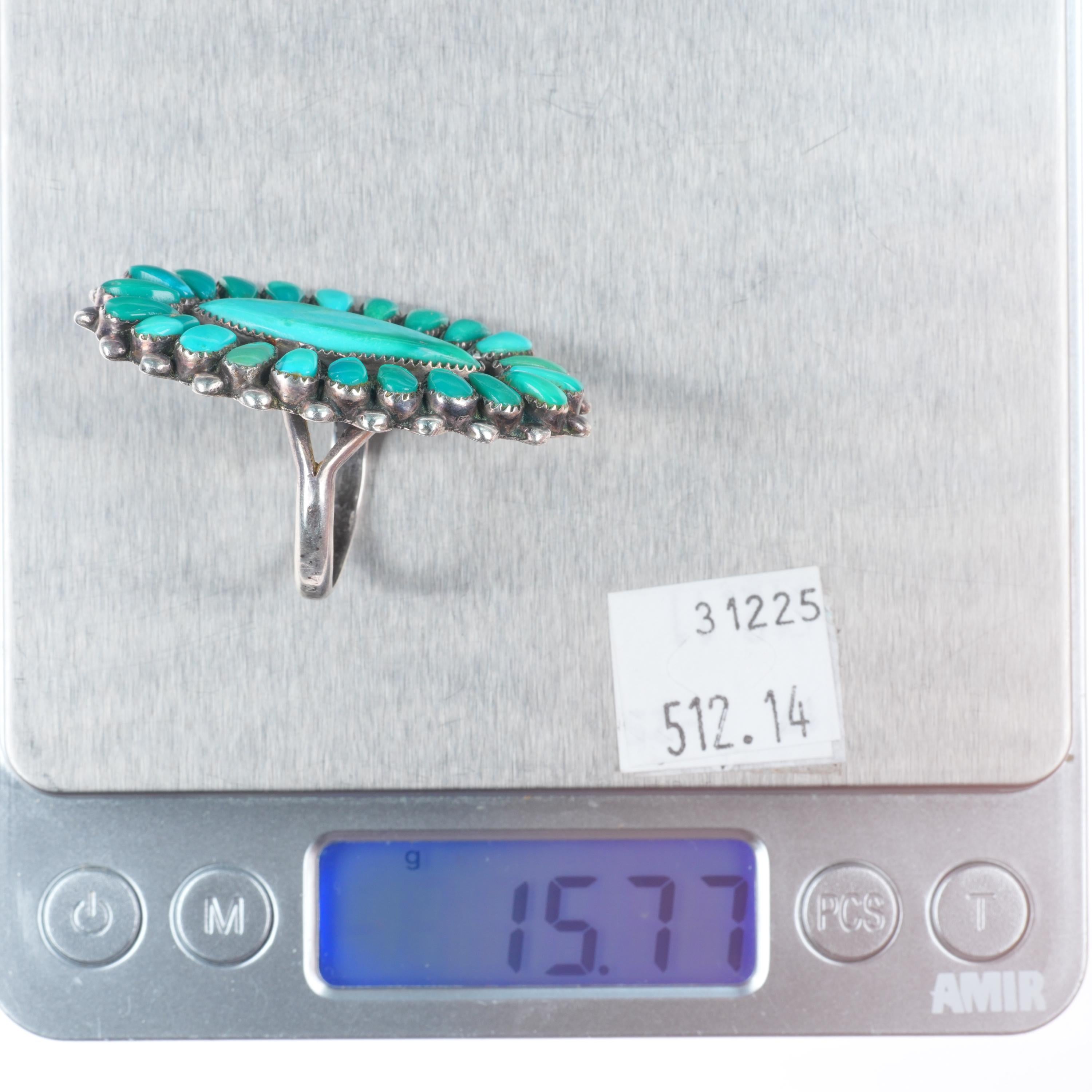 sz9.5 big vintage Zuni high grade turquoise cluster ring sterling silver. Tested and guaranteed solid sterling silver, circa mid 20th century. Some expected wear, weight and measurements in pictures. High grade natural American turquoise likely from Royston or another Nevada mine.