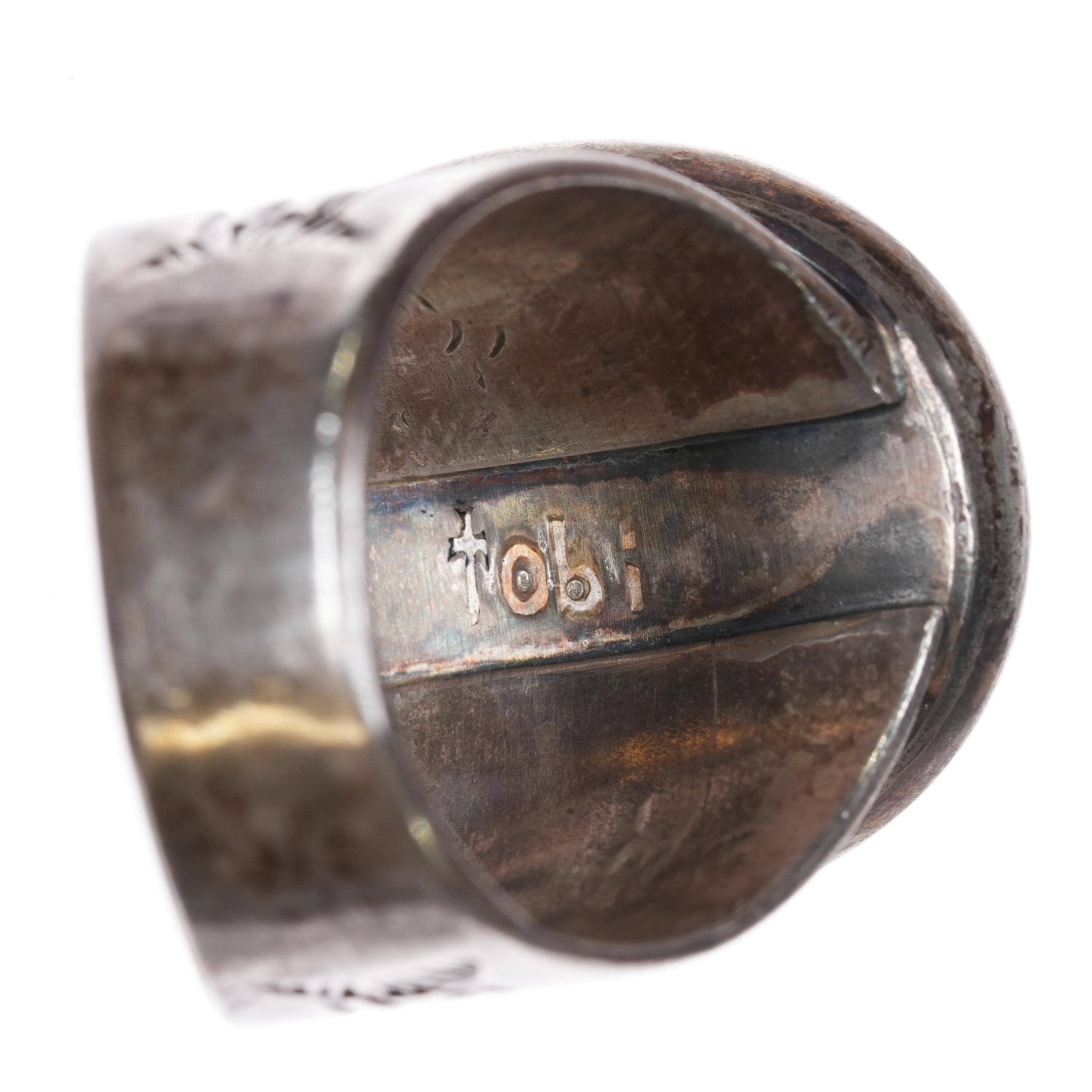 Sz9 Vintage Tobi Sterling silver and turquoise ring. Weight and measurements in pictures. Solid sterling silver, signed by the artist with fracture in stone. Stone secure in bezel.