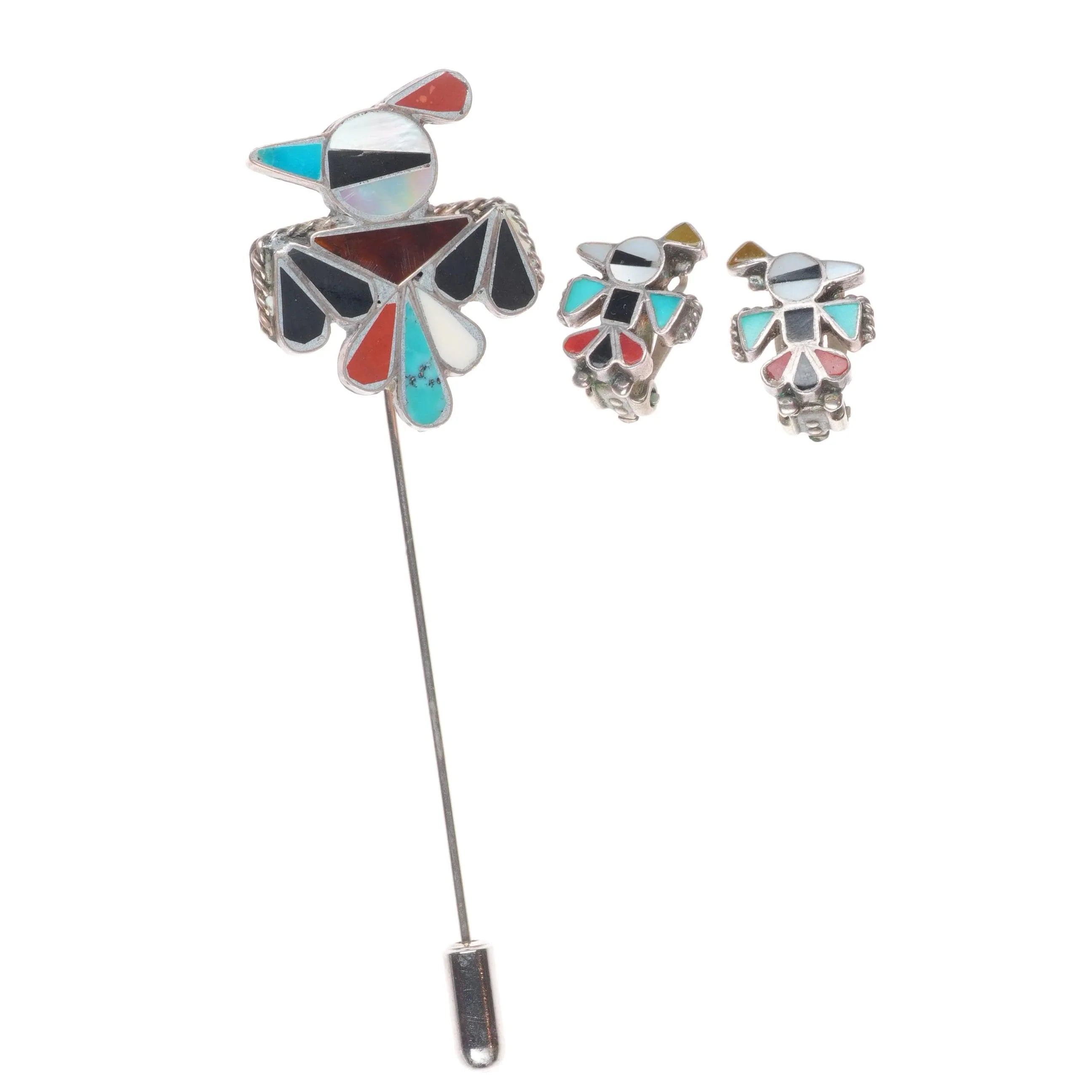 Vintage 1950's-60's Zuni sterling silver thunderbird stickpin/clip on earrings
