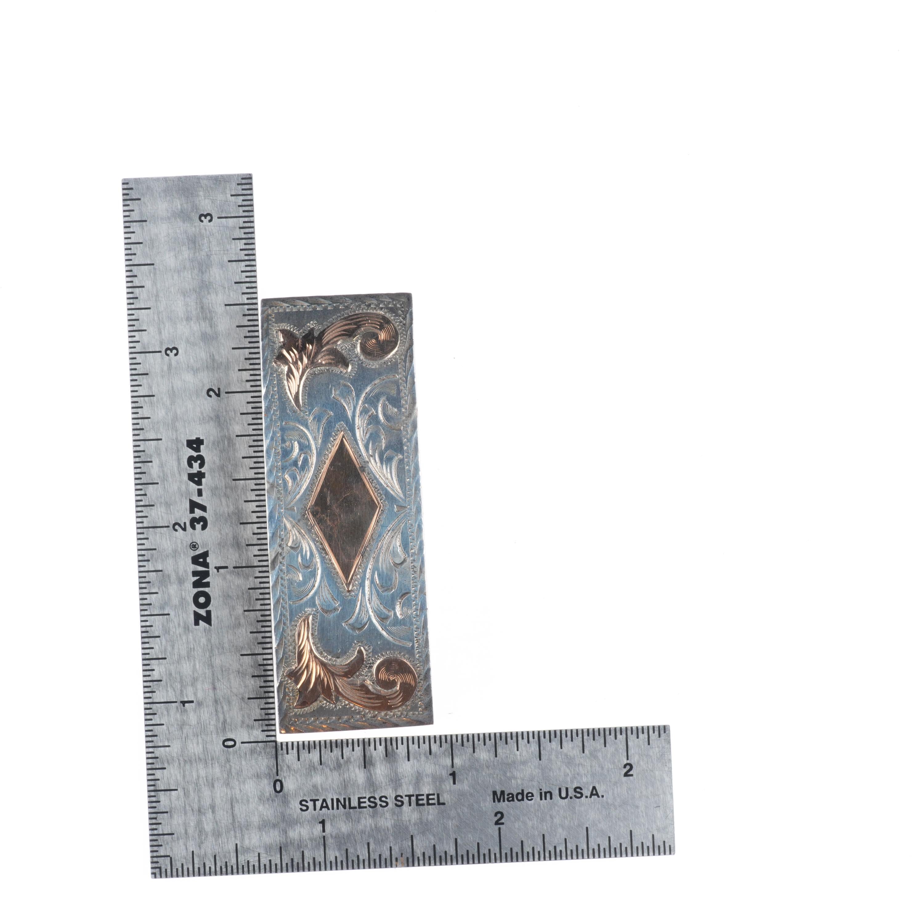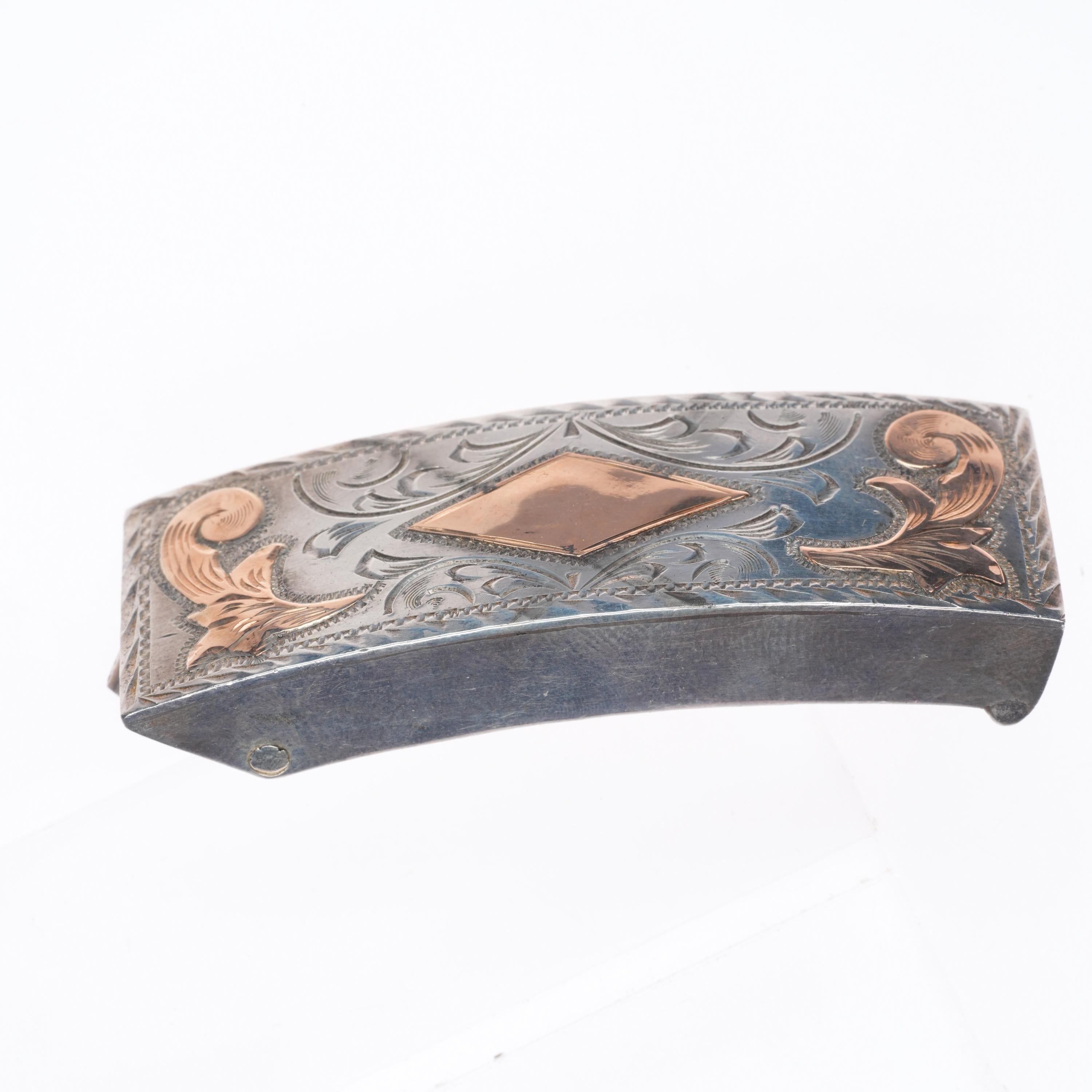 Vintage 1960's 10k gold on engraved sterling silver Mexican belt buckle. Tested and guaranteed solid 10k gold pieces on sterling silver with weight and measurements in pictures. Fully functional. All items will likely have some age appropriate/expected wear, the older they are the more wear they should have. Circa third quarter of the 20th century.. Fits up to a .75" belt.