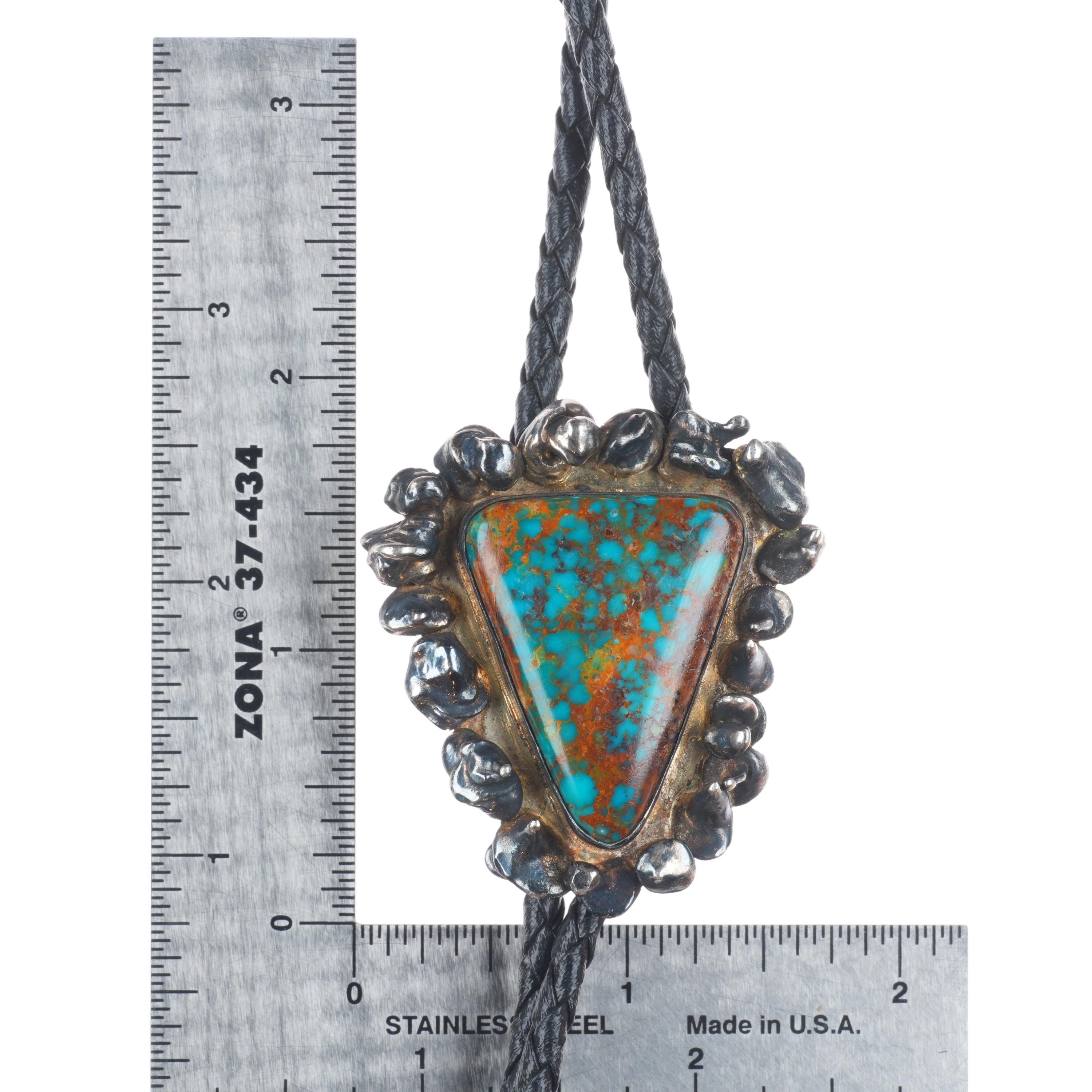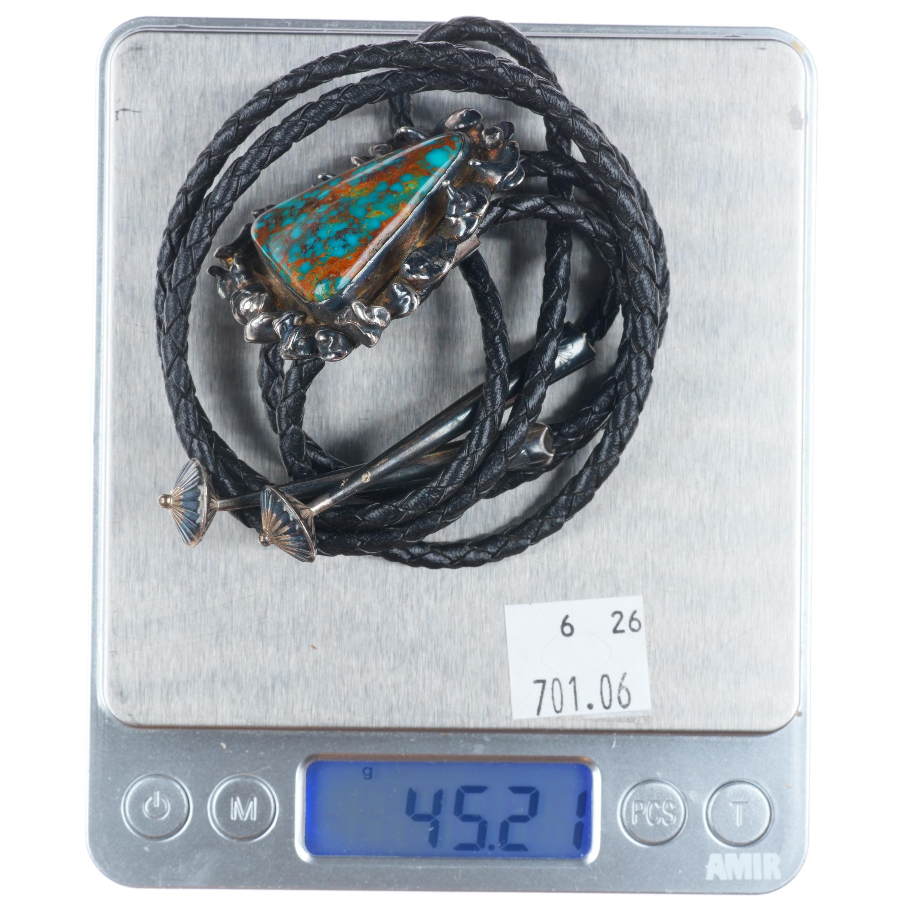 Vintage Brutalist sterling silver high grade spiderweb turquoise bolo tie. Tested and guaranteed solid sterling silver slide and tips. Weight and measurements in pictures. Great bolo, 38" long with no issues. Weight shown is the entire bolo. Illegibly signed Turquoise likely from a Nevada mine.