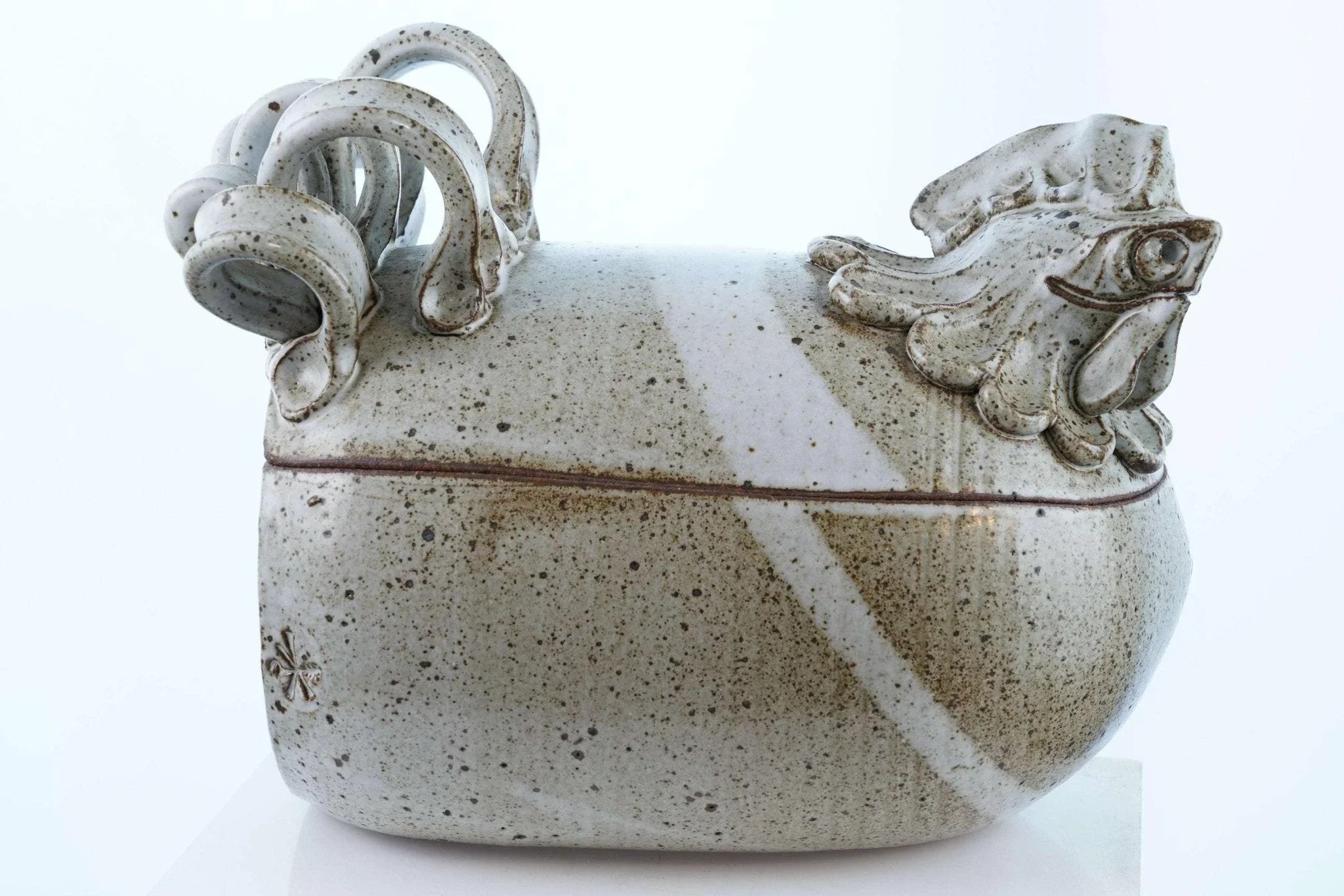 Vintage Ginny and Paul Anthony Studio Pottery Chicken Cooker Sculptural casserole dish 10.5" long x 8.5" tall x 6" wide total with feathers/etc. Unused mint condition with no damage or wear. Original paperwork both from the potters and from Clarksville Pottery here in Austin, TX that retailed it. Care/use instructions included, it's ovenproof and dishwasher proof. Cool vintage glaze on this one. Later versions of this are white. Chicken Cooker The sculptural Chicken Cooker has become a true “Culinary Classic”. So often, we hear, “I don’t know what I’d do without one!” Our Chicken Cooker gently cooks all foods in their own juices. Added herbs and spices permeate thoroughly to delicately flavor the food. The design seals in moisture and natural juices making meats, fish, poultry and vegetables tender and tasty. NO culinary talent is needed! Will hold 4 lb. hen, 3 ½ lb. rolled roast or 3 lb shellfish. Recipes & Instructions are included. This older version does not include dishwasher or Microwave instructions as they were not readily used when this was made in the 70's or 80's. Dishwasher and Microwave Safe. Lead Free Glazes. tw71