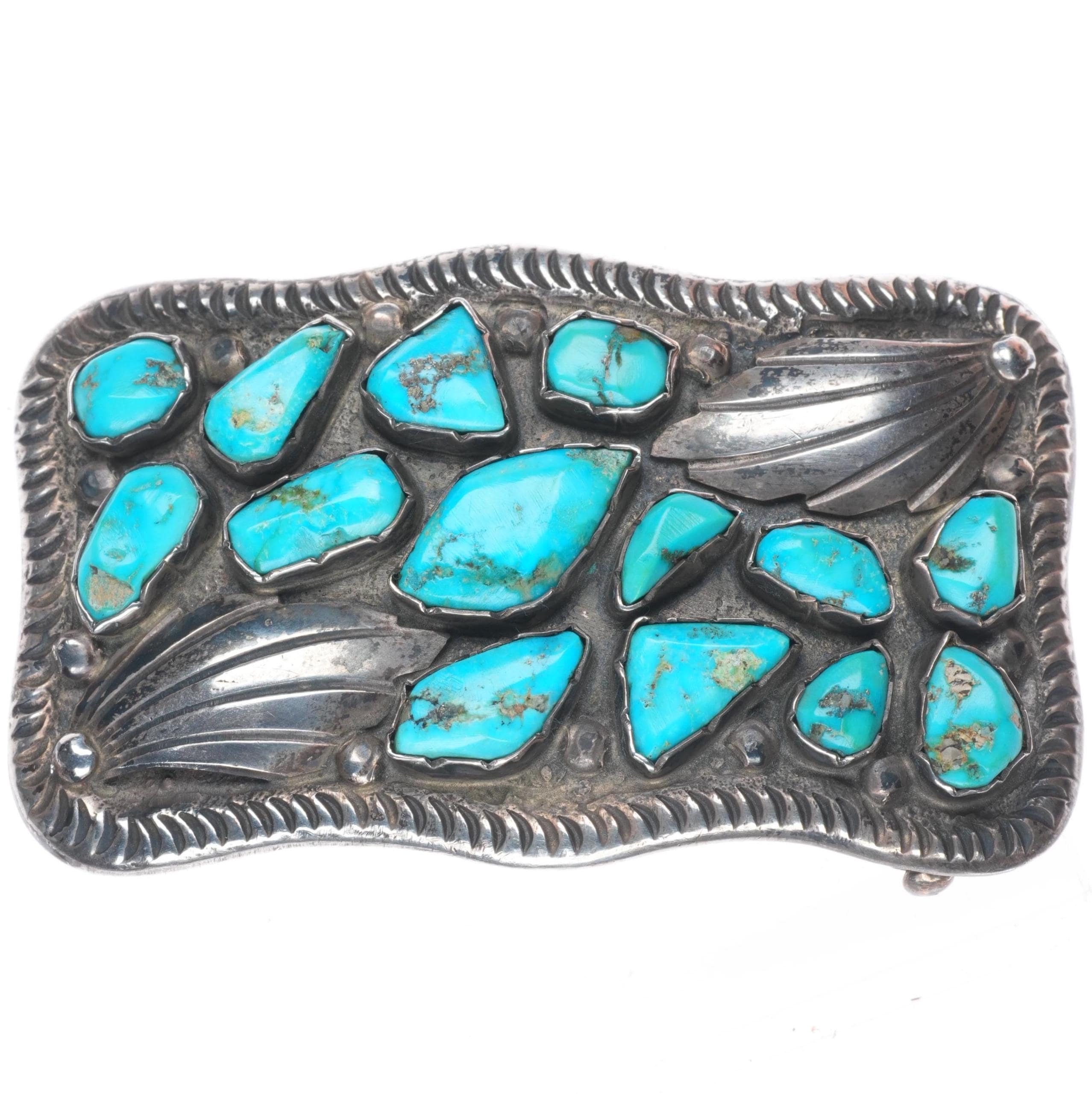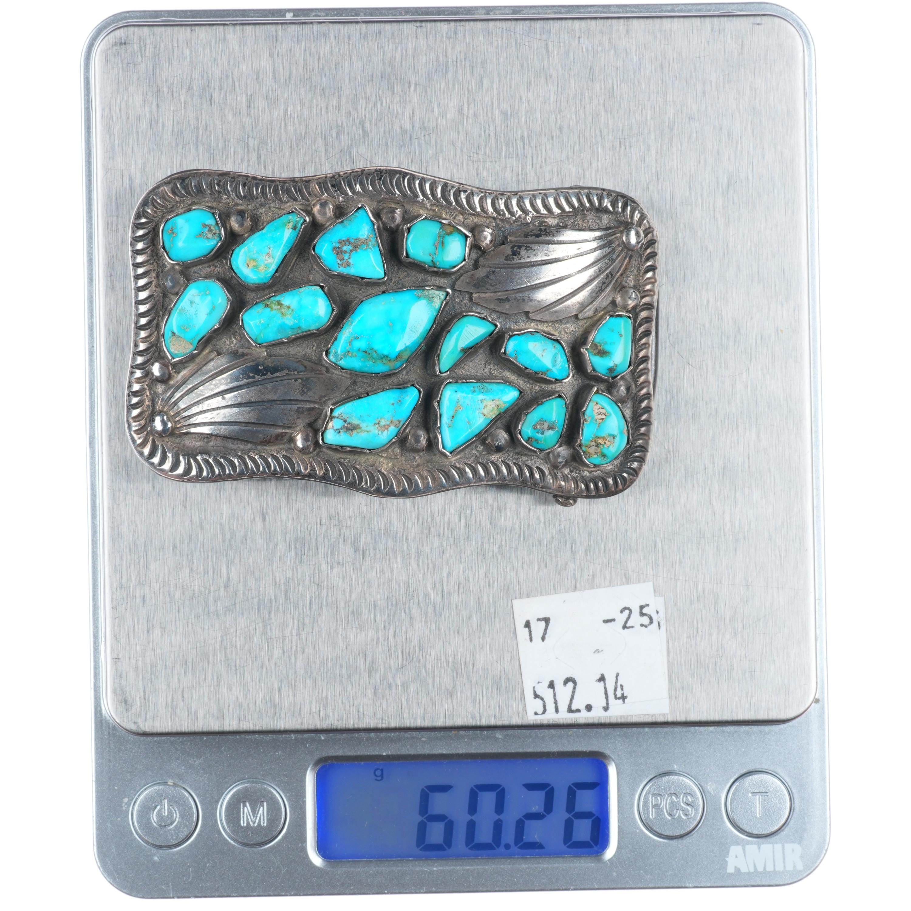 Vintage Juan Calavaza Zuni sterling silver turquoise cluster belt buckle