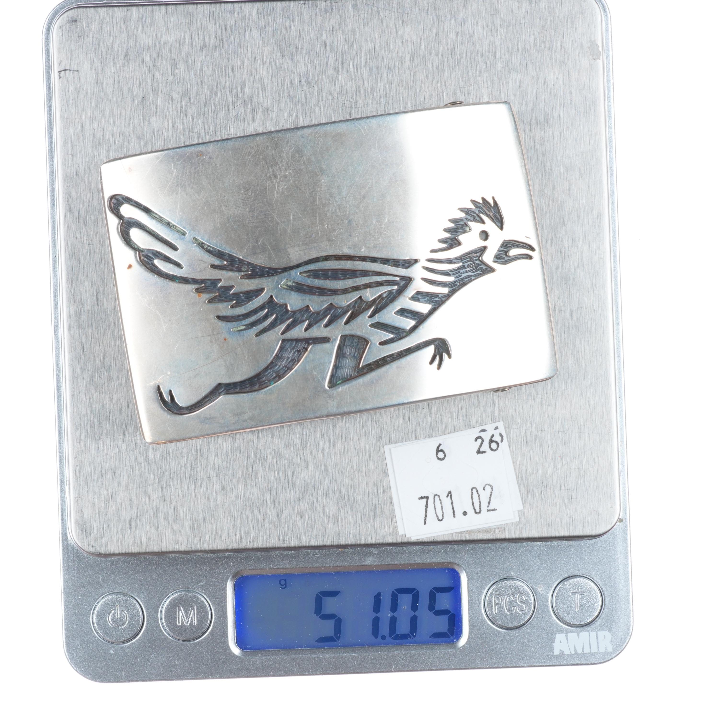 Vintage Karen Dale Navajo sterling silver roadrunner belt buckle. Tested and guaranteed solid sterling silver with weight and measurements in pictures. Fully functional. All items will likely have some age appropriate/expected wear, the older they are the more wear they should have. Circa third quarter of the 20th century.. Fits up to a 1.5" belt.