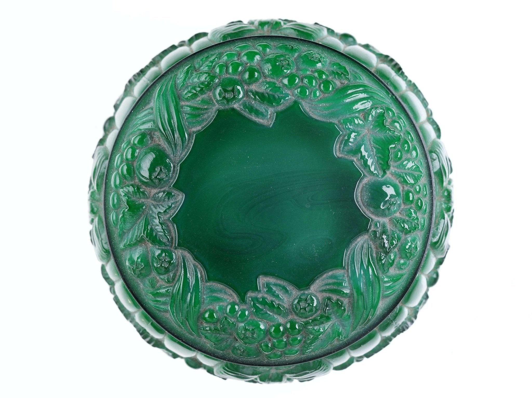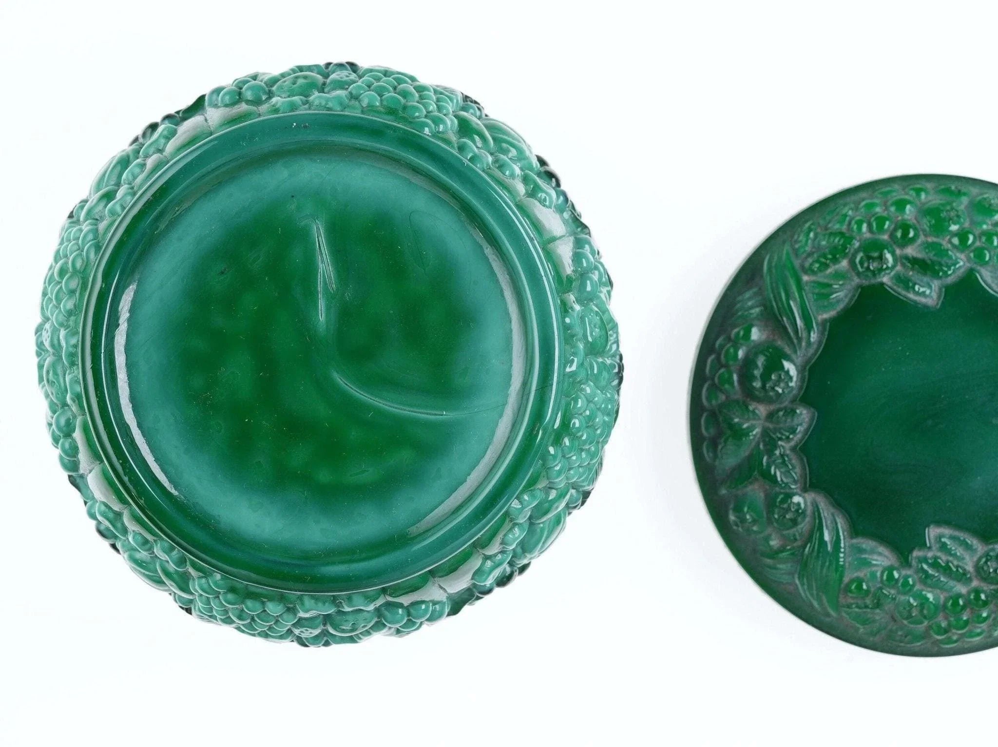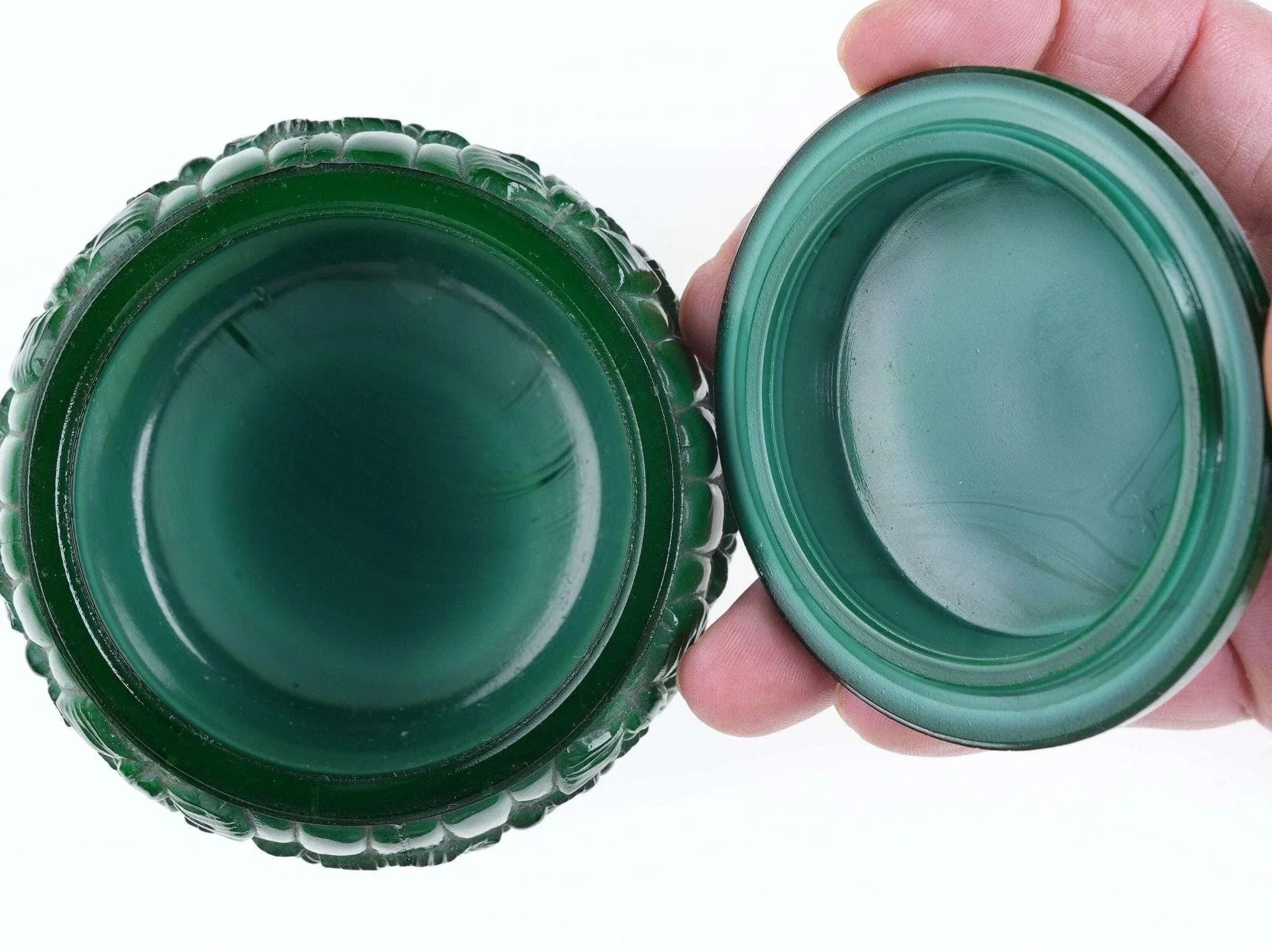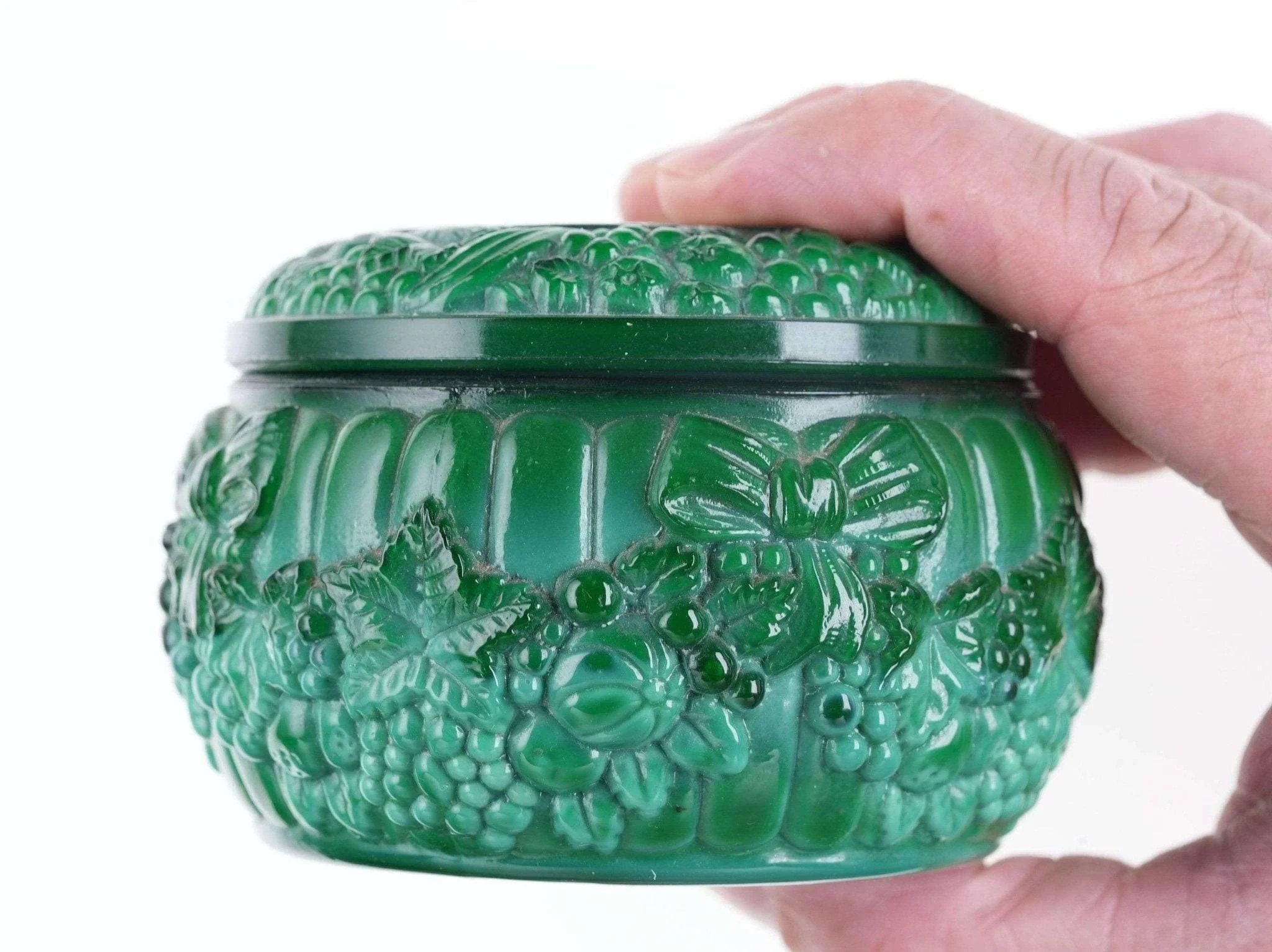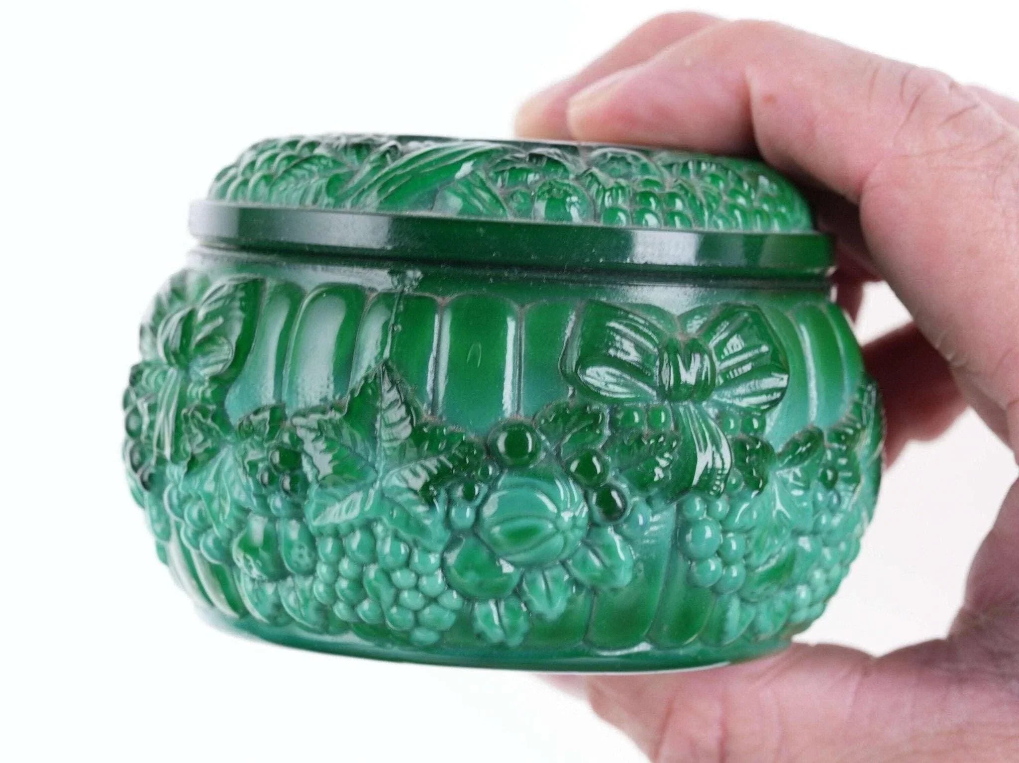Vintage Malachite glass Powder Jar. Fantastic powder jar from the first half of<br>the 20th century with no damage c1930's pressed glass.. 3.5" wide x 2 3/8" tall.<br>No apparent markings but a good old jar most likely Bohemian/Czech.<br>dresserdrawer