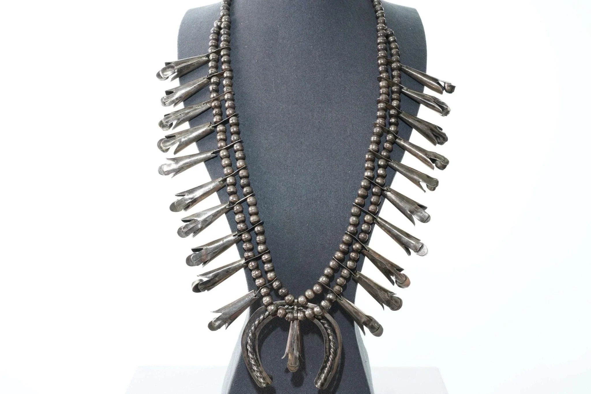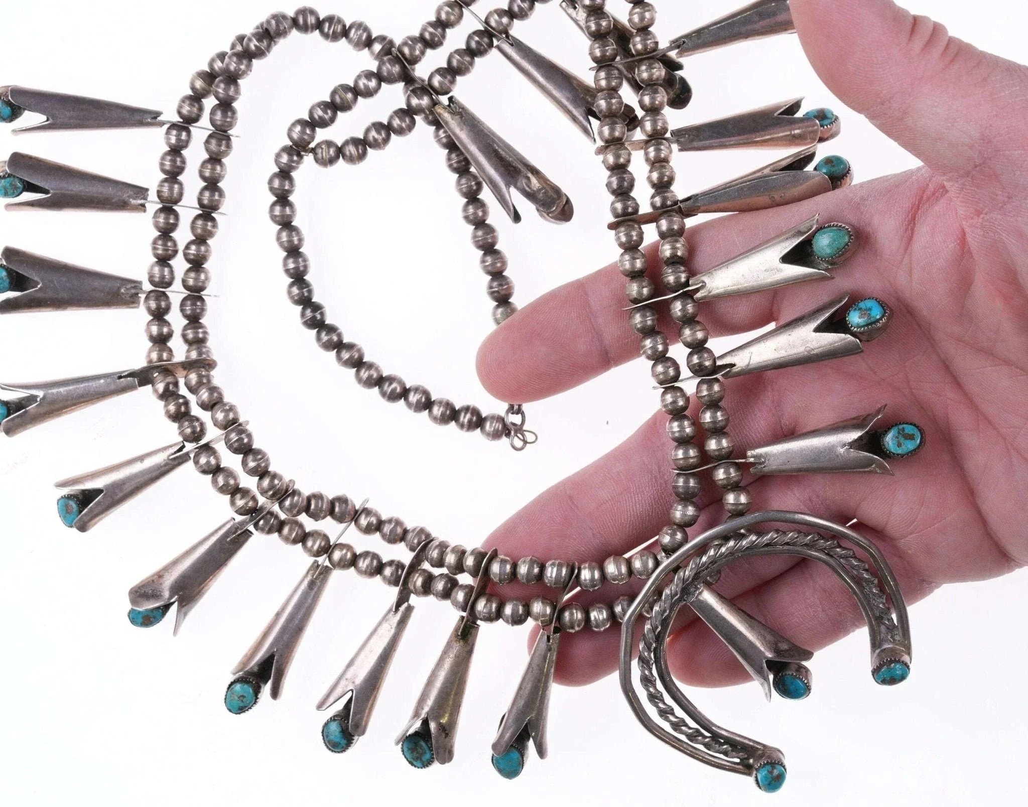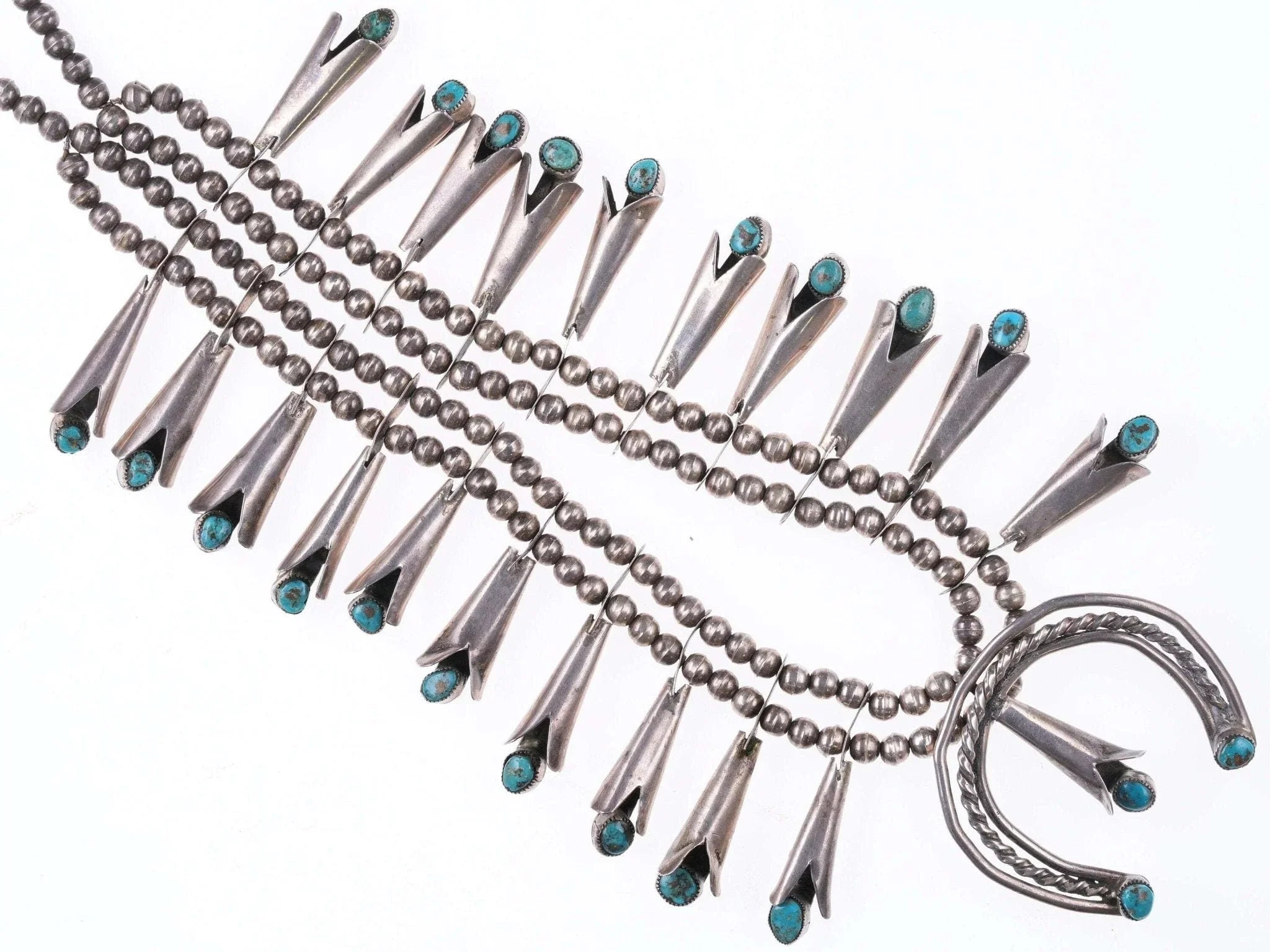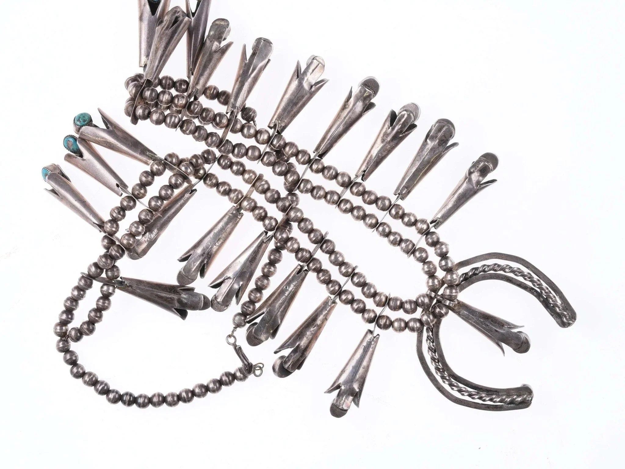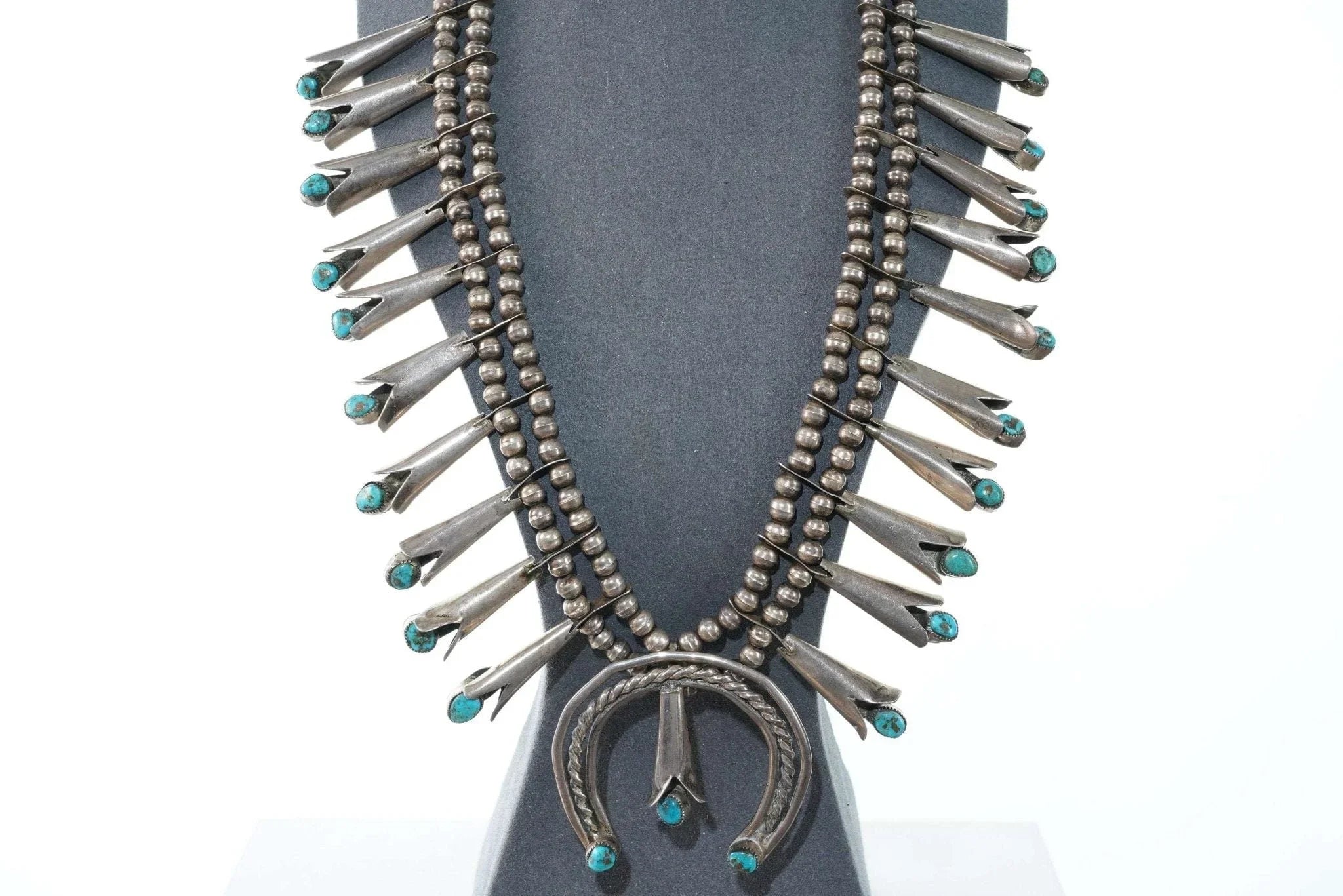 Vintage Navajo Silver and turquoise squash blossom necklace. Very cool old<br>squash blossom with no detectable markings from the third quarter of the 20th<br>century with no significant issues. 24" long with 2 3/8" x 2.25" naja. 155.2<br>grams<br><br><br>All precious metals are tested and guaranteed, any Native American jewelry<br>referred to as Silver or Sterling is guaranteed to be a minimum of 90% (coin)<br>silver and possibly higher content. Anything marked is guaranteed to be what<br>it's marked, most bracelets are photographed on a 6" wrist (non hairy), rings<br>photographed on the appropriate sized finger when possible. With bracelets if<br>the measurement is not given in the description then inside circumference is<br>shown where the metal meets the number on the the cloth tape measure.