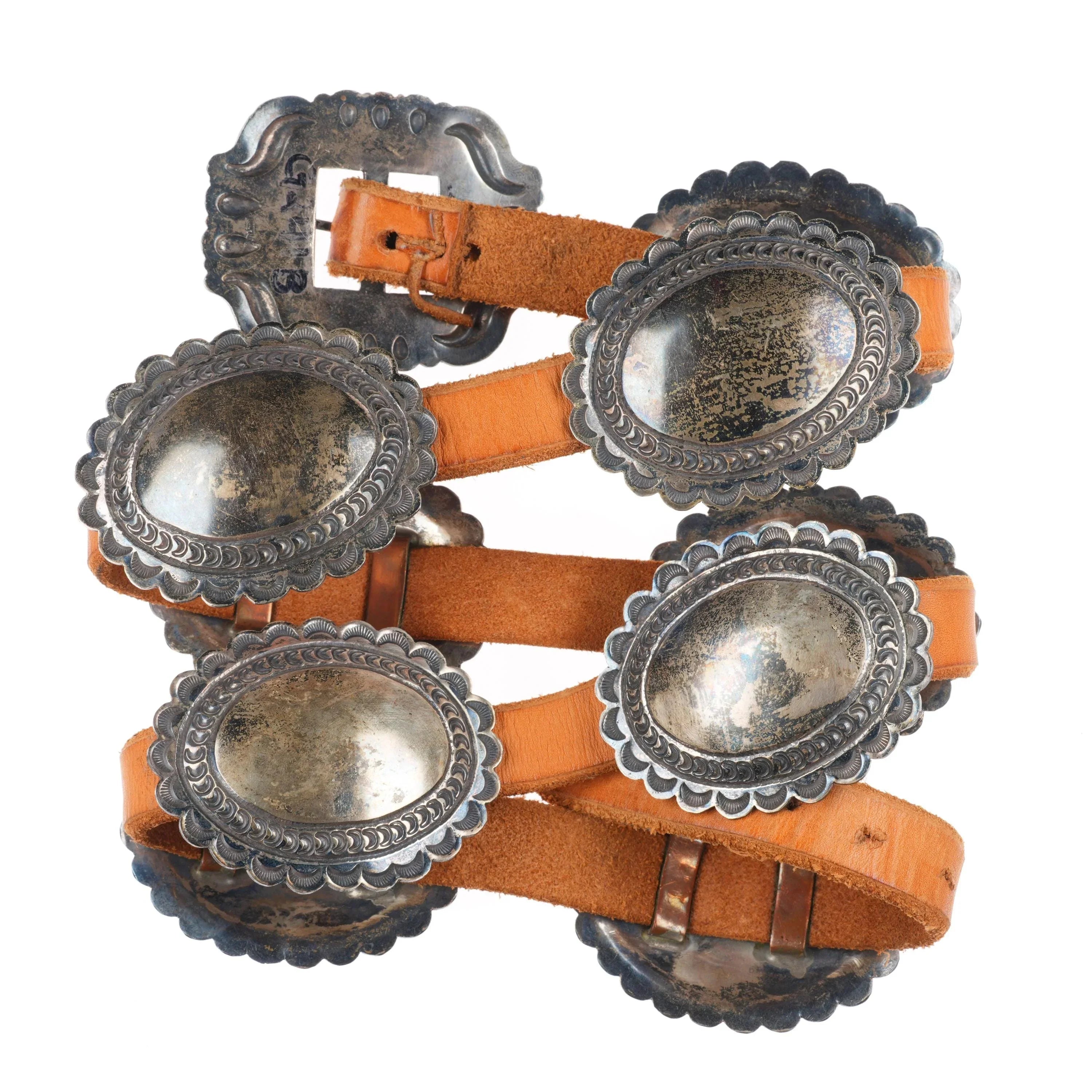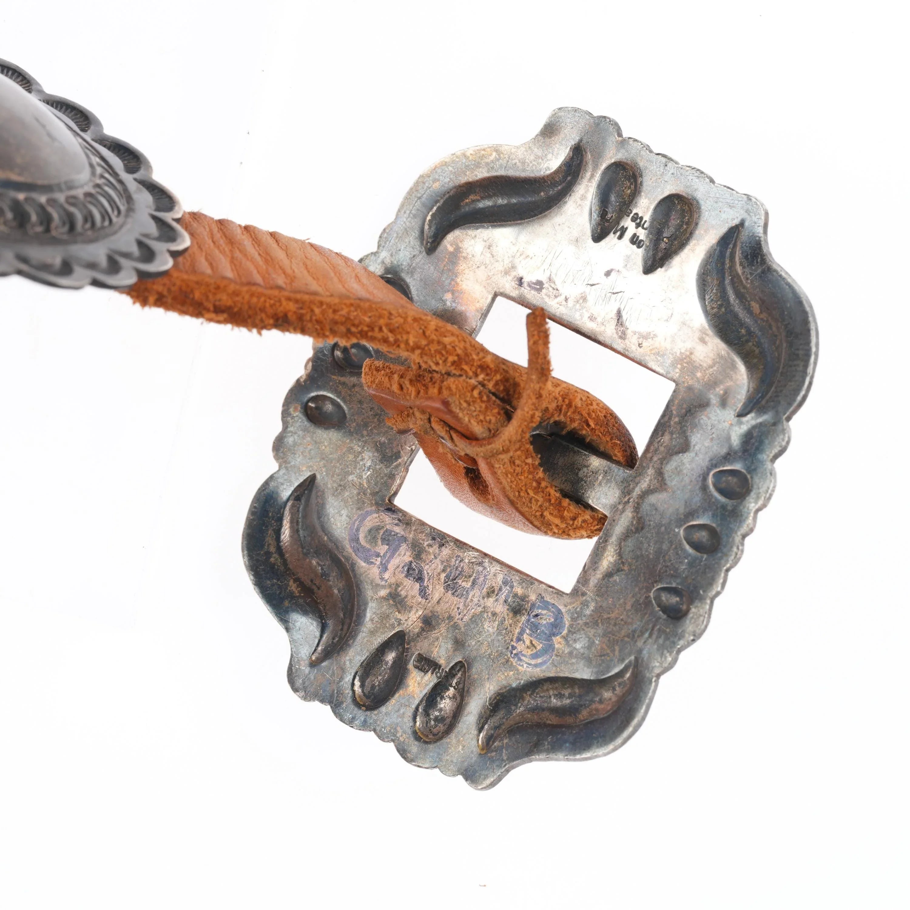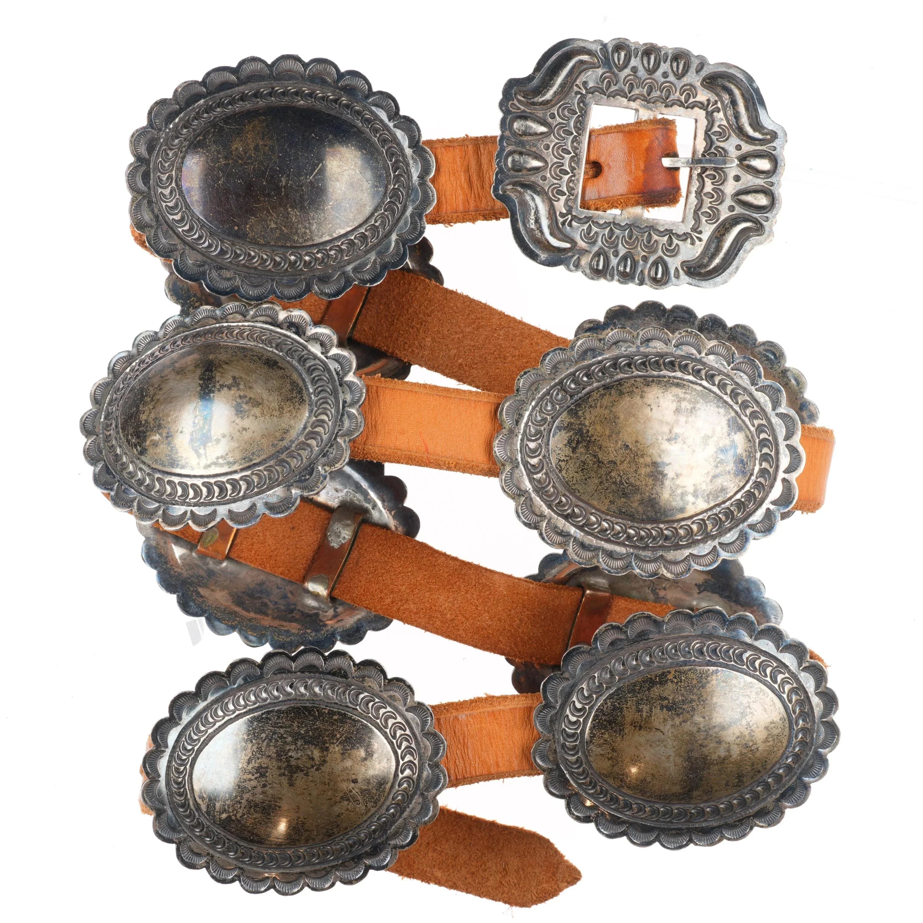 Vintage Navajo sterling silver heavily stamped concho belt. Tested and guaranteed sterling silver. Weight and measurements in pictures, 9 conchos, 1 buckle. Fits up to a 32.5-36.5" waist with existing holes but can of course be worn shorter or a little longer. Hallmarked as shown, unidentified due to time limitations.
