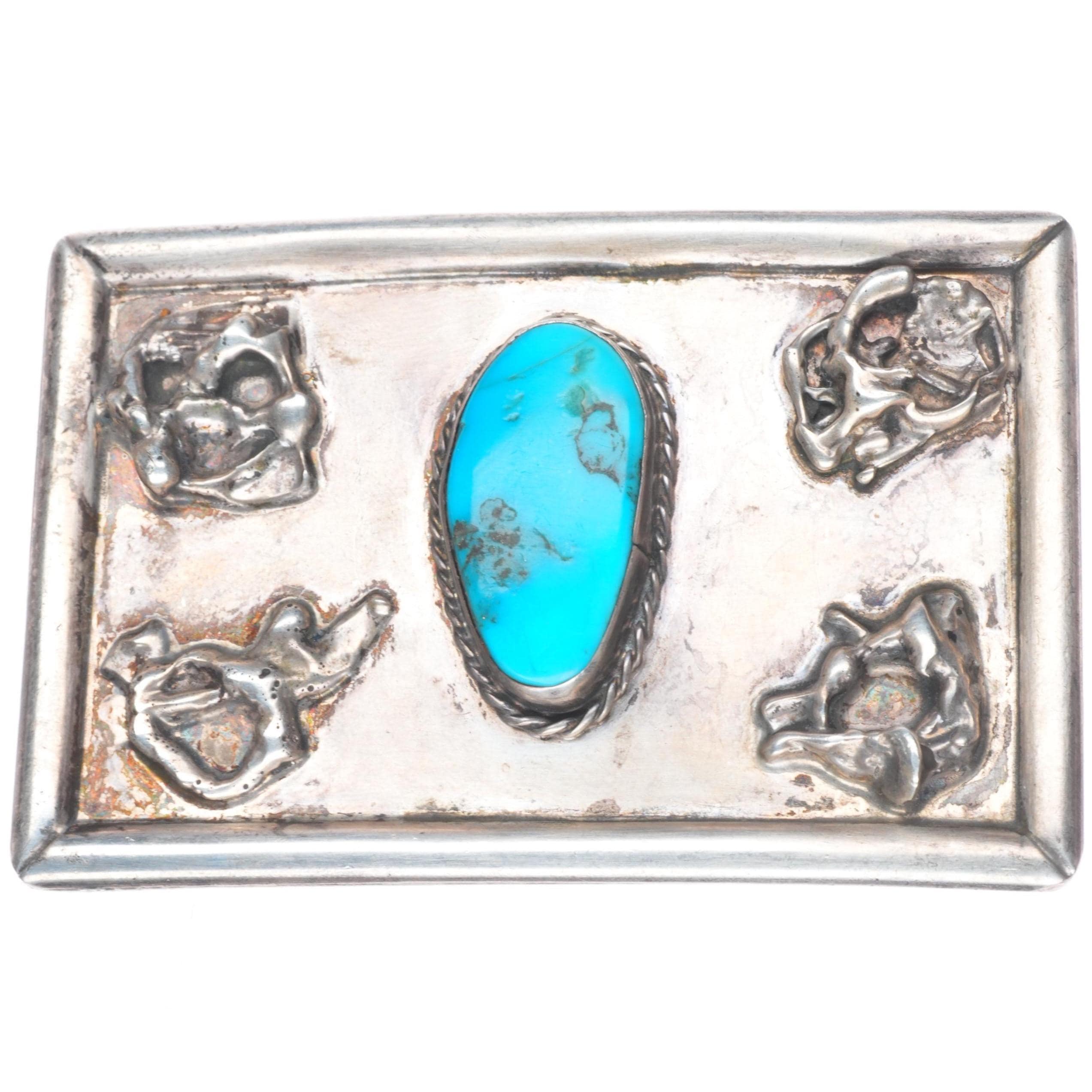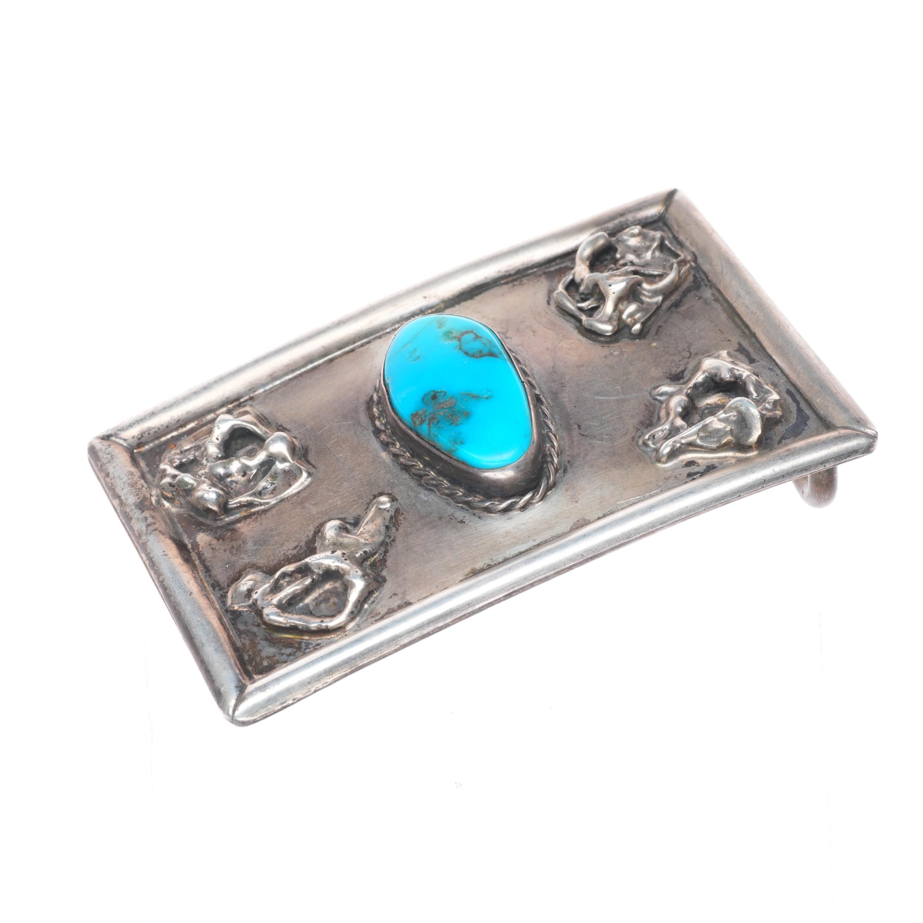Vintage Navajo sterling silver turquoise belt buckle with brutalist accents. Tested and guaranteed solid sterling silver, weight and measurements in pictures. Fully functional. All items will likely have some age appropriate/expected wear, the older they are the more wear they should have. Circa third quarter of the 20th century.. Fits up to a 1.5" belt