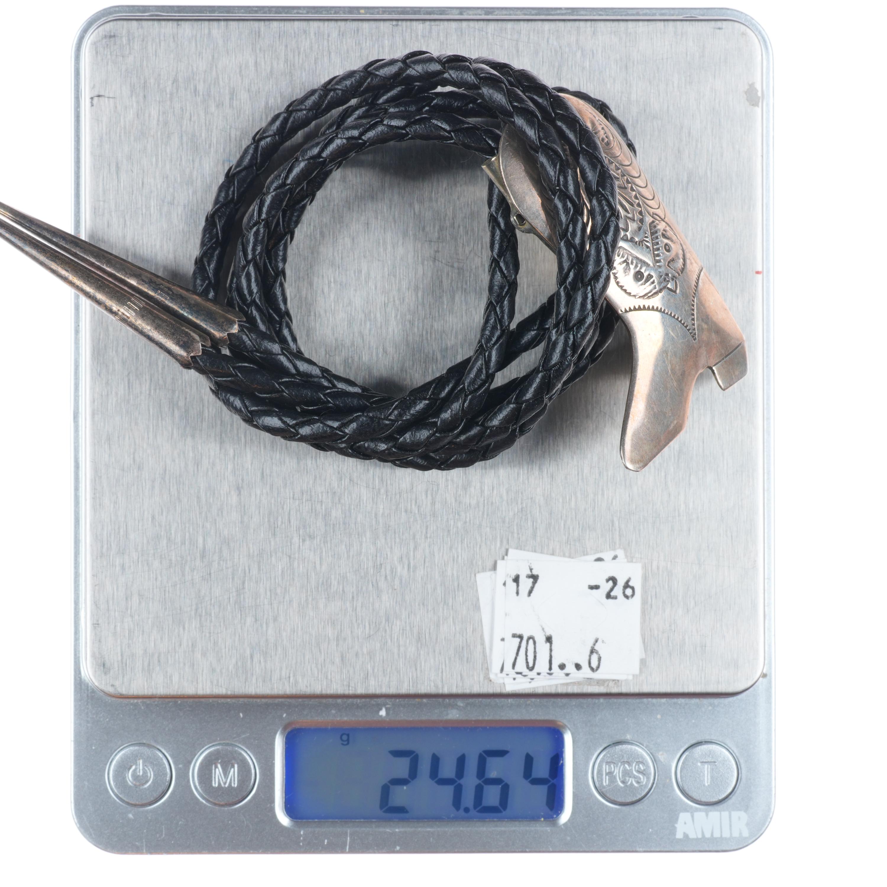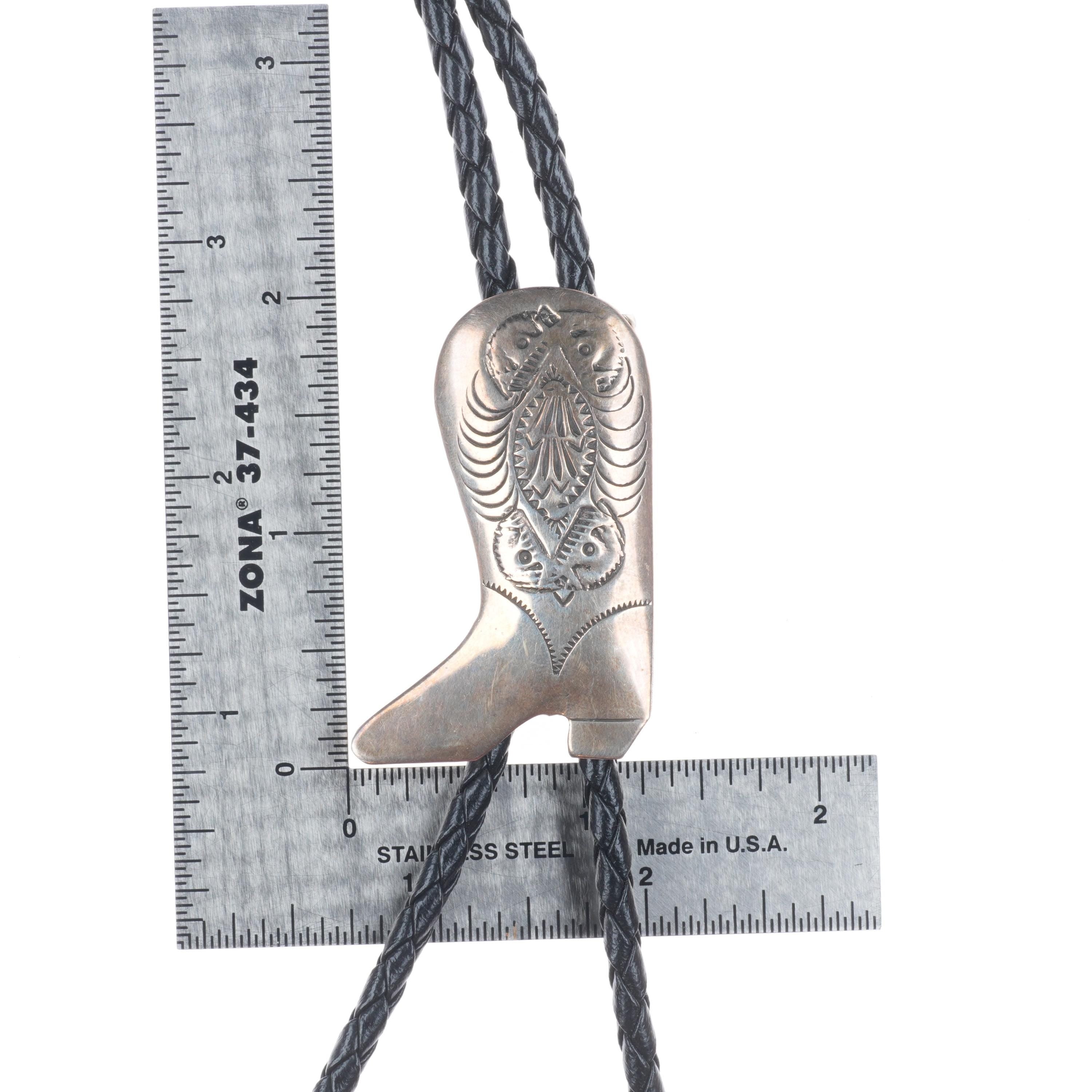 Vintage Southwestern sterling silver cowboy boot form bolo tie.   Tested and guaranteed solid sterling silver slide and tips. Weight and measurements in pictures. Great bolo, 37" long with no issues. Weight shown is the entire bolo.