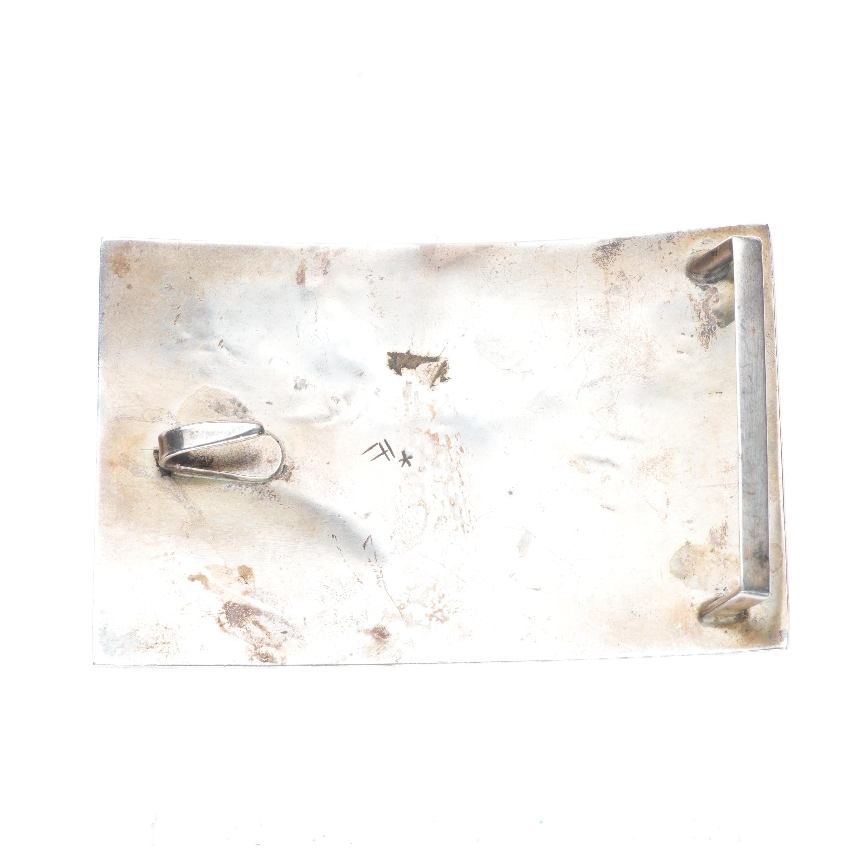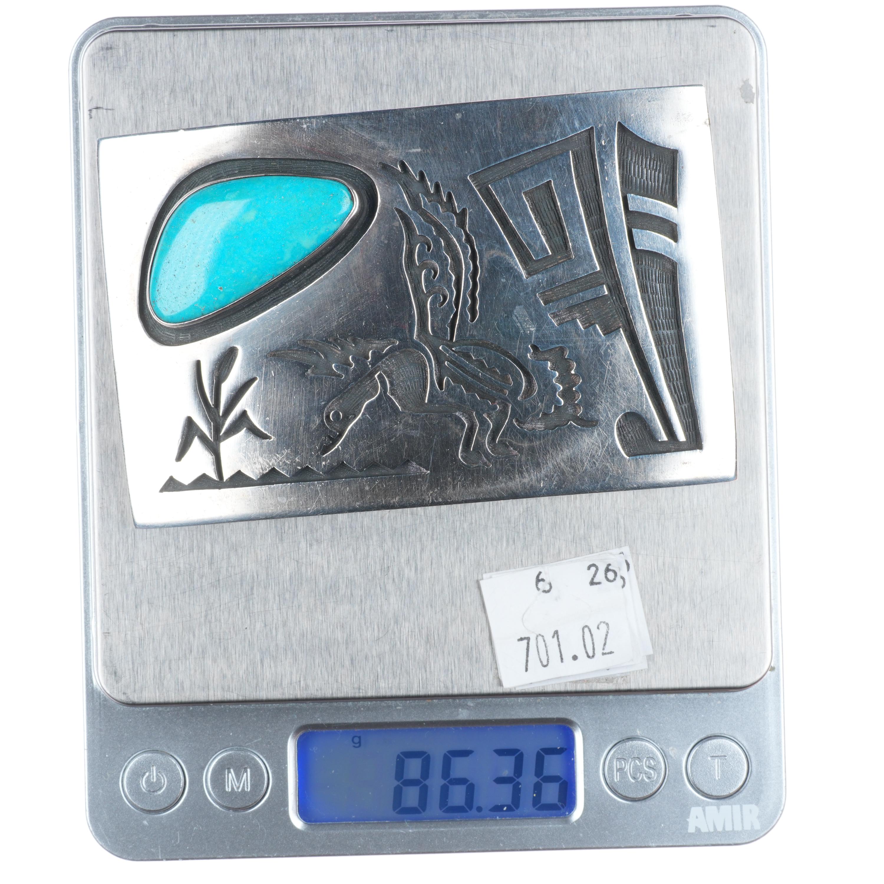 Virgil Thomas Hopi overlay turquoise sterling silver duck/corn belt buckle. Tested and guaranteed solid sterling silver with weight and measurements in pictures. Fully functional. All items will likely have some age appropriate/expected wear, the older they are the more wear they should have. Circa last quarter of the 20th century.. Fits up to a 1.5" belt.