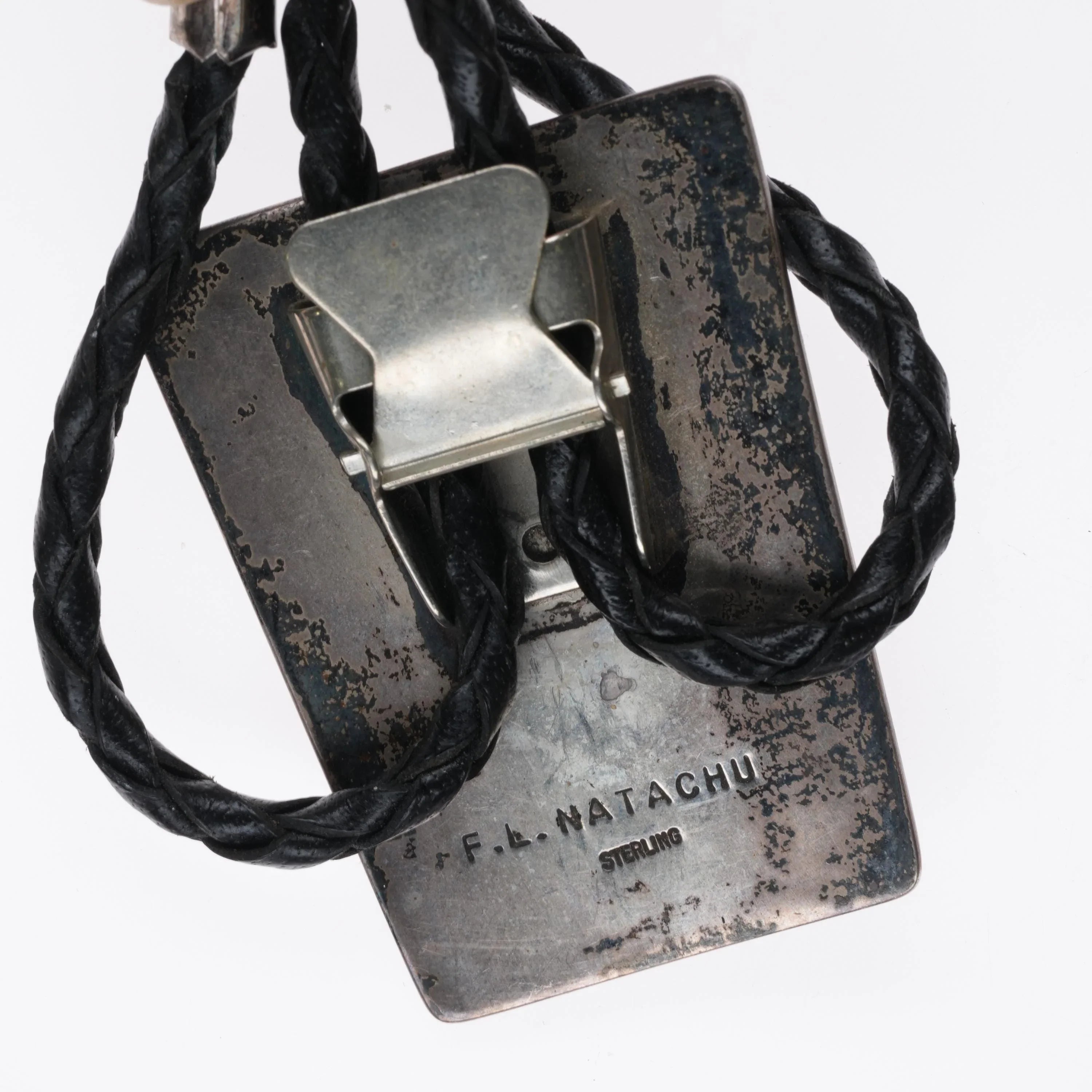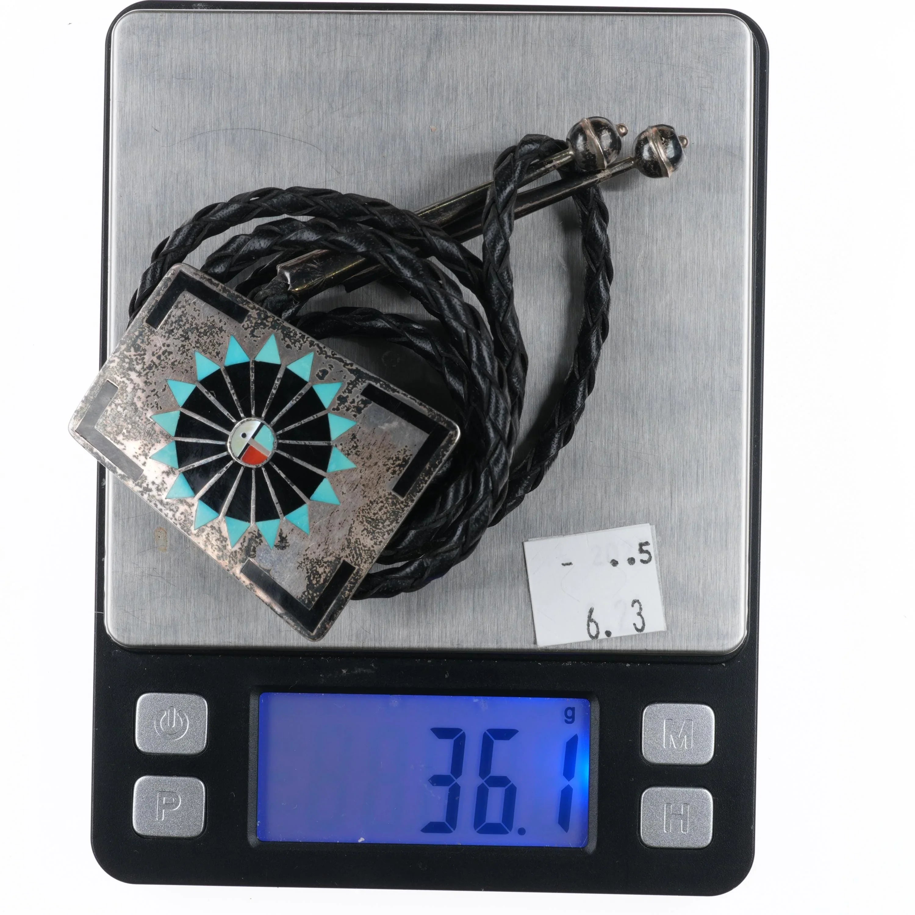 1970‘s Fred and Lolita Natachu Zuni sterling silver inlaid sunface bolo tie. Solid sterling silver slide (tested), slide and tips. Weight and measurements in pictures. Great bolo with no issues. 39" long. Signed by the Artists.