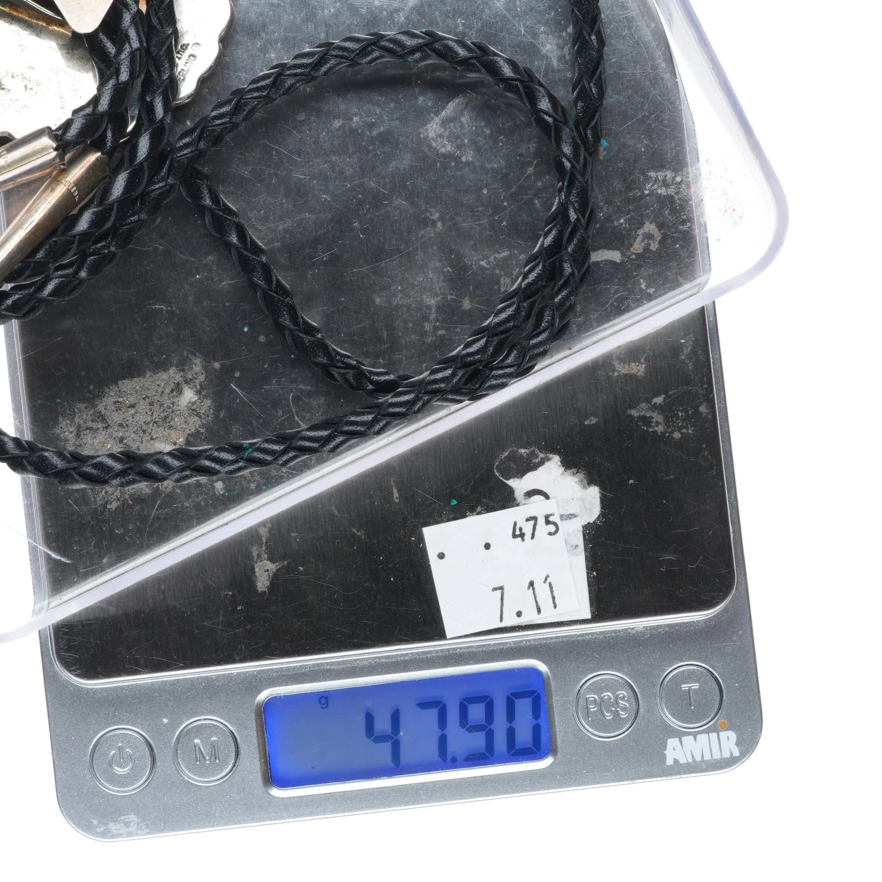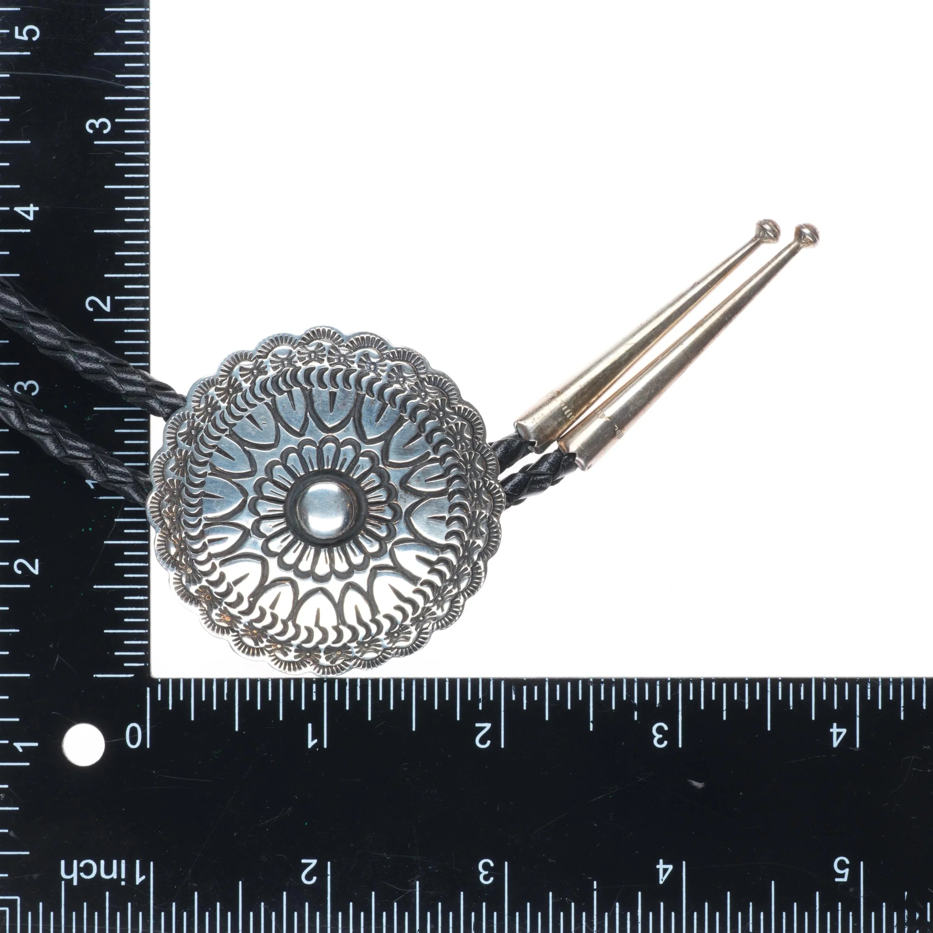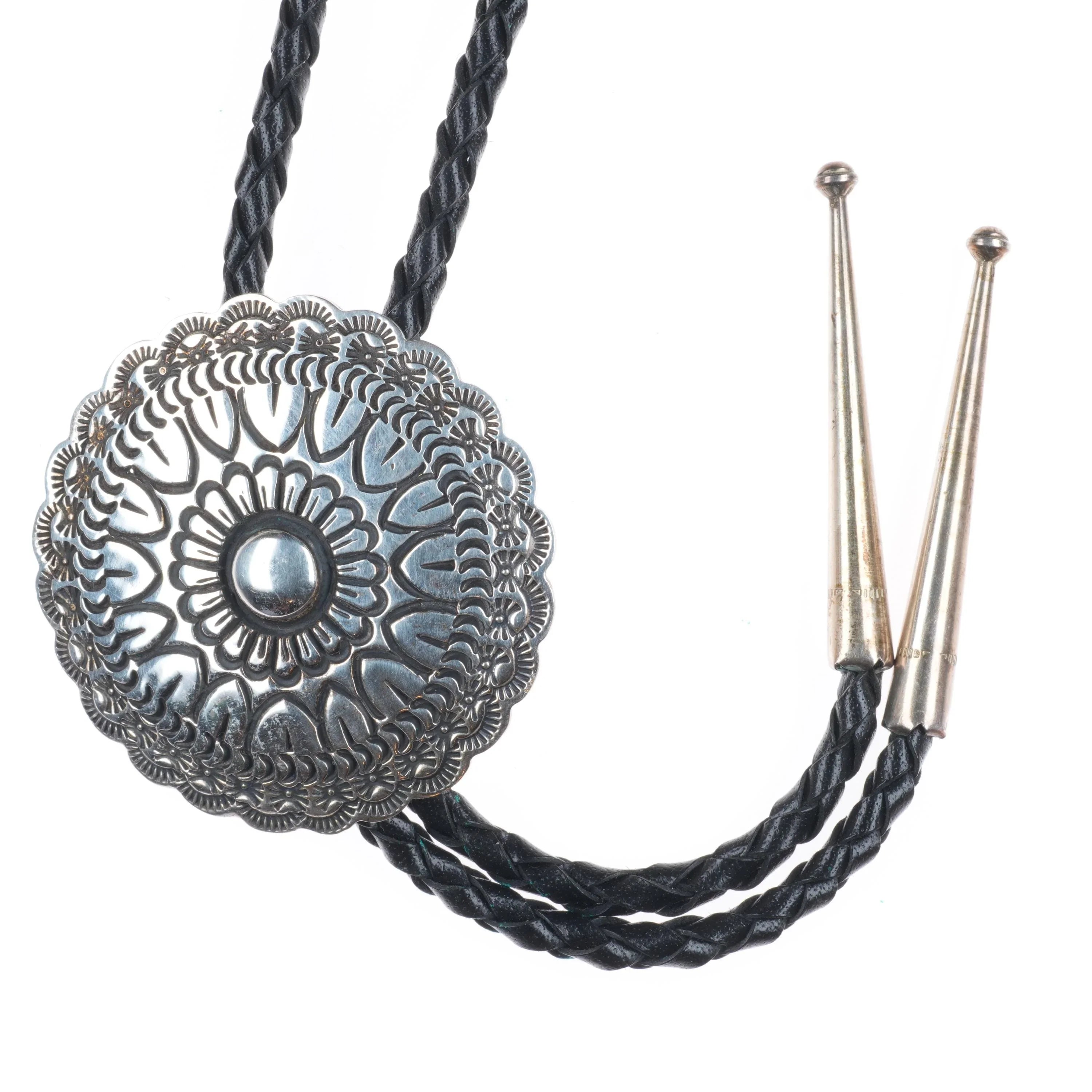 1991 Navajo sterling silver Golden Eagle trading company bolo concho bolo tie. Tested and guaranteed solid sterling silver slide and tips. Weight and measurements in pictures. Great bolo, 39" long with no issues. Tray is tared out, so weight shown is just the bolo of course. Illegibly signed.