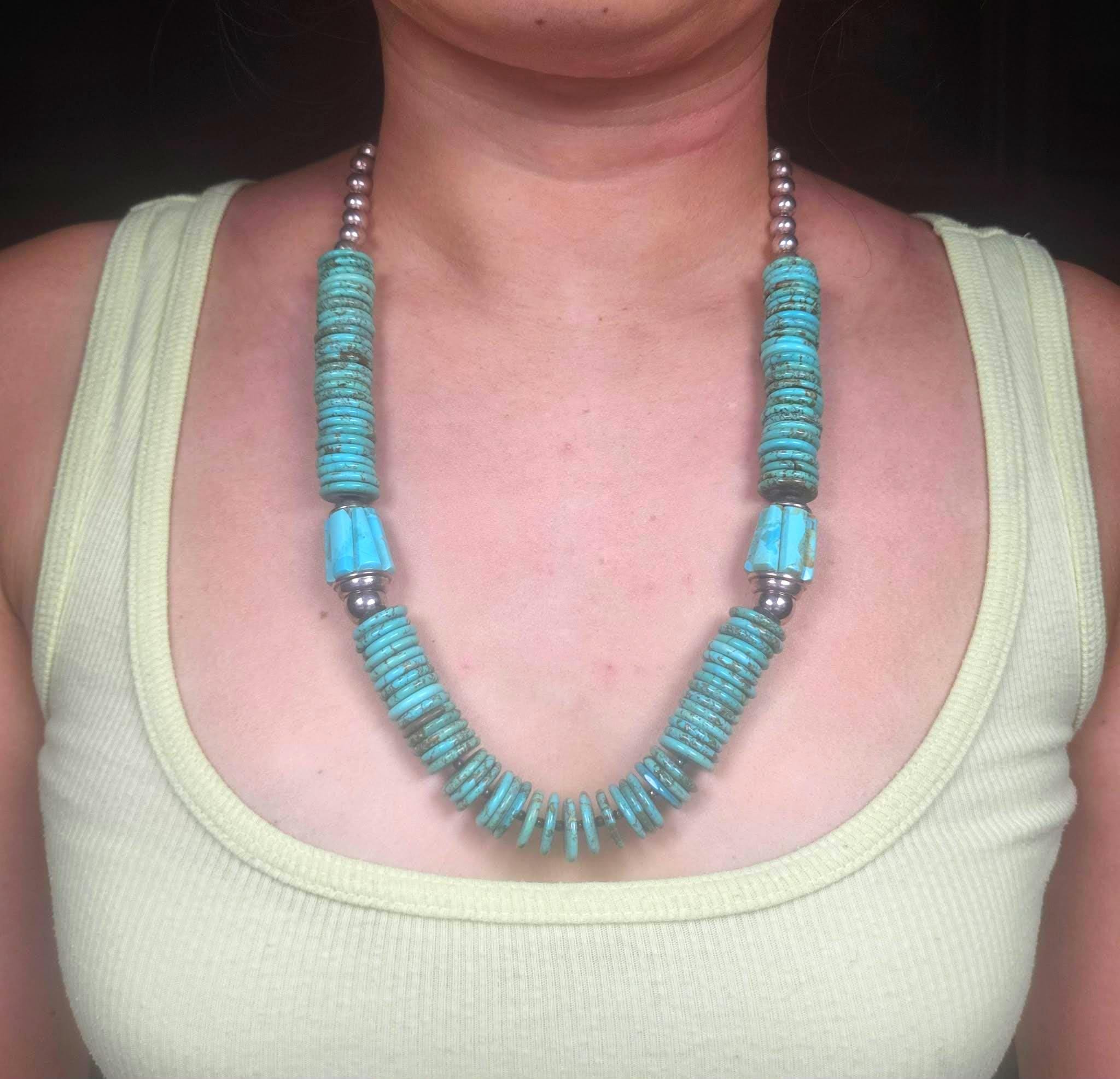 23.5" Southwestern/Native American sterling silver turquoise beaded necklace. No issues, circa fourth quarter of the 20th century. 23.5" long necklace with other measurements in pictures. No issues. Selling the necklace shown in the pics. Likely Native American made with no artists markings.