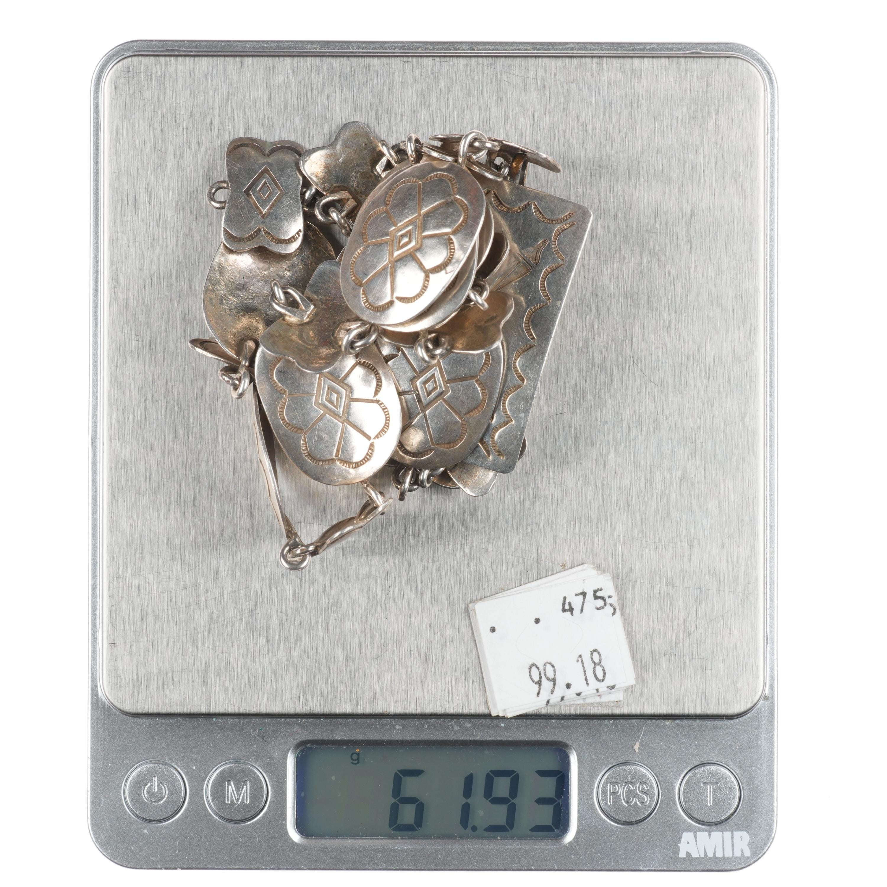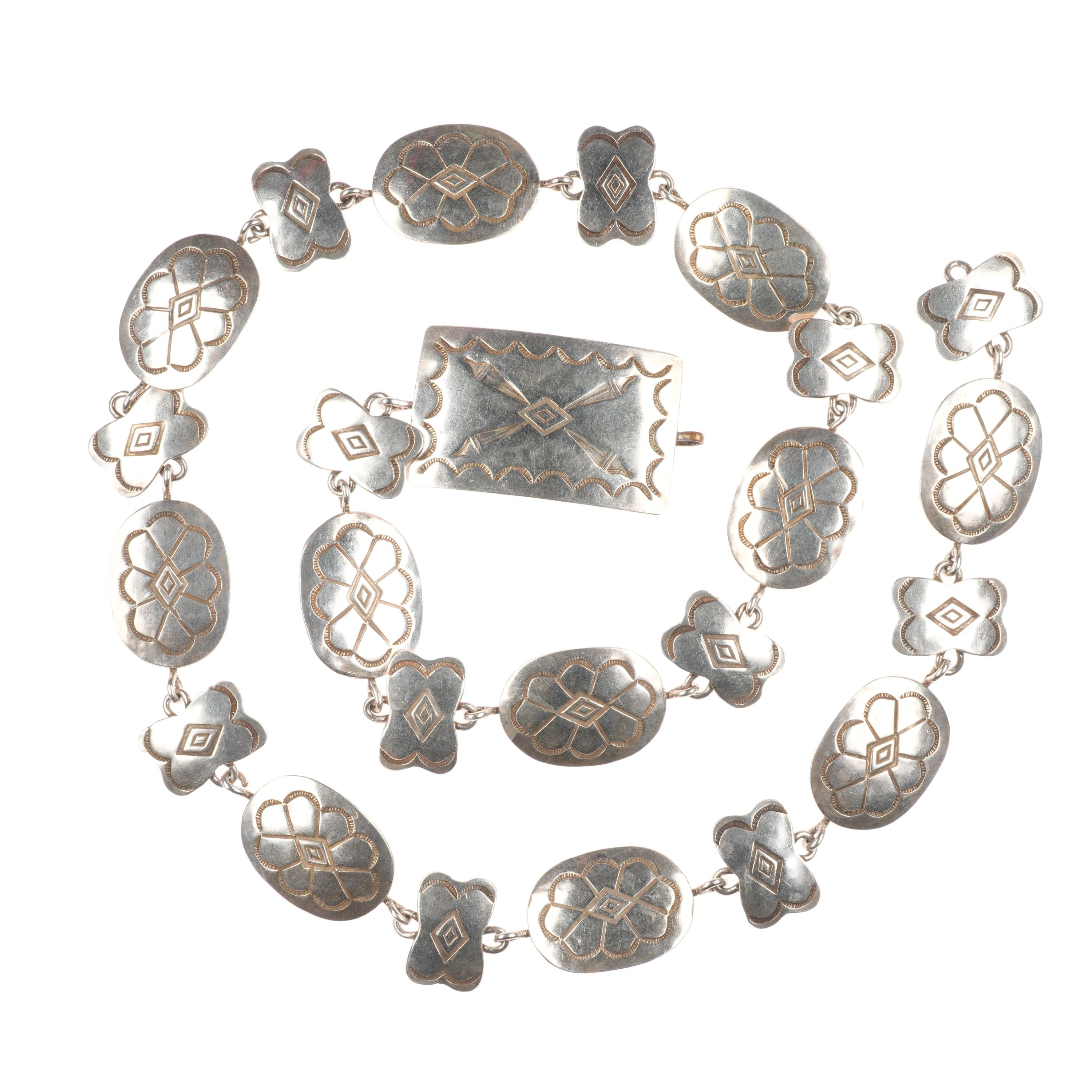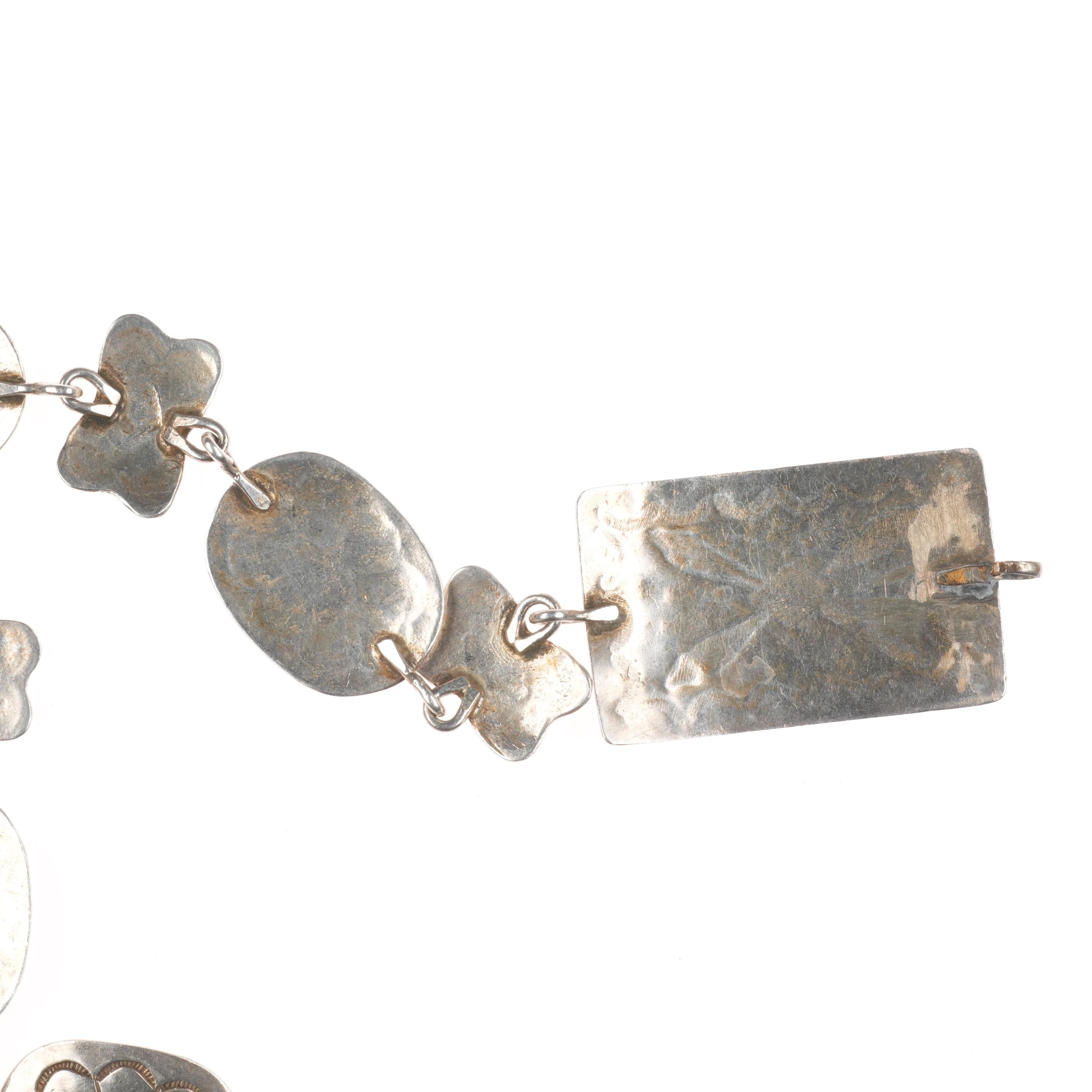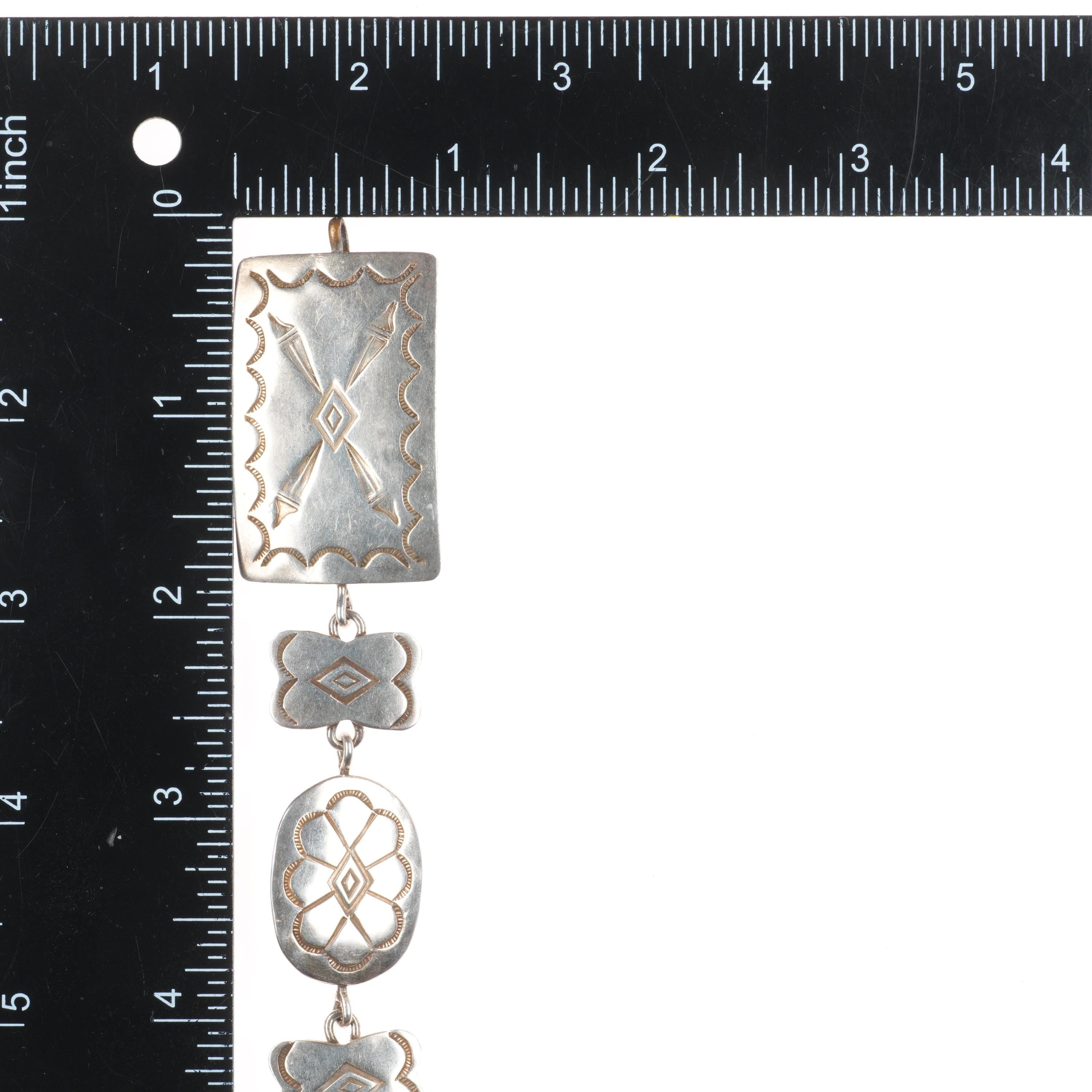 24.5" c1950‘s Navajo sterling silver link concho belt hatband stamped design. Fits up to a 24.5" hat, but can be linked shorter, fully functional with age appropriate wear. Please look at pictures. Tested and guaranteed solid sterling silver. Circa mid 20th century.