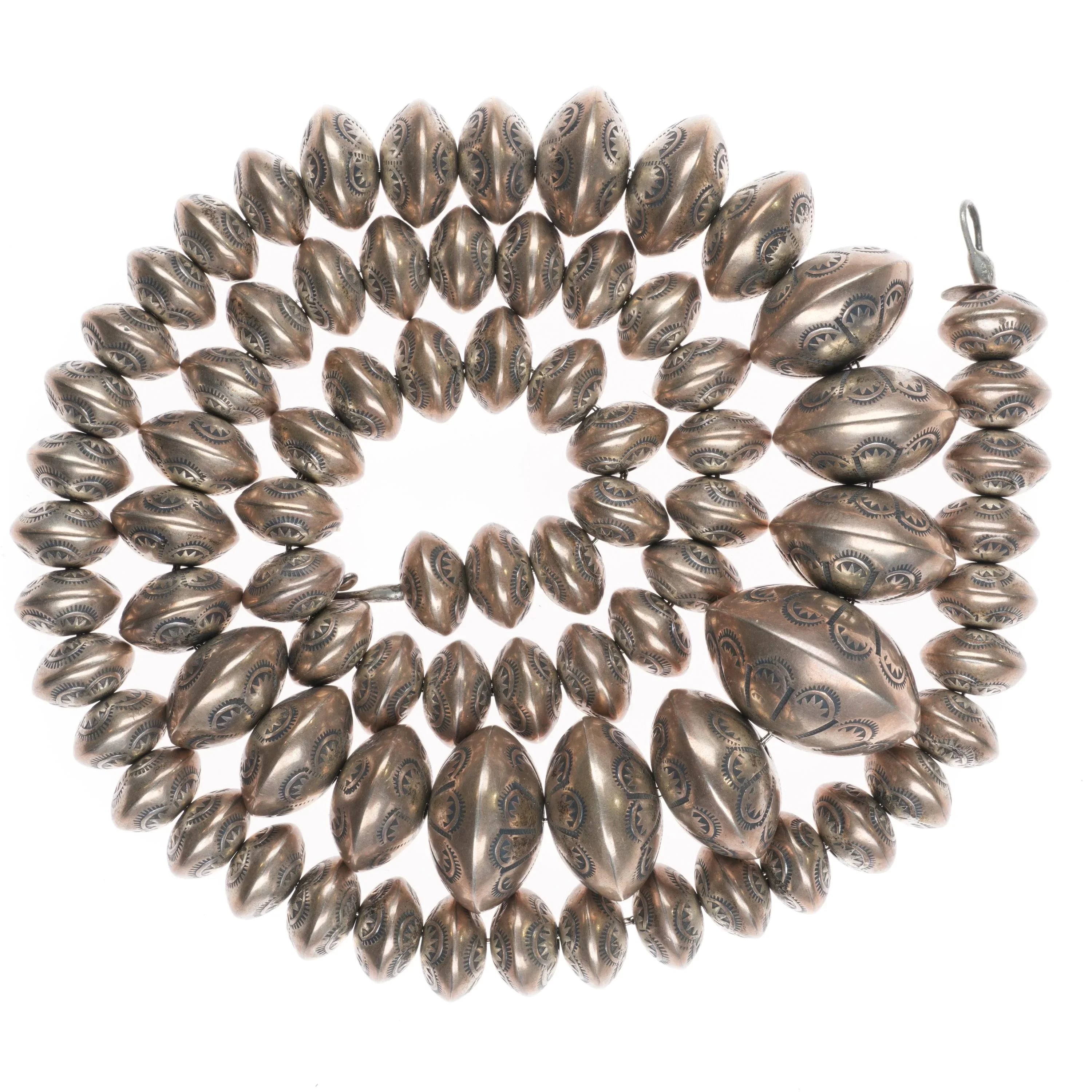 27" Leo Yazzie Navajo pearls necklace Hand stamped Sterling silver beaded. No damage or issues, Buying the Necklace shown with no damage, circa last quarter of the 20th century. Largest bead approx 1 1/8" wide. Measures 27" end to end, because of the width of the beads it doesn‘t wear like a 27" necklace of course.