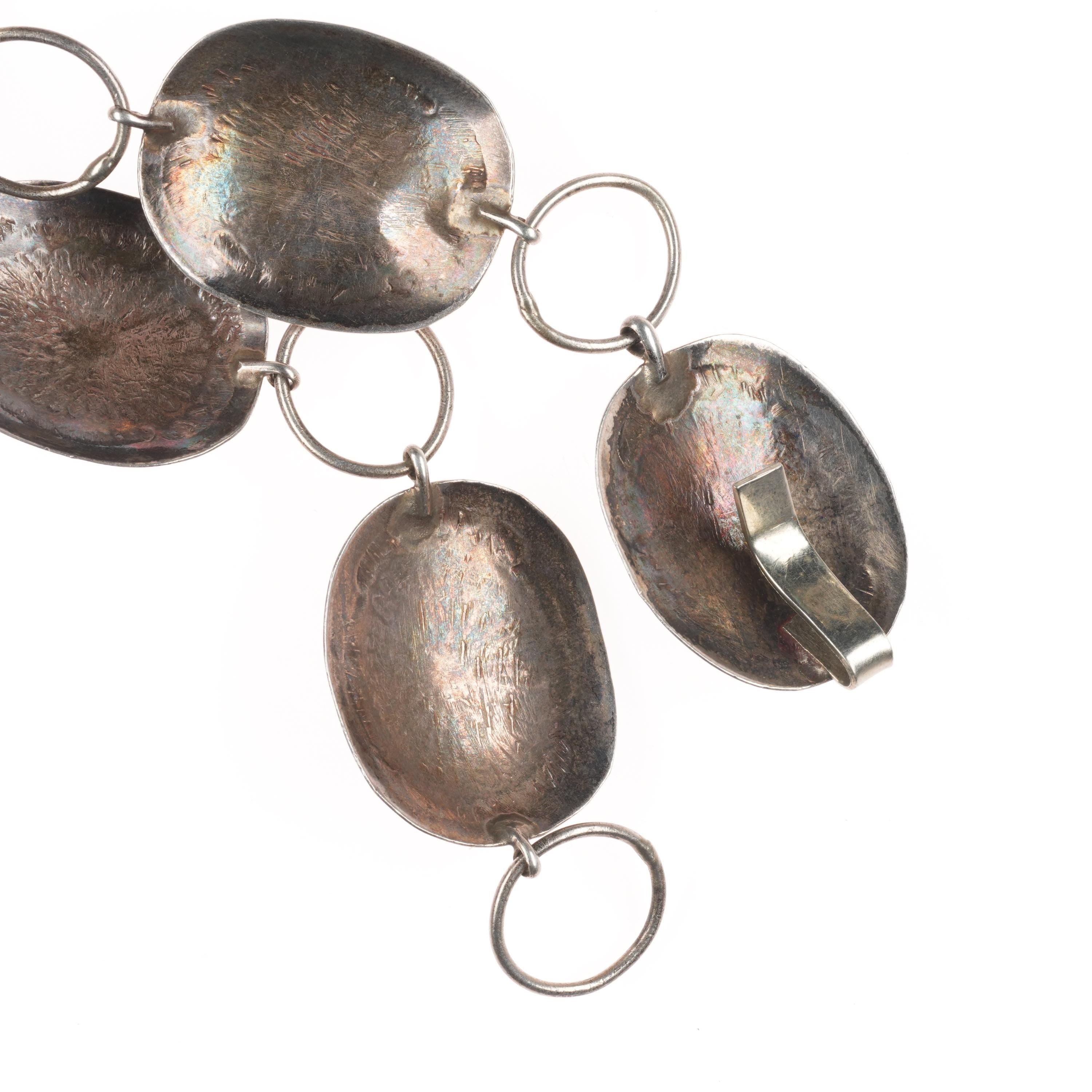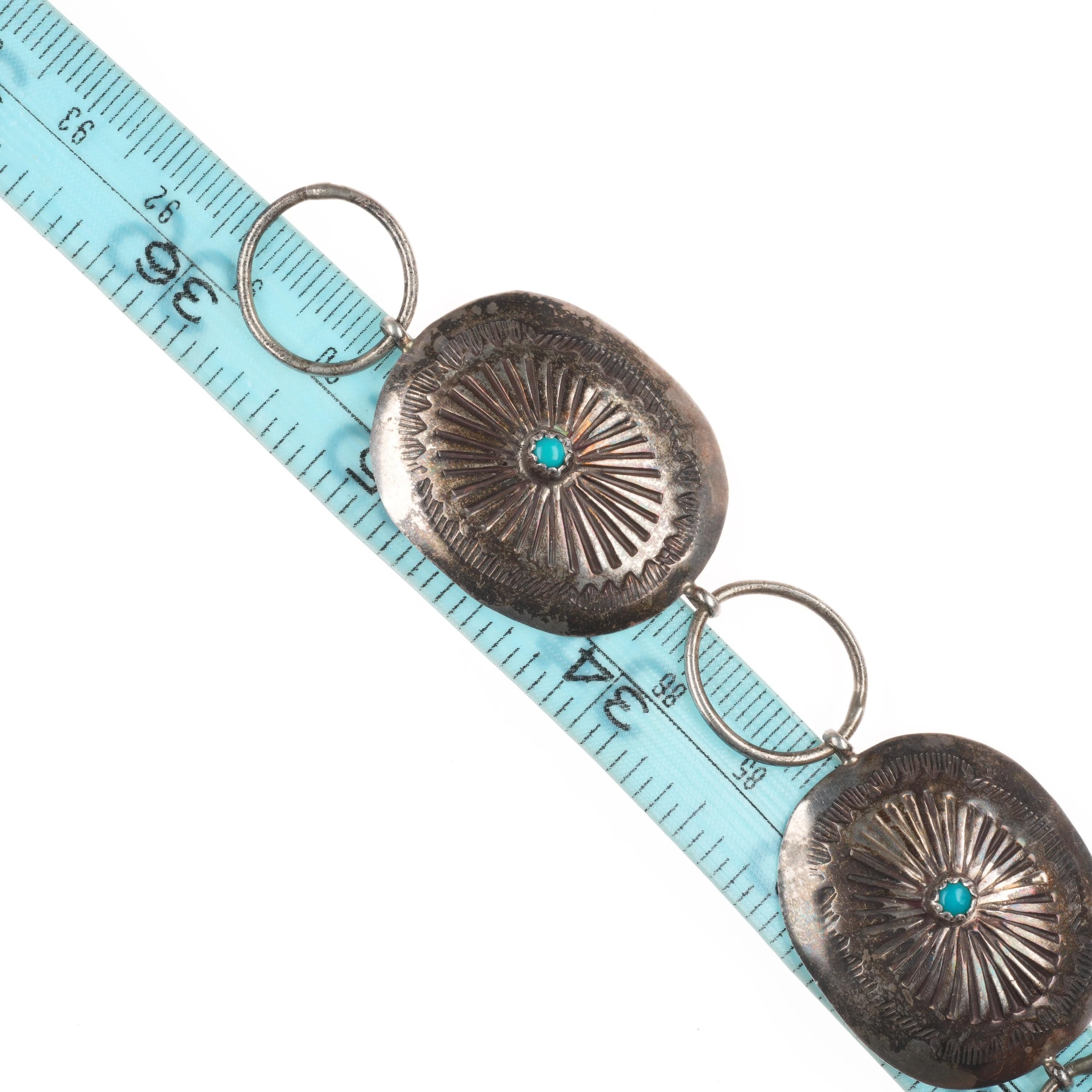 36" c1950‘s-60‘s Navajo sterling silver link concho belt/ hatband w/turquoise. Fits up to a 36" waist, but can be linked shorter, fully functional with age appropriate wear. Please look at pictures. Tested and guaranteed solid sterling silver. Circa third quarter of the 20th century.