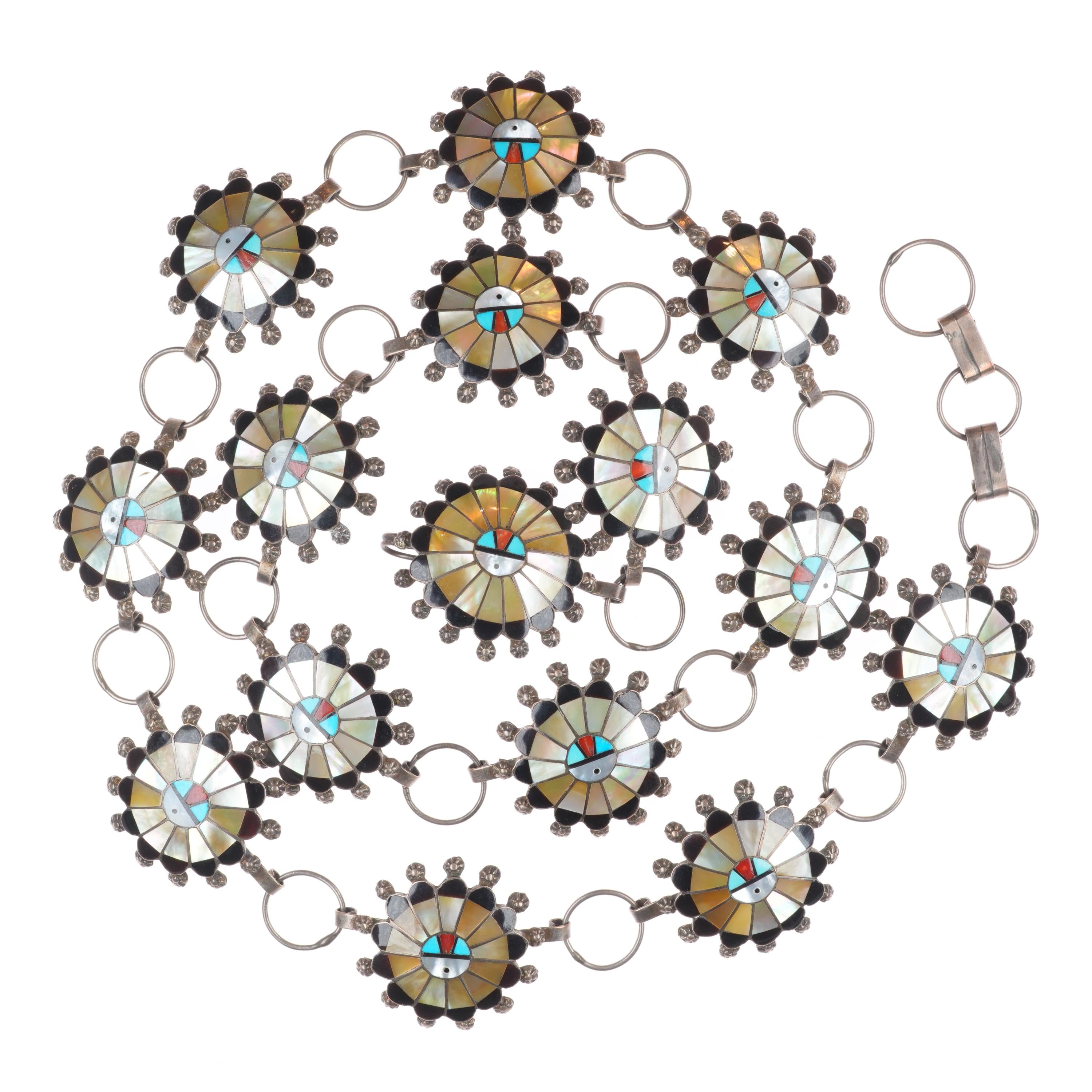 38" Abel Soseeah Zuni sterling silver, turquoise, coral, shell link concho belt