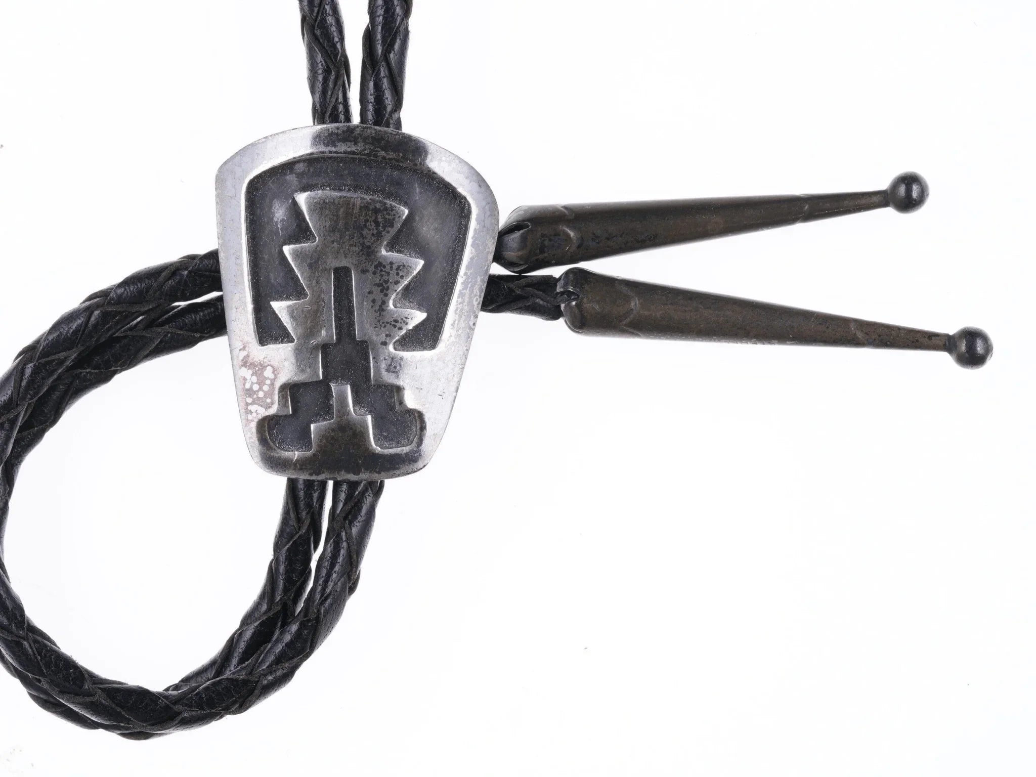 40's-50's Navajo Silver overlay style bolo tie with turquoise 39" long, 1.25"<br>tall x 1 1/16" wide bolo slide. 17.7 grams total weight. I have another bolo<br>I'll be offering from the same estate obviously made by the same hand. One has<br>turquoise, the other doesn't.<br><br>All precious metals are tested and guaranteed, any Native American jewelry<br>referred to as Silver or Sterling is guaranteed to be a minimum of 90% (coin)<br>silver and possibly higher content. Anything marked is guaranteed to be what<br>it's marked, most bracelets are photographed on a 6" wrist, rings photographed<br>on the appropriate sized finger when possible. With bracelets if the measurement<br>is not given in the description then inside circumference is shown where the<br>metal meets the number on the the cloth tape measure.