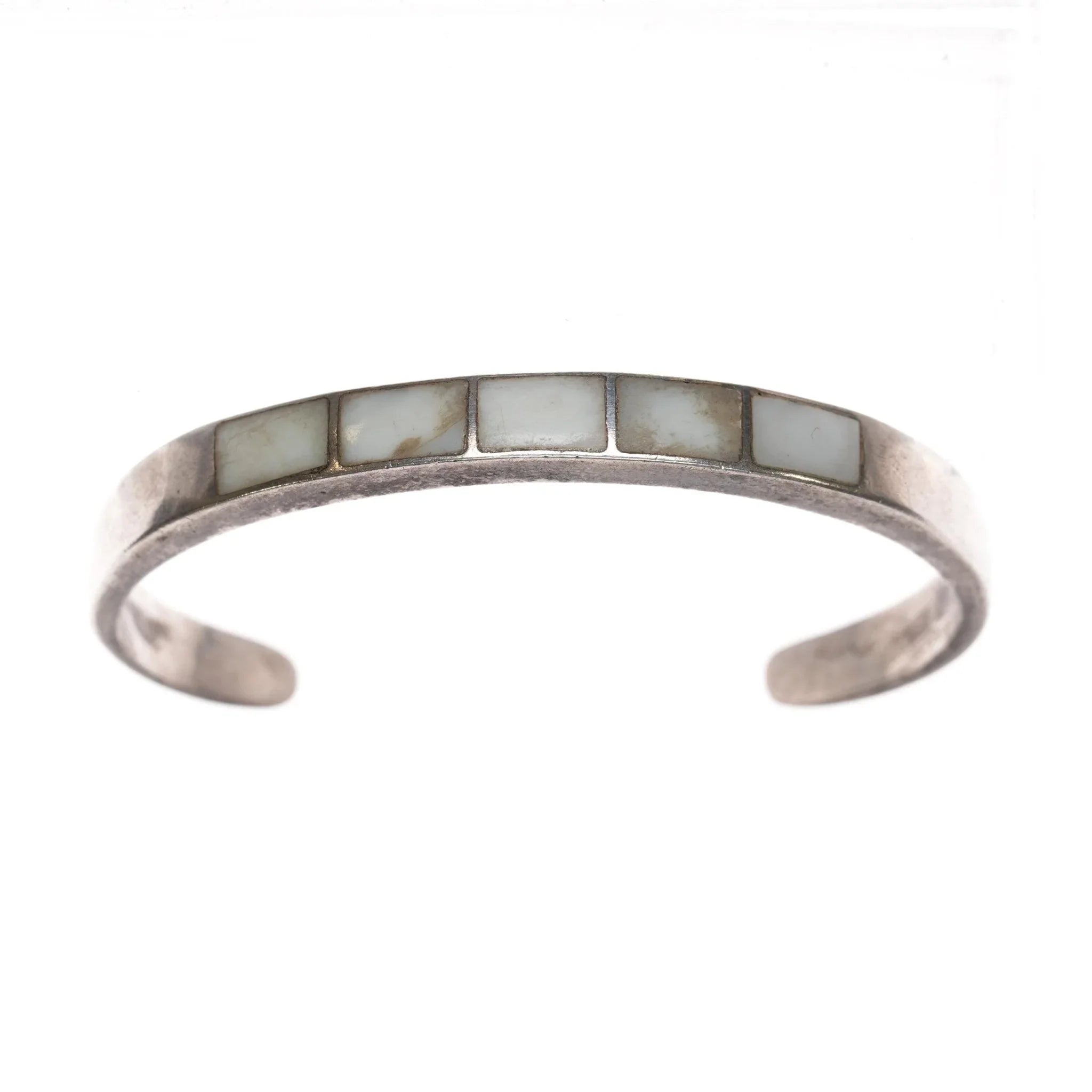 5.75" Vintage Zuni sterling and shell channel inlay cuff bracelet, weight and measurements in pics.