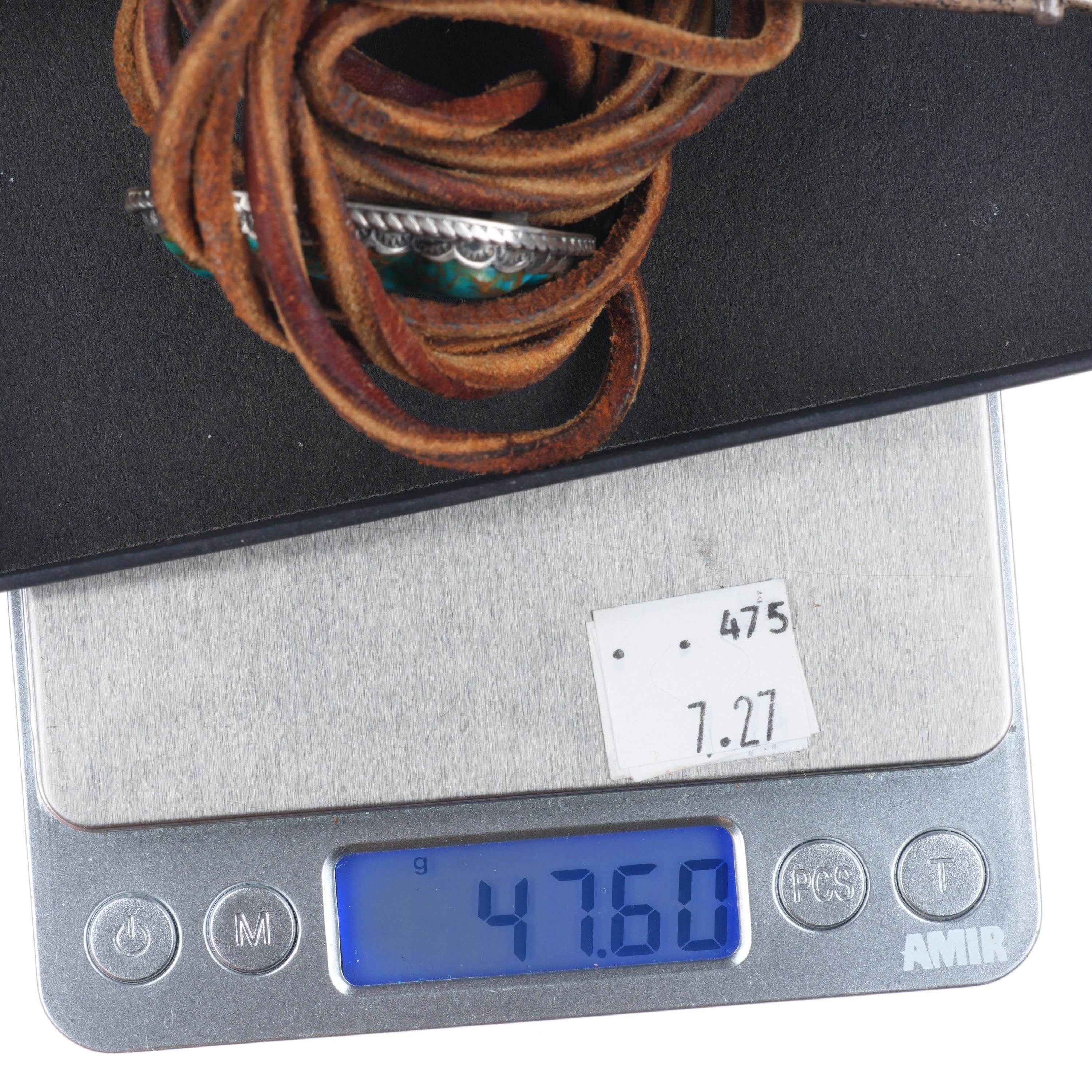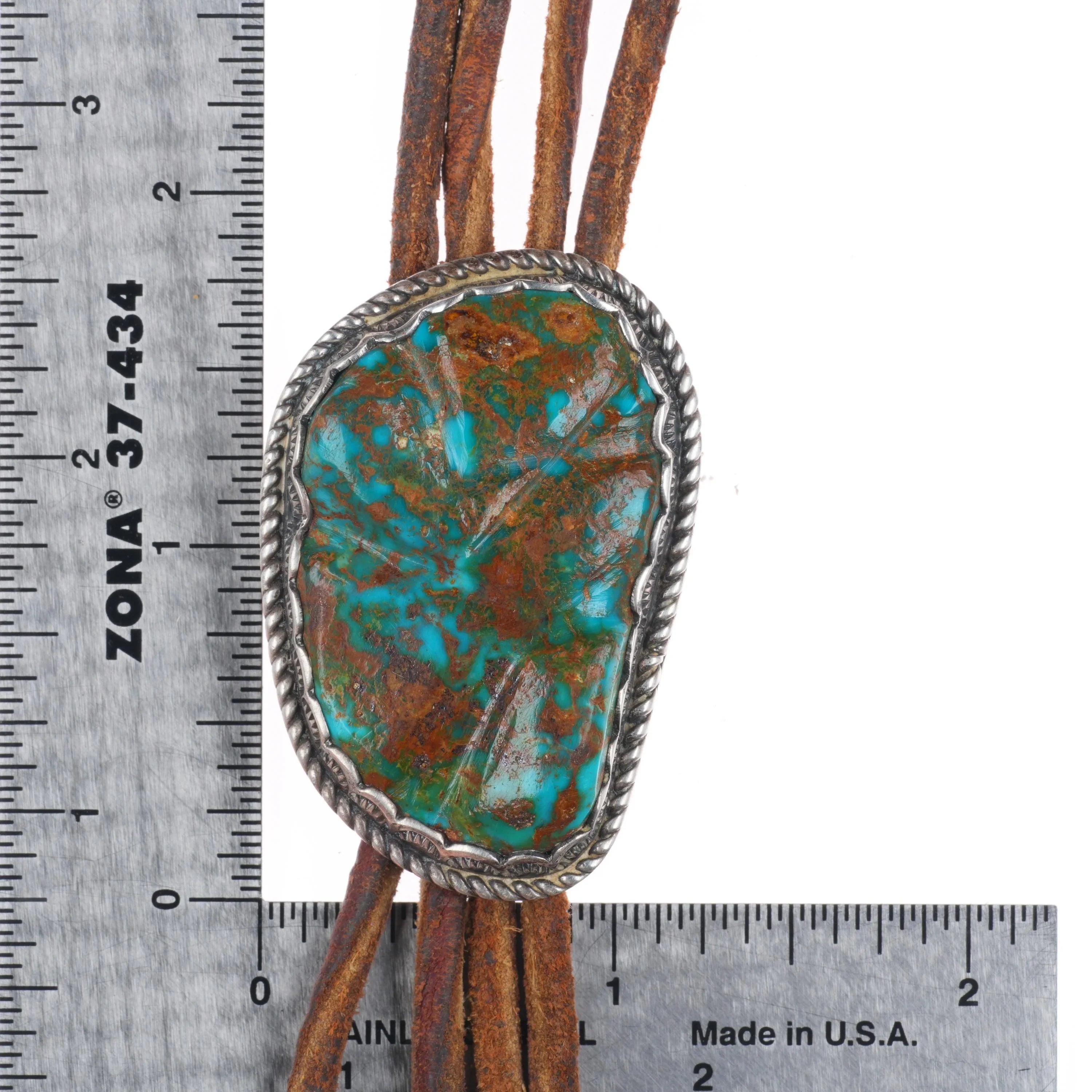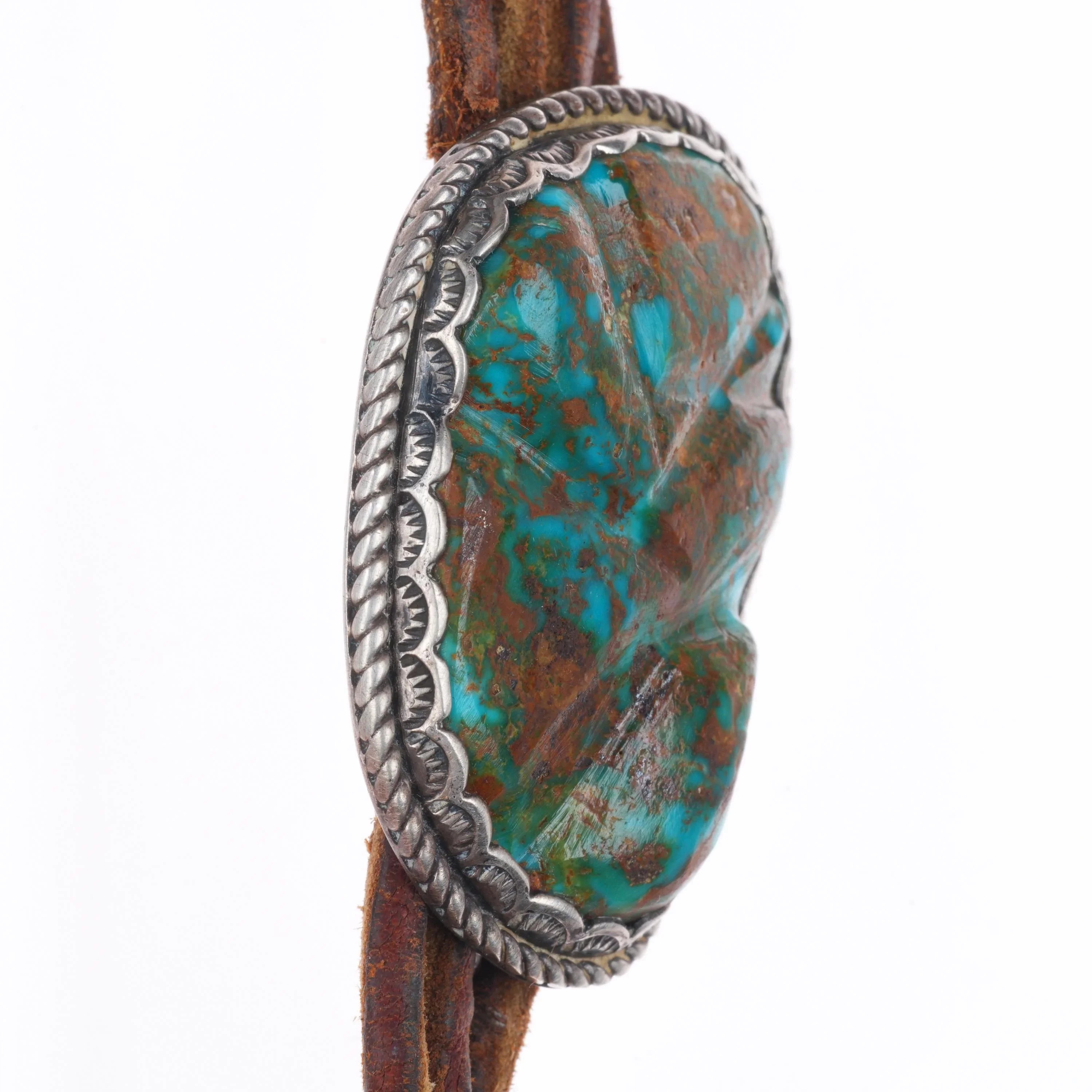 50‘s-60‘s Navajo sterling silver Zuni carved Pilot Mountain turquoise bolo tie Tested and guaranteed solid sterling silver slide and tips. Weight and measurements in pictures. Great bolo, 41" long with no issues. Tray is tared out, so weight shown is just the bolo of course. Unknown maker, apparently unmarked.