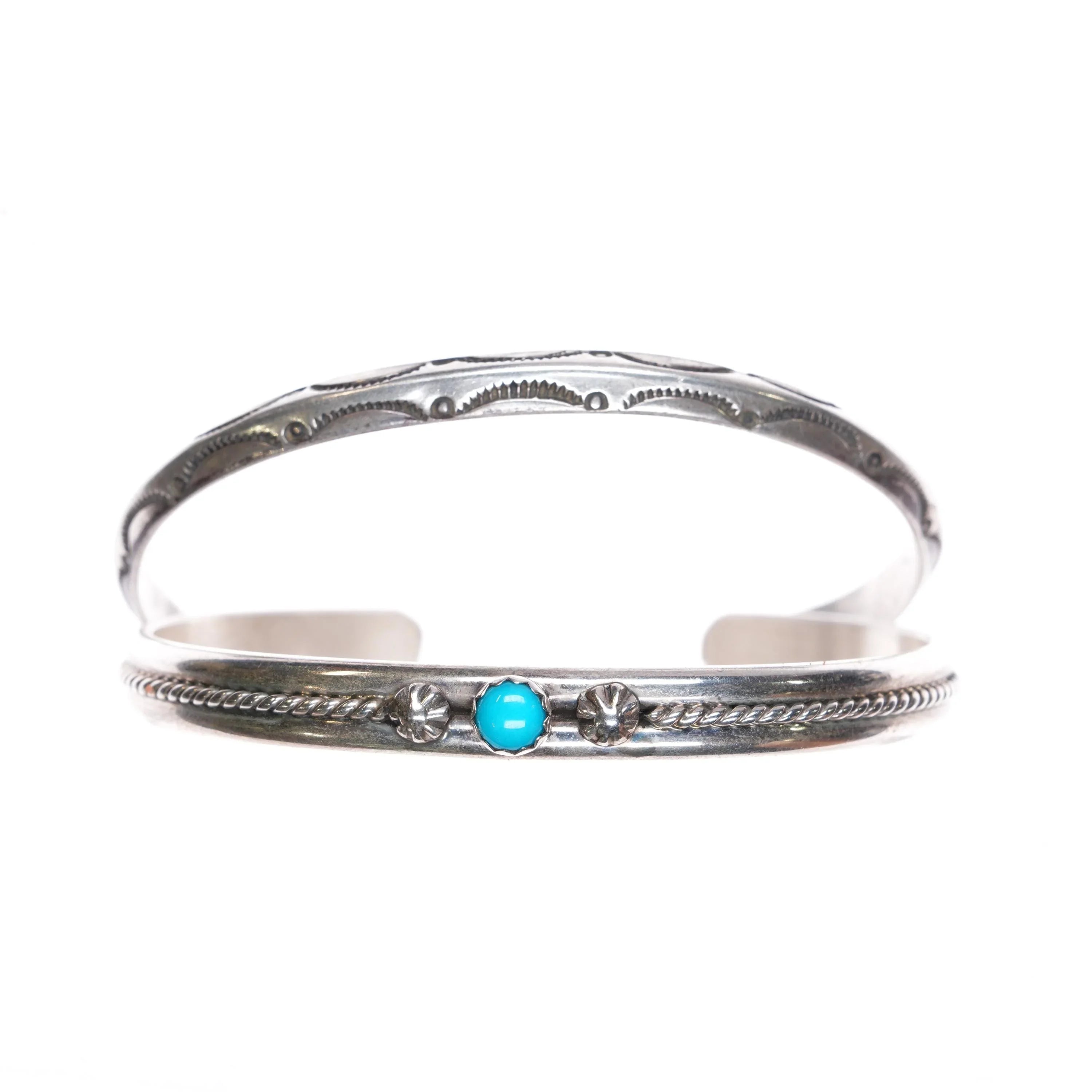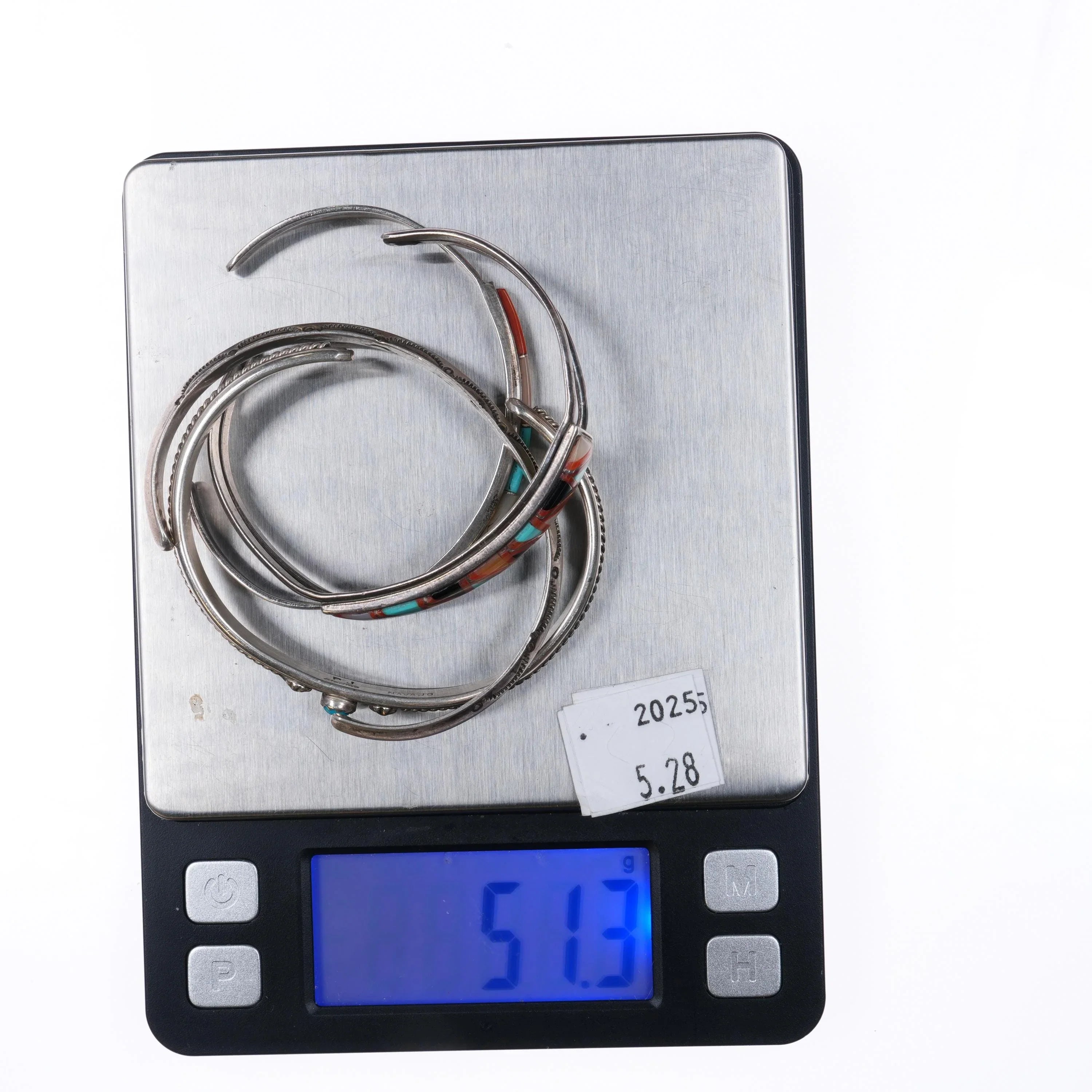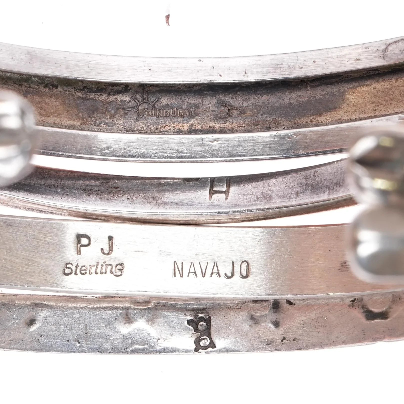 6.25"-6.5" 4 Navajo Carinated/Zuni Inlay sterling silver stacking cuff bracelets. Tested and guaranteed solid sterling silver with markings shown. Weight and measurements in pictures. Some expected wear, no cracks or breaks. All likely from last quarter of the 20th century. Selling all 4 for one price.