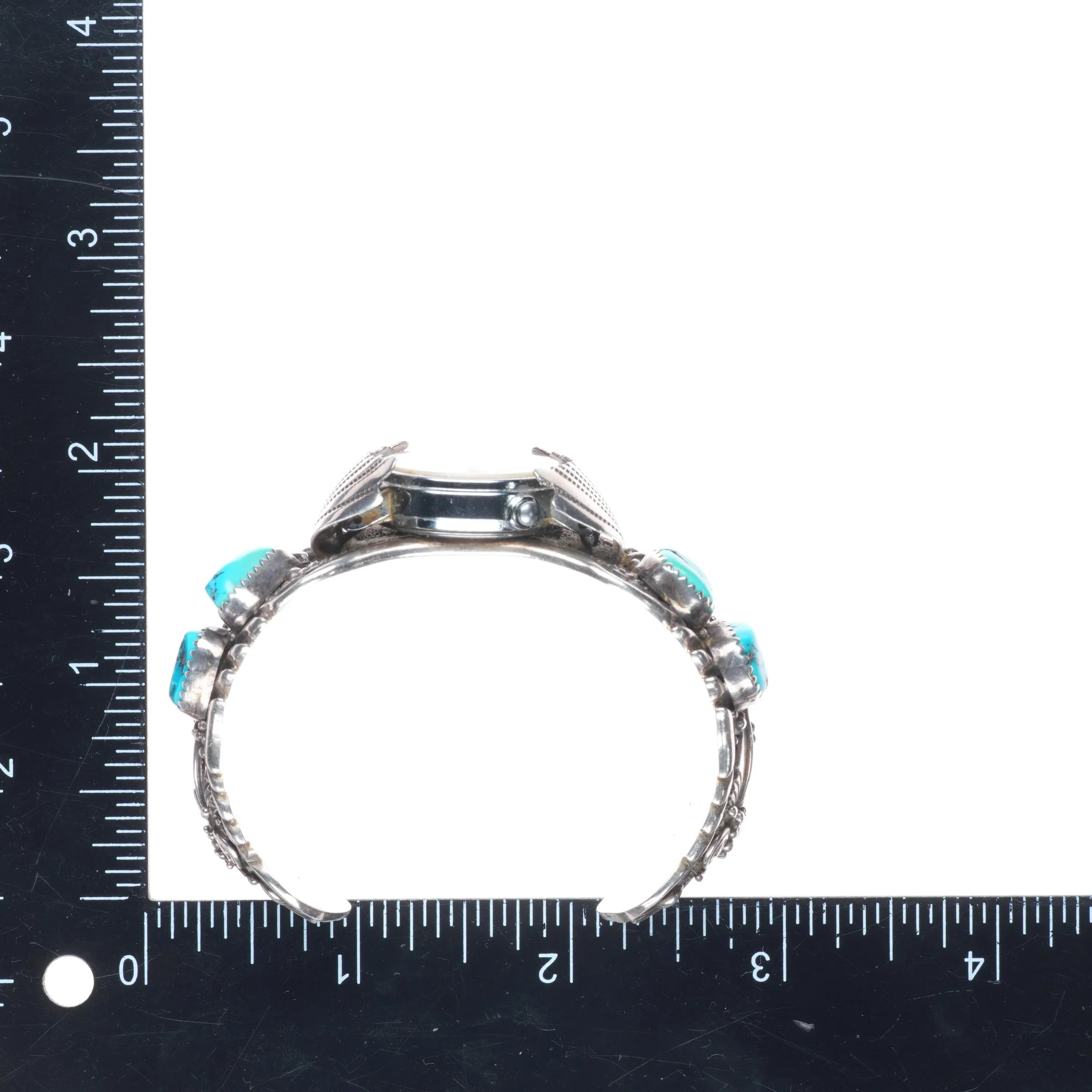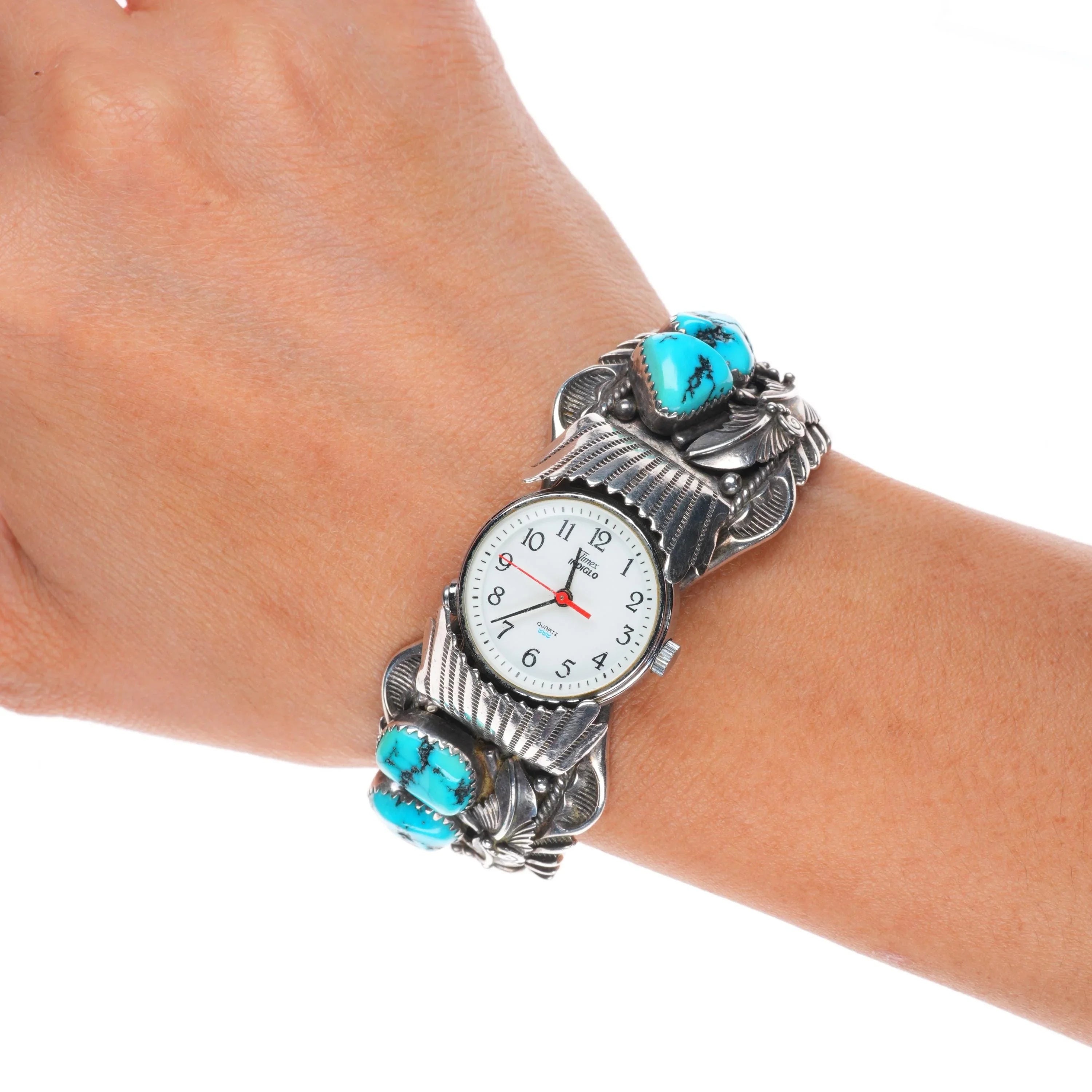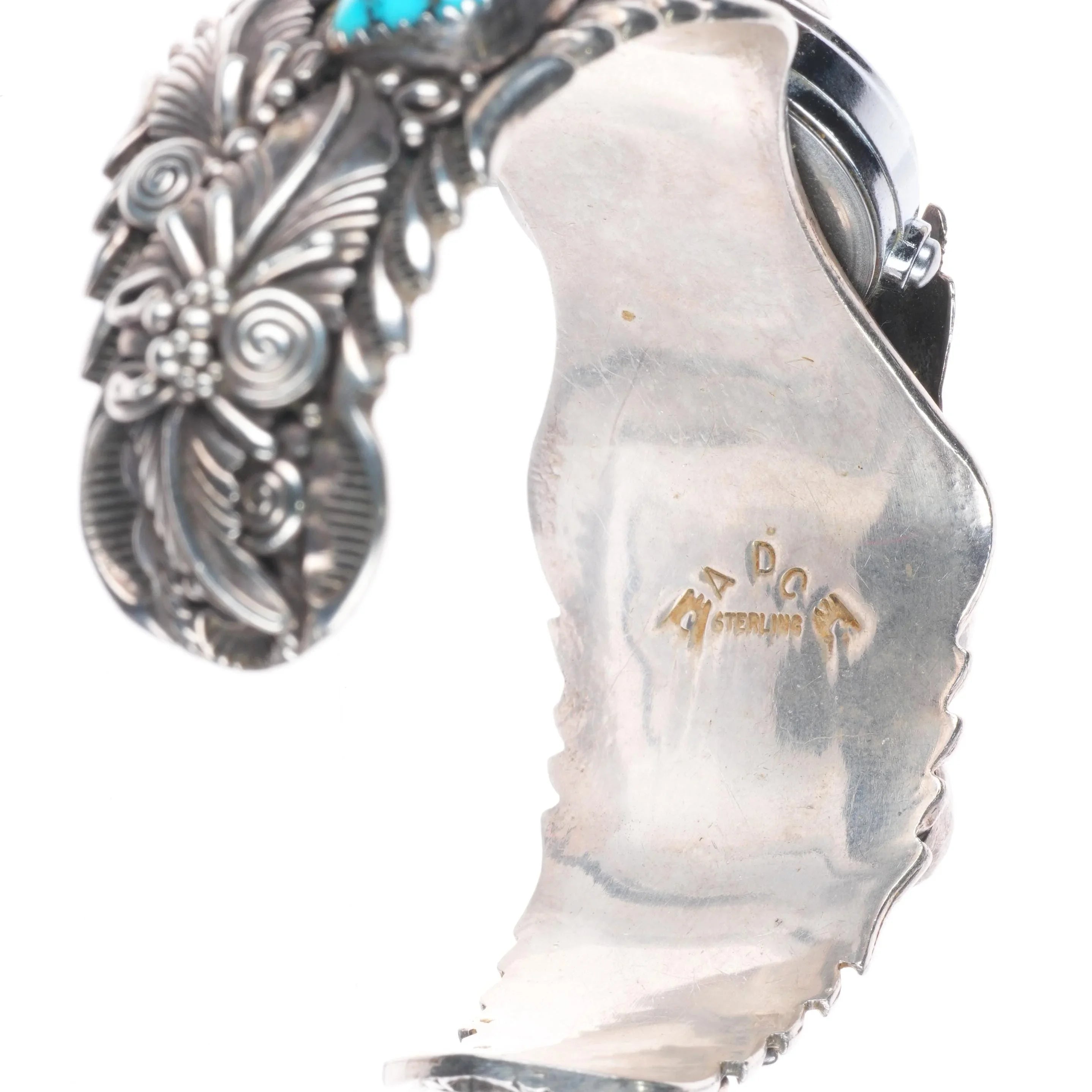 6.25" ADC Navajo high quality sterling silver turquoise watch cuff bracelet. Selling the watch bracelet shown, tested and guaranteed solid sterling silver. Weight and measurements in pictures. Very high quality circa 70‘s-80‘s, unidentified artist. Watch needs a new battery.