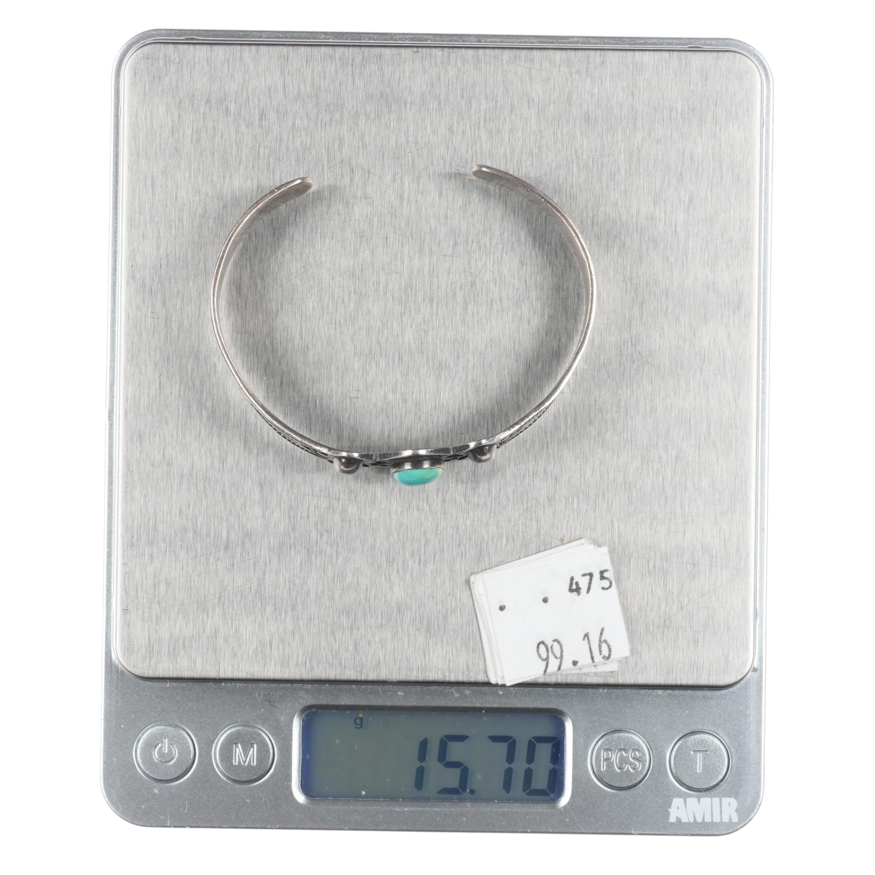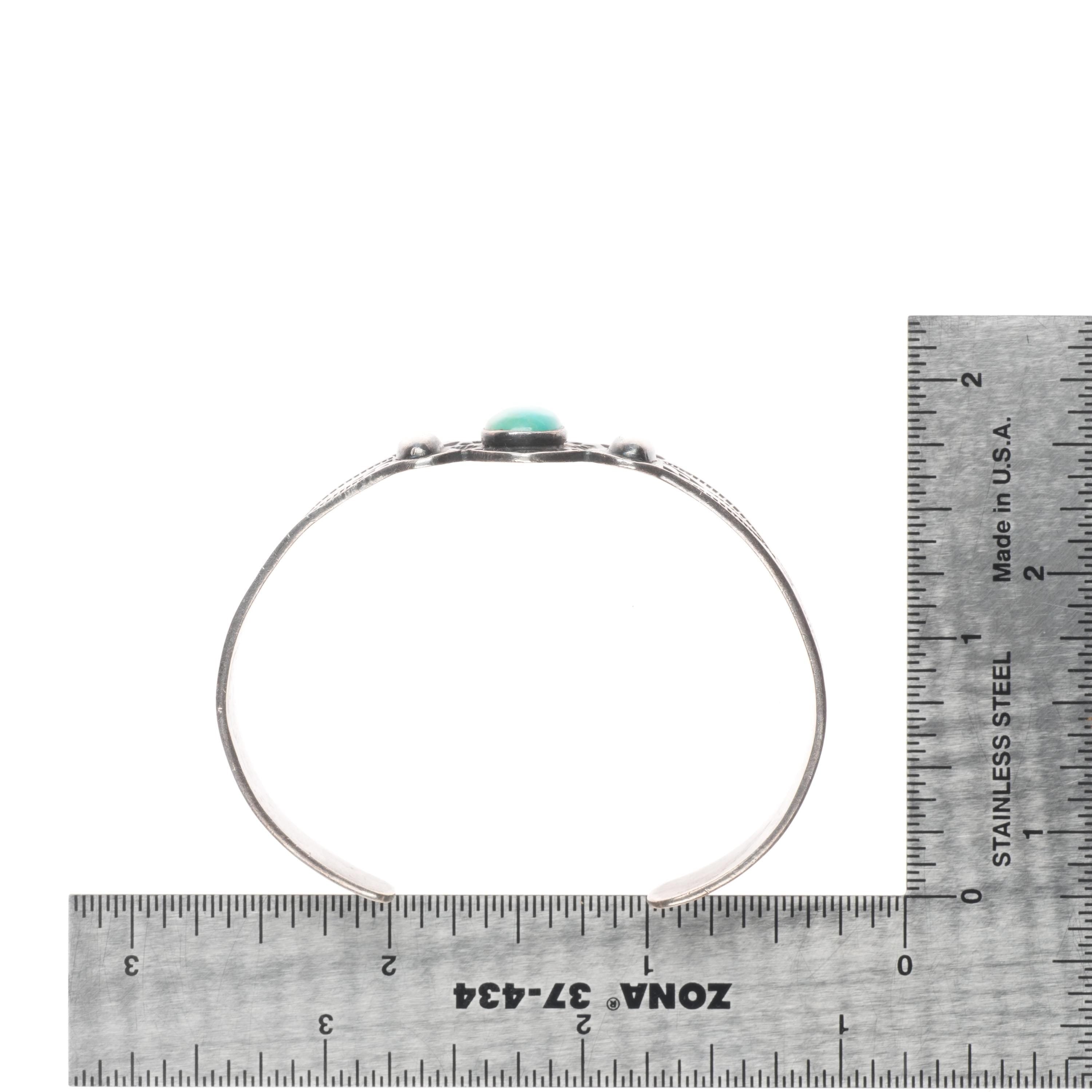 6.25" c1940‘s Fred Harvey era sterling silver cuff bracelet with turquoise. Tested and guaranteed solid sterling silver with weight and measurements in pictures. Circa second quarter of the 20st century. Unmarked.