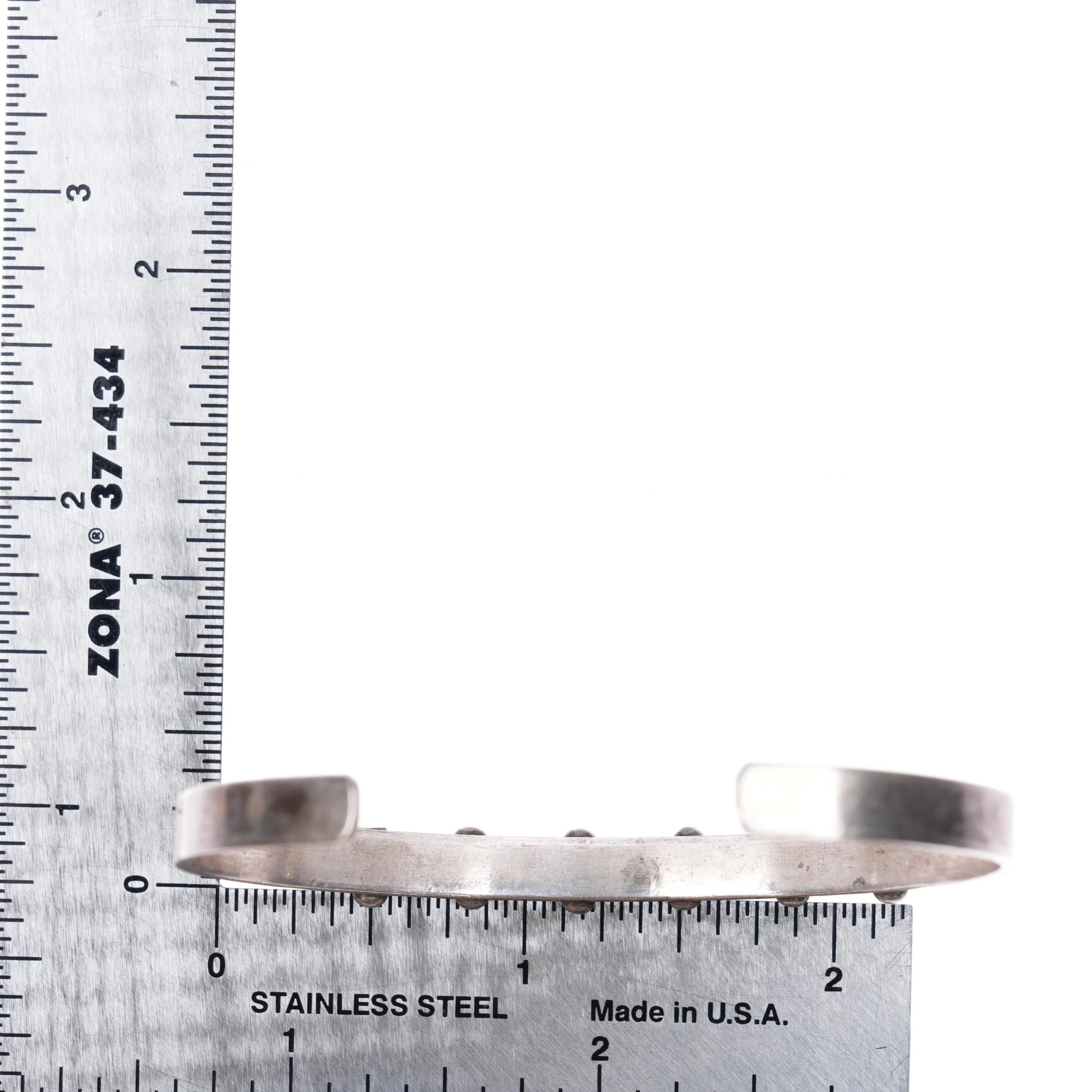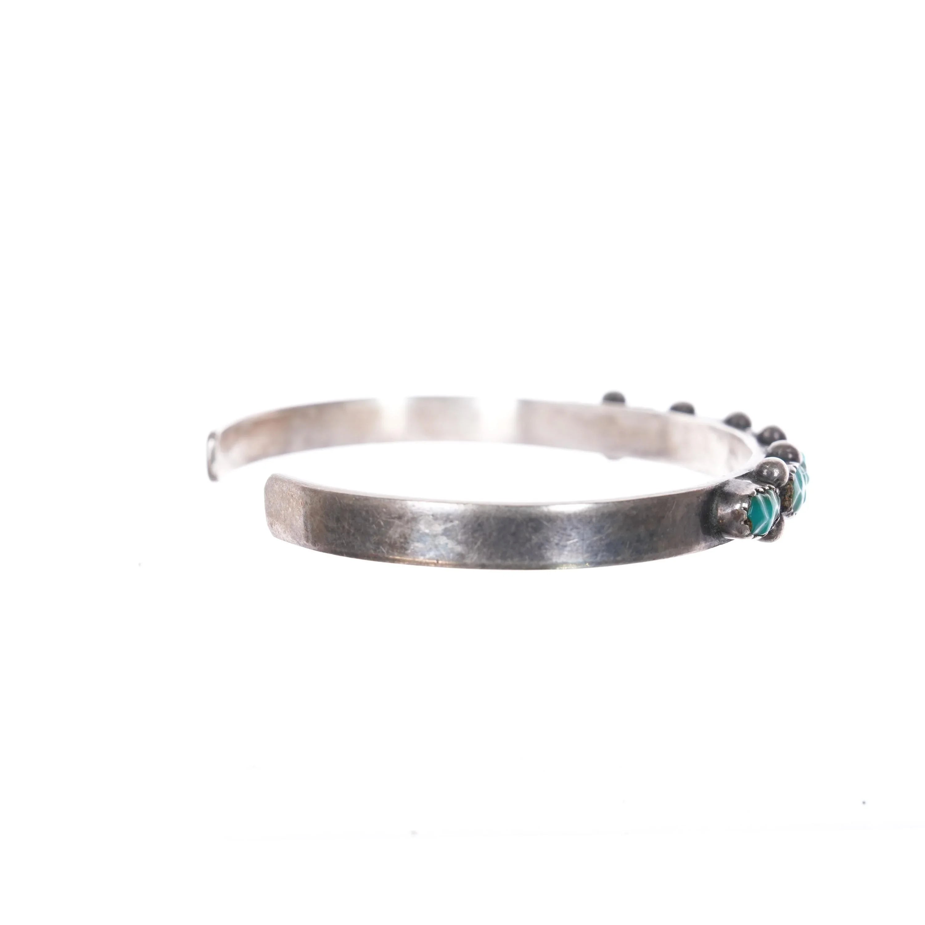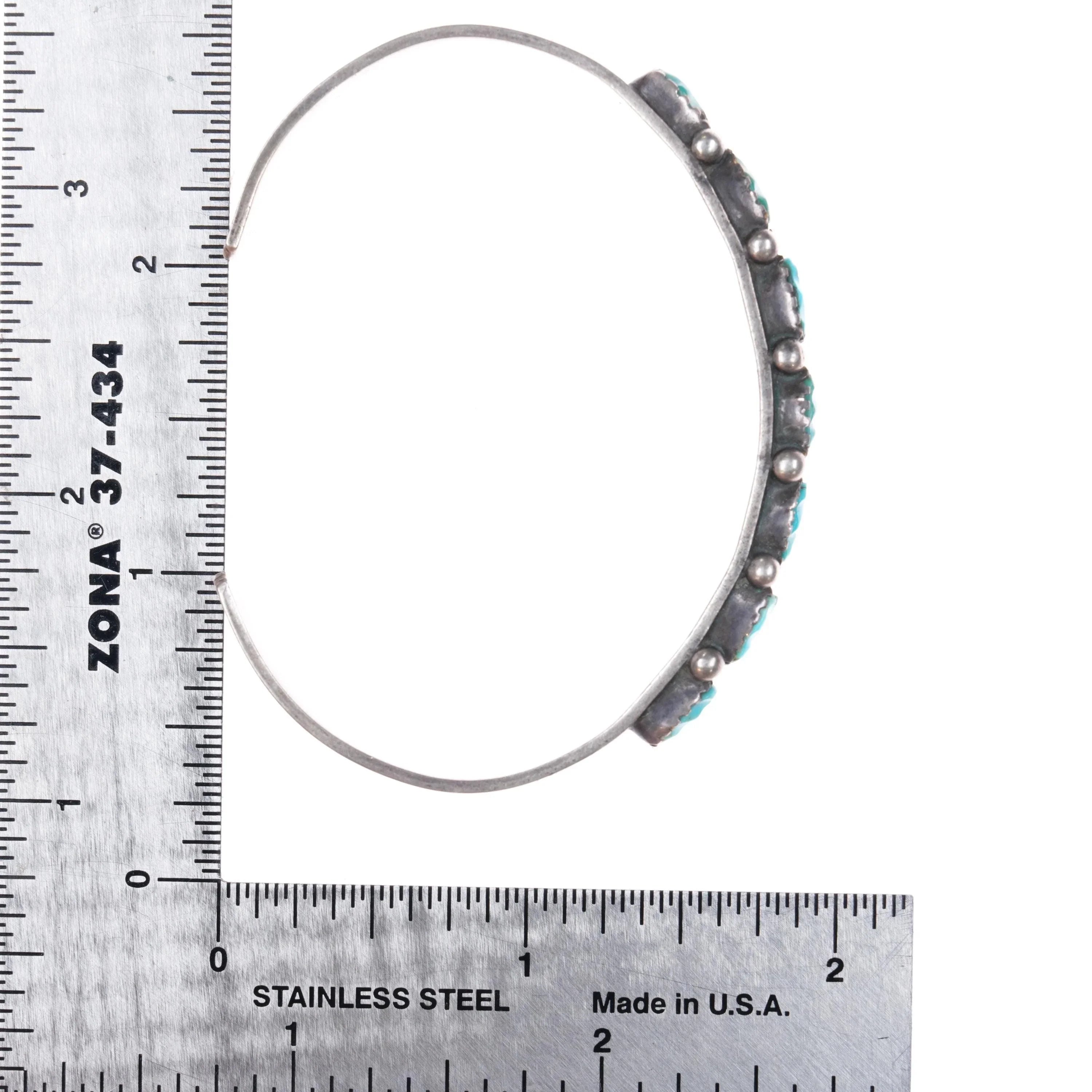 6.3" 50‘s-60‘s Zuni carved turquoise row cuff bracelet sterling silver. Tested and guaranteed solid sterling silver with no markings. Weight and measurements in pictures. Some expected wear, no cracks or breaks. Very sturdy.