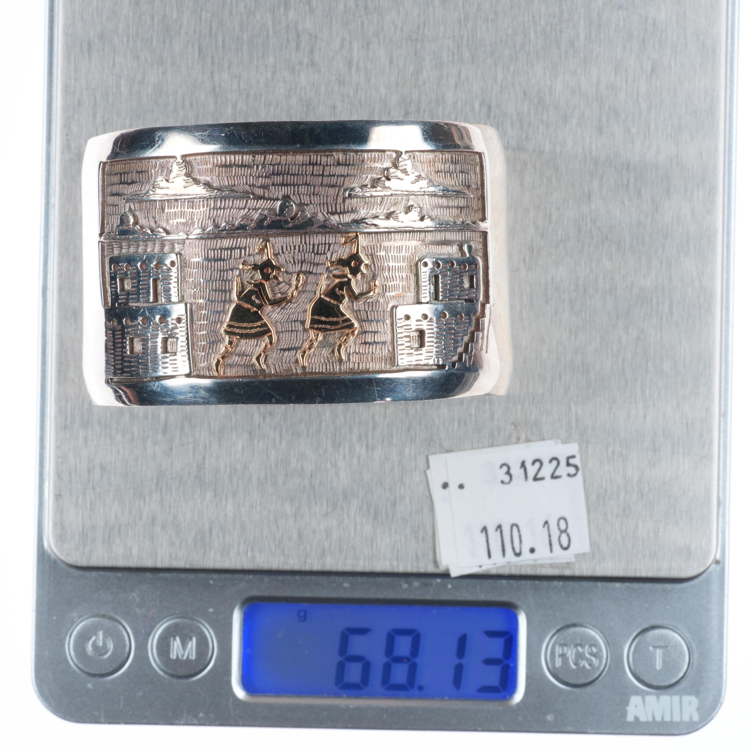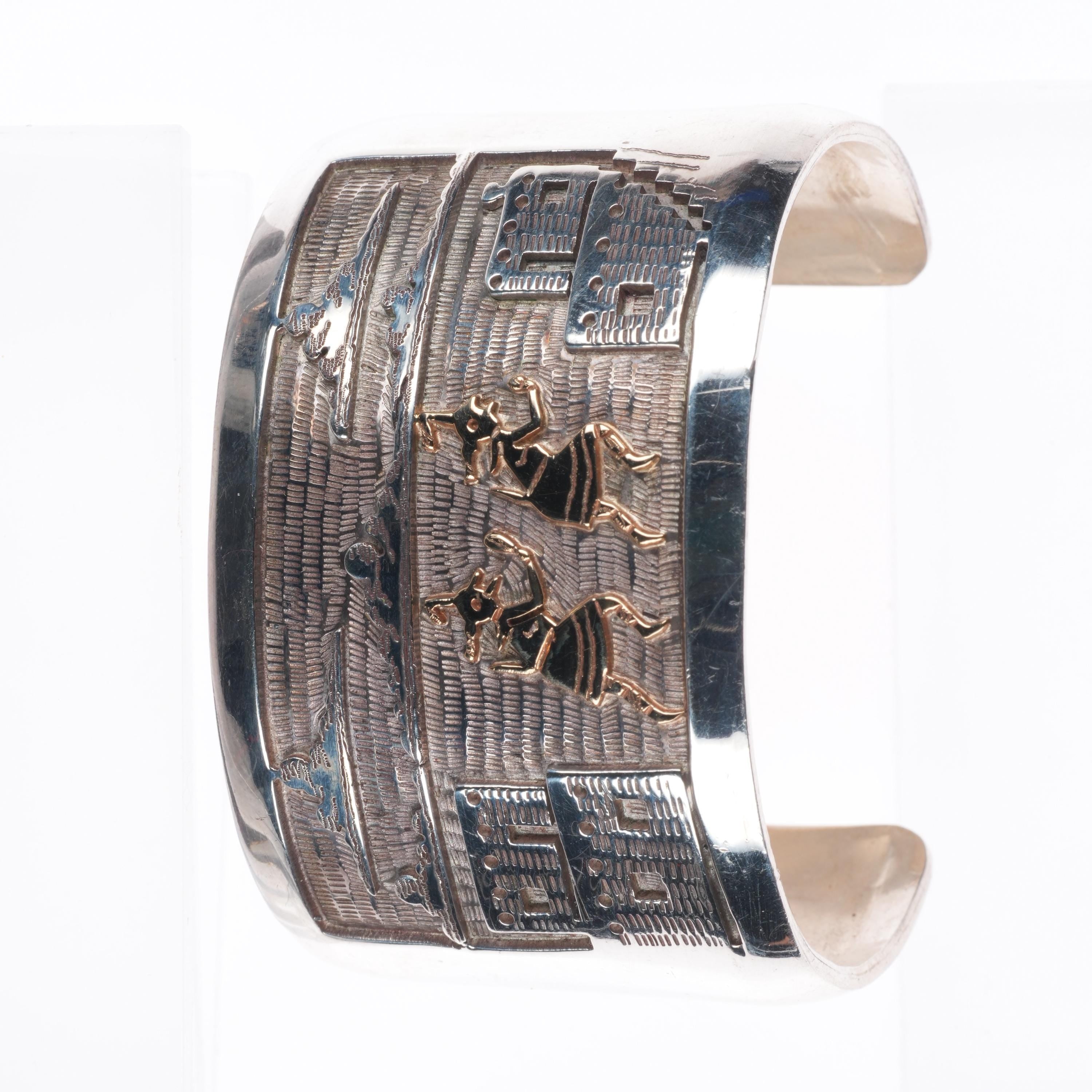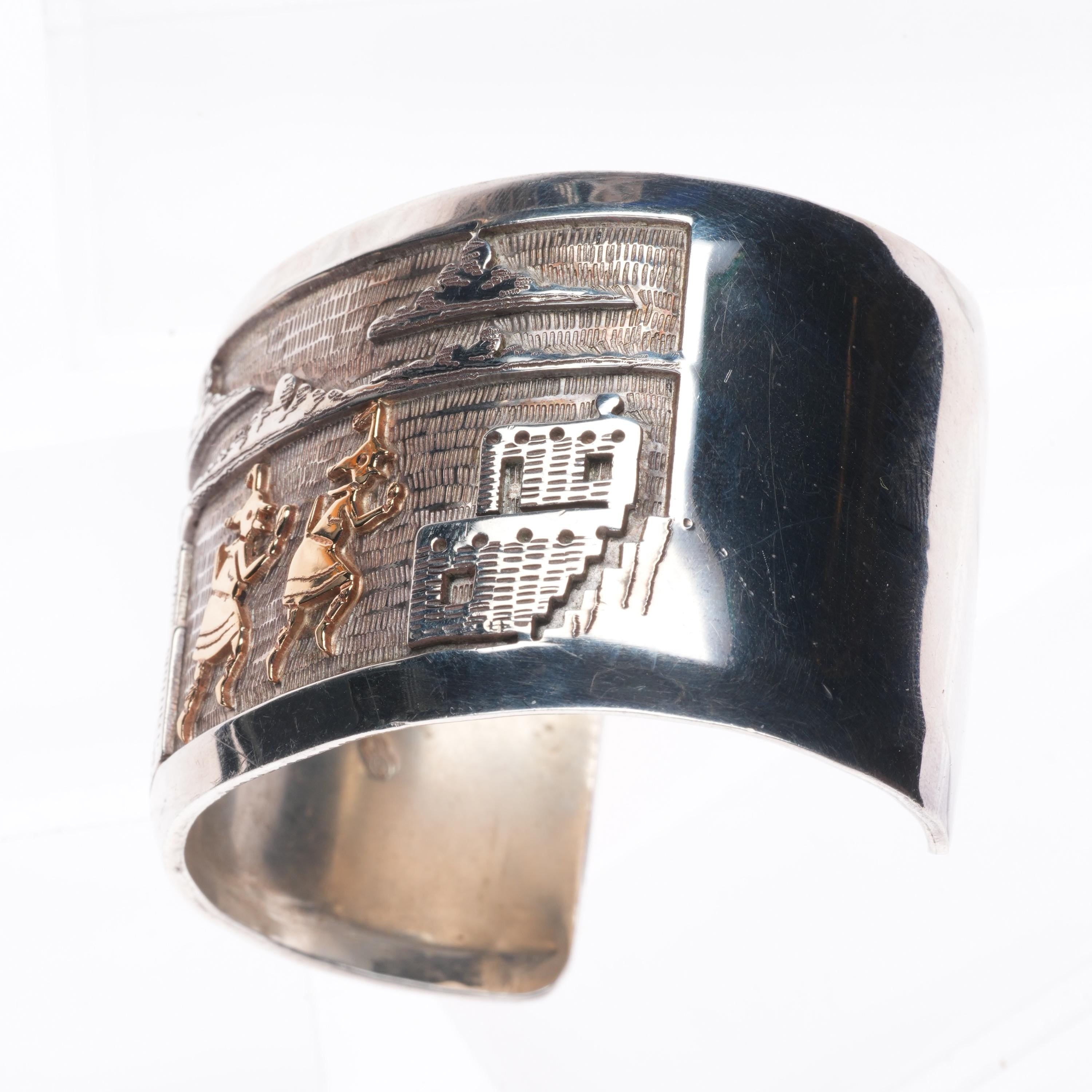 6.3" Bennett Kagenveama Hopi sterling silver/14k gold storyteller cuff bracelet . Tested and guaranteed solid sterling silver with weight and measurements in pictures. Thick layer of solid 14k gold on top of the decoration as shown. Circa last quarter of the 20th century with age appropriate wear..