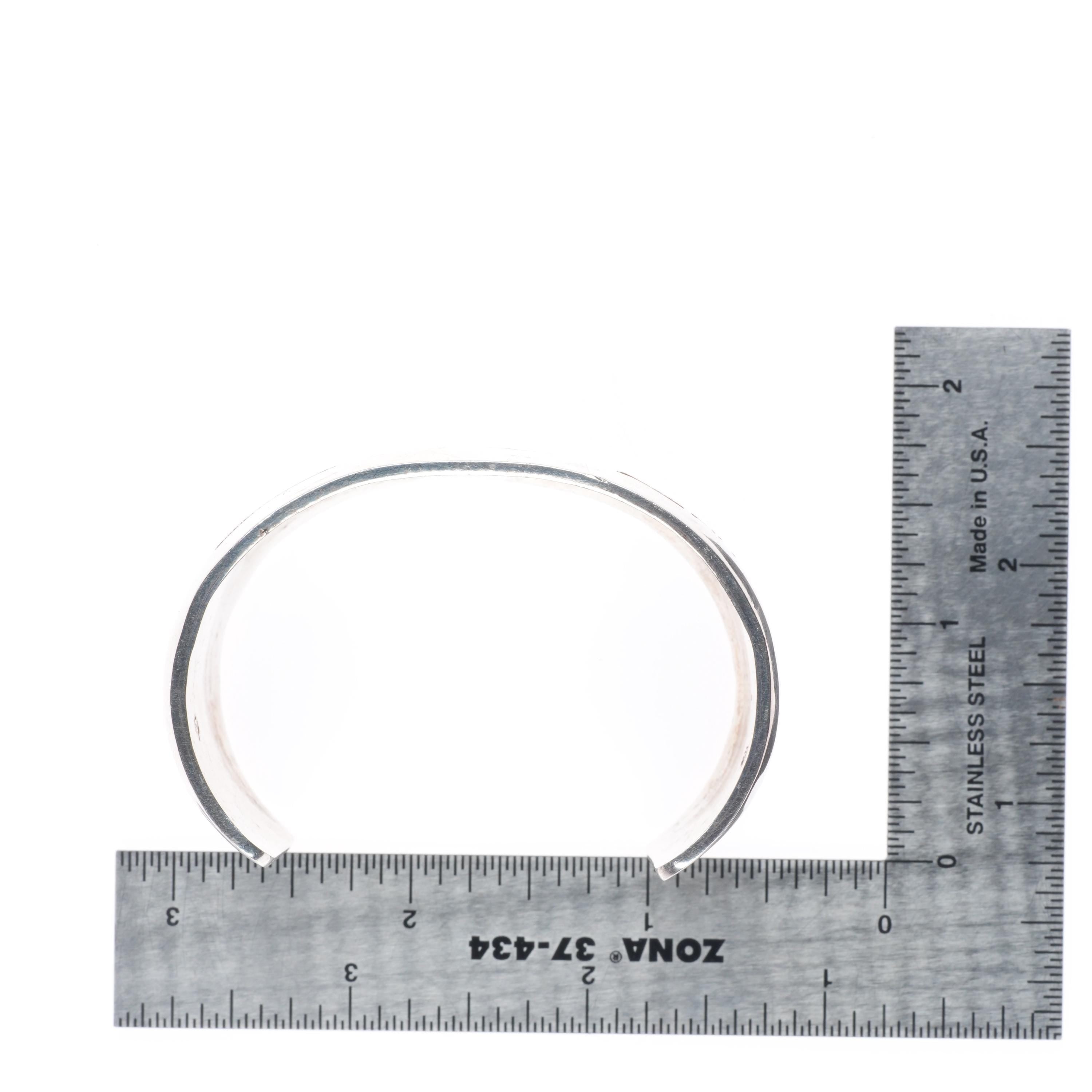 Bracelets are shown in the photos with a tape measure inside the bracelet, other photos will typically show the gap size. The size at the beginning of the title includes the gap. Hallmarked with artists hallmarks and no other markings.