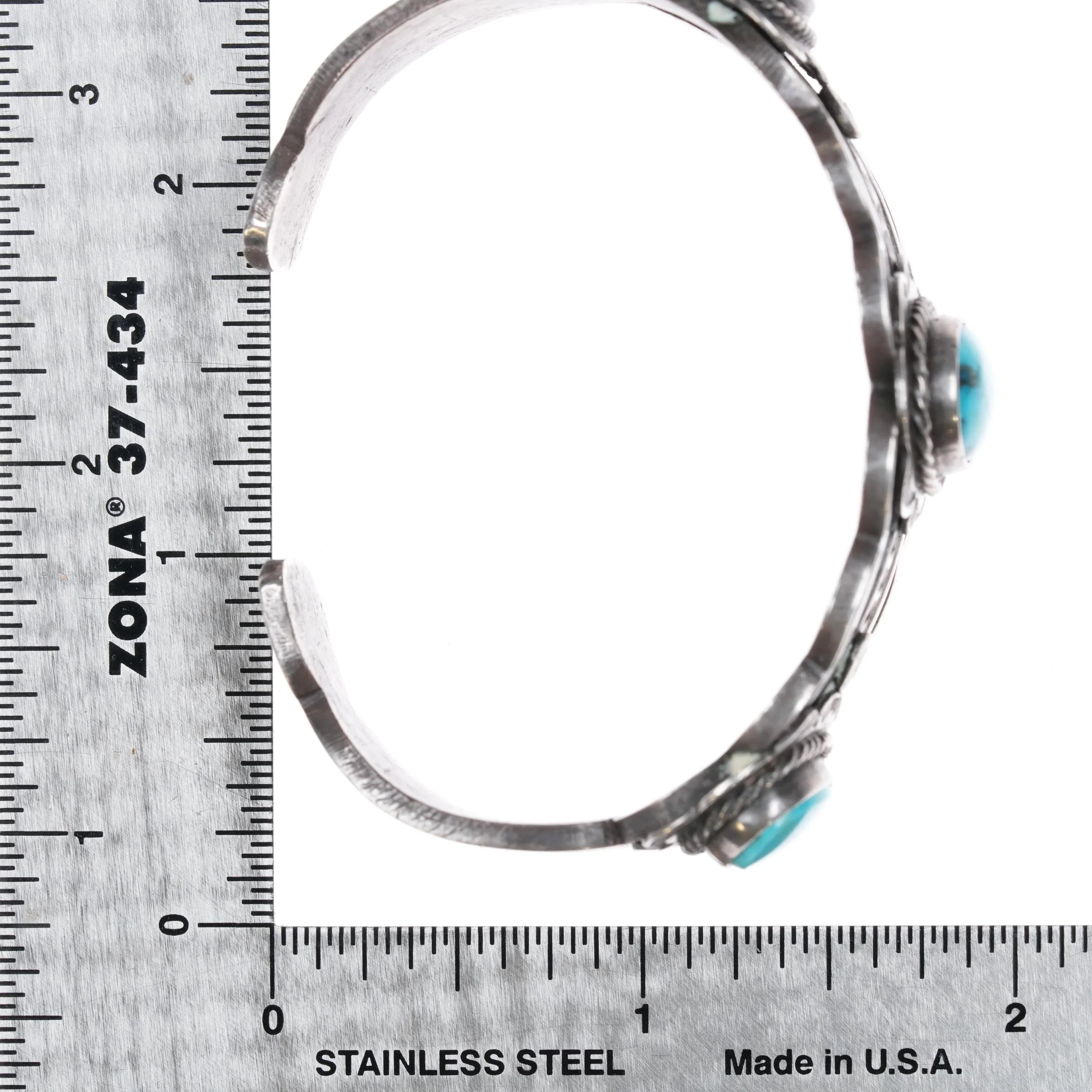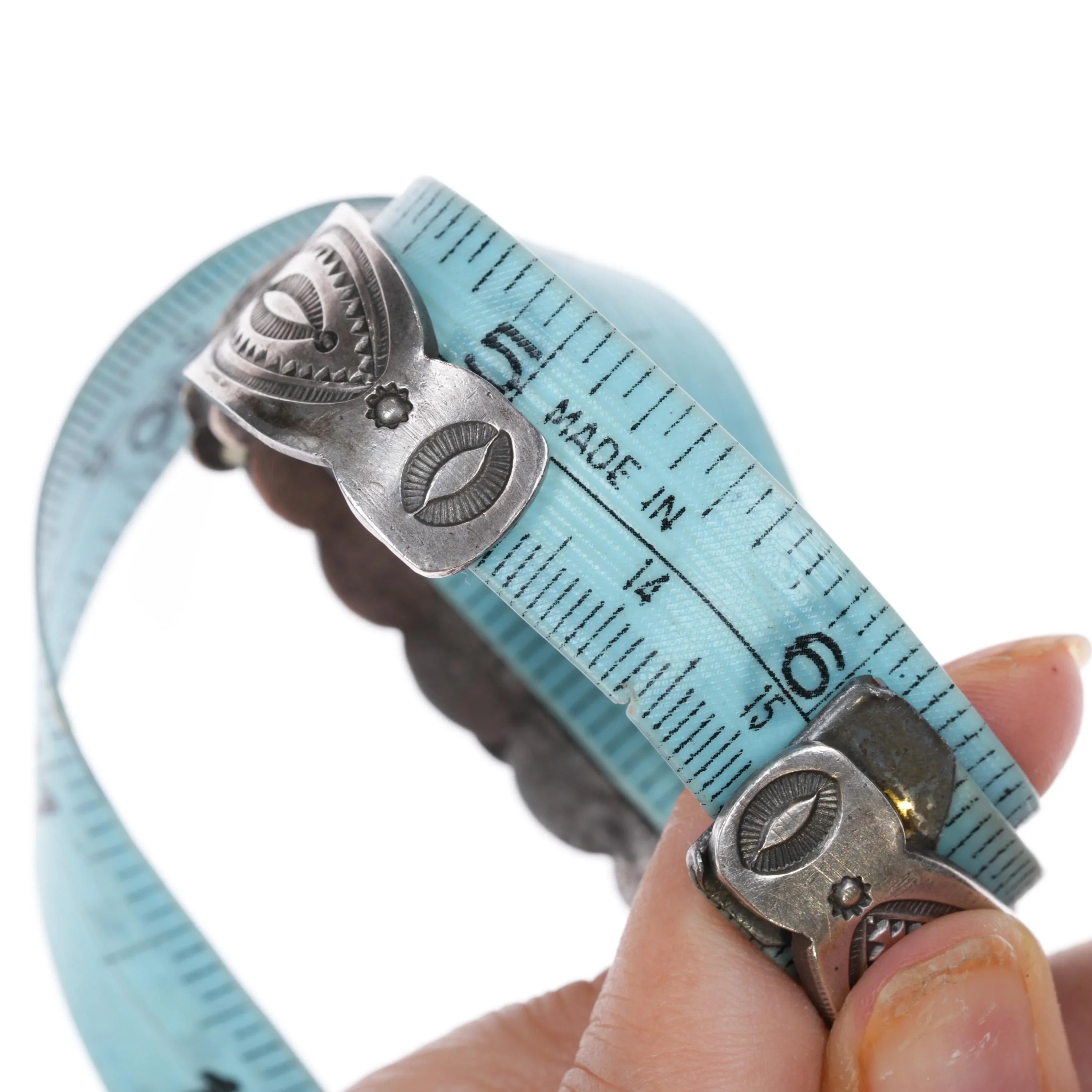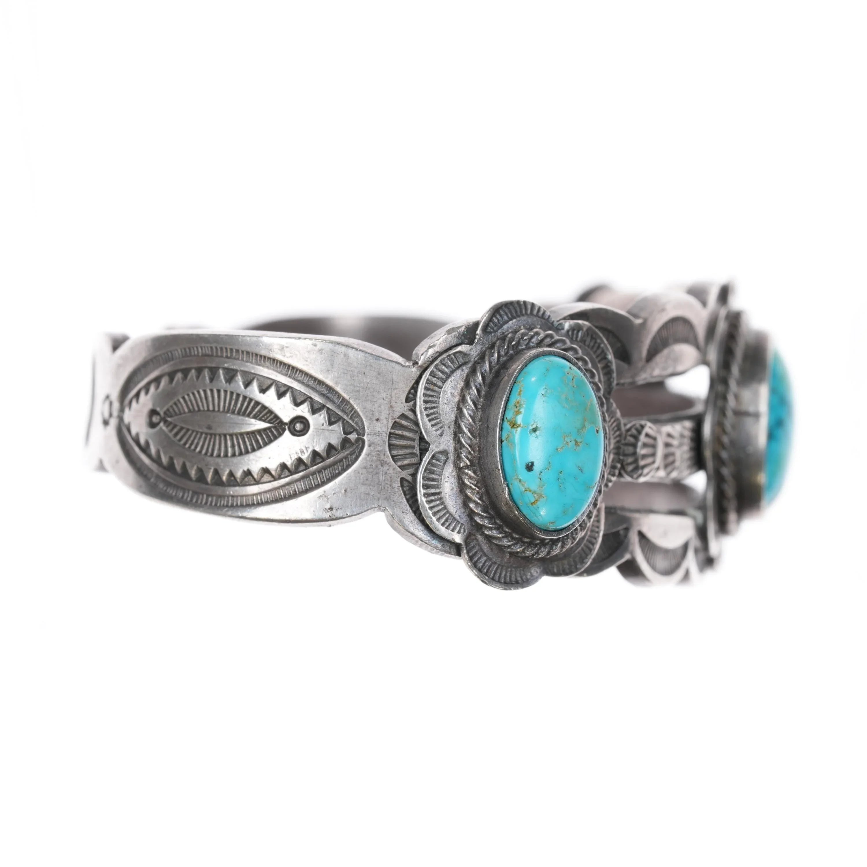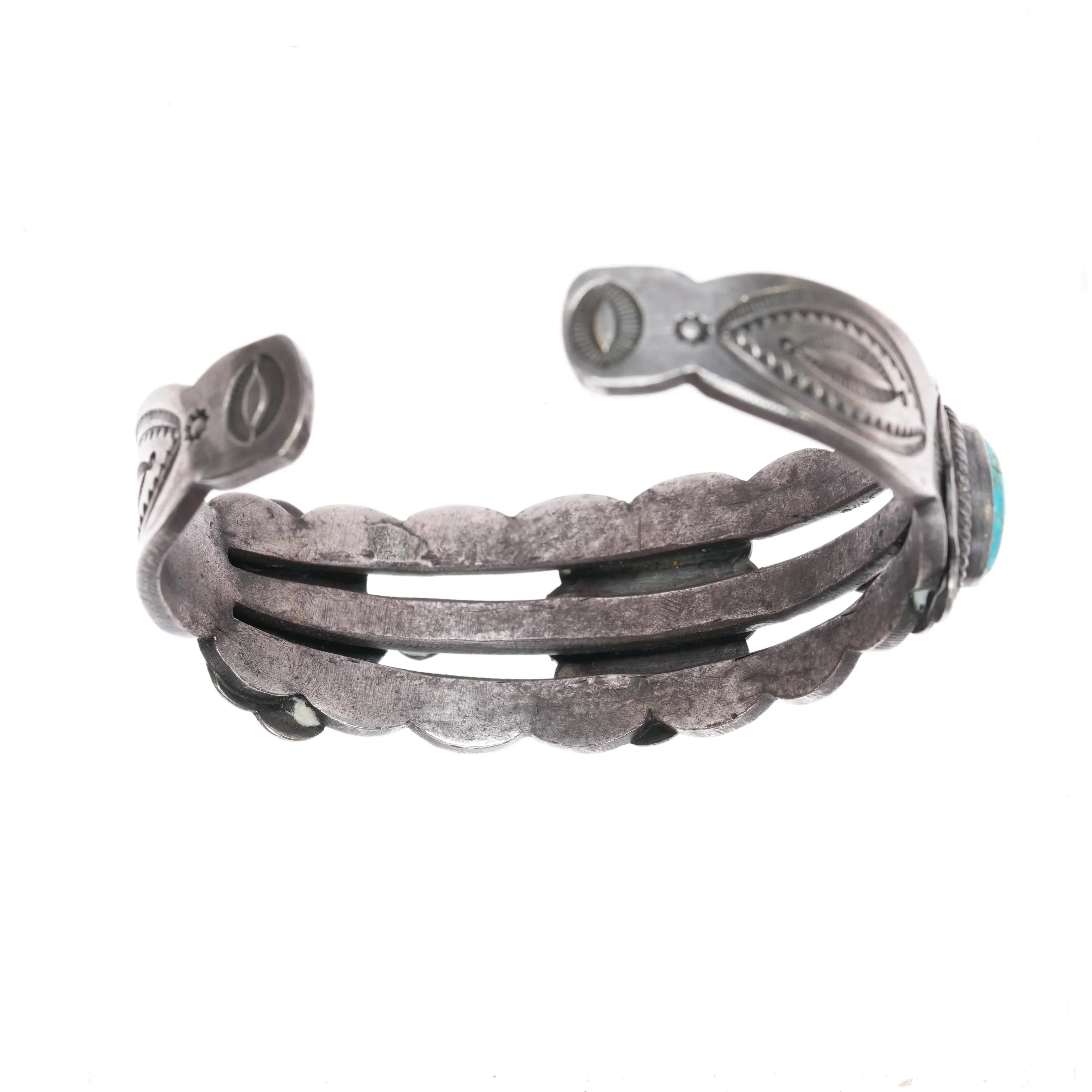 6" 30's-40's Intricately stamped Navajo silver cuff bracelet w/3 turquoise