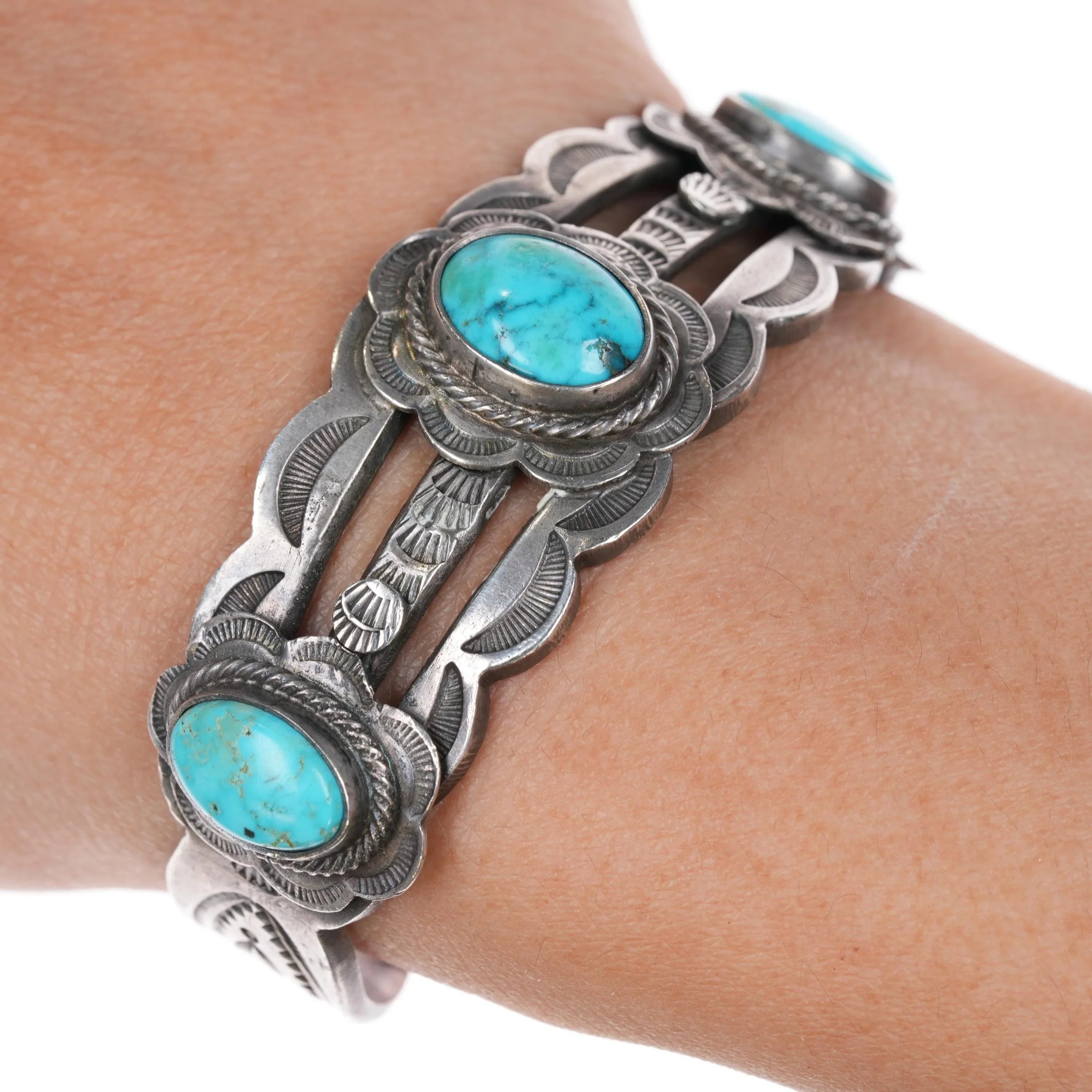 6" 30‘s-40‘s Intricately stamped Navajo silver cuff bracelet w/3 turquoise.. No issues, solid sterling, weight and measurements in pictures. Great bracelet from the second quarter of the 20th century with no issues. Unmarked