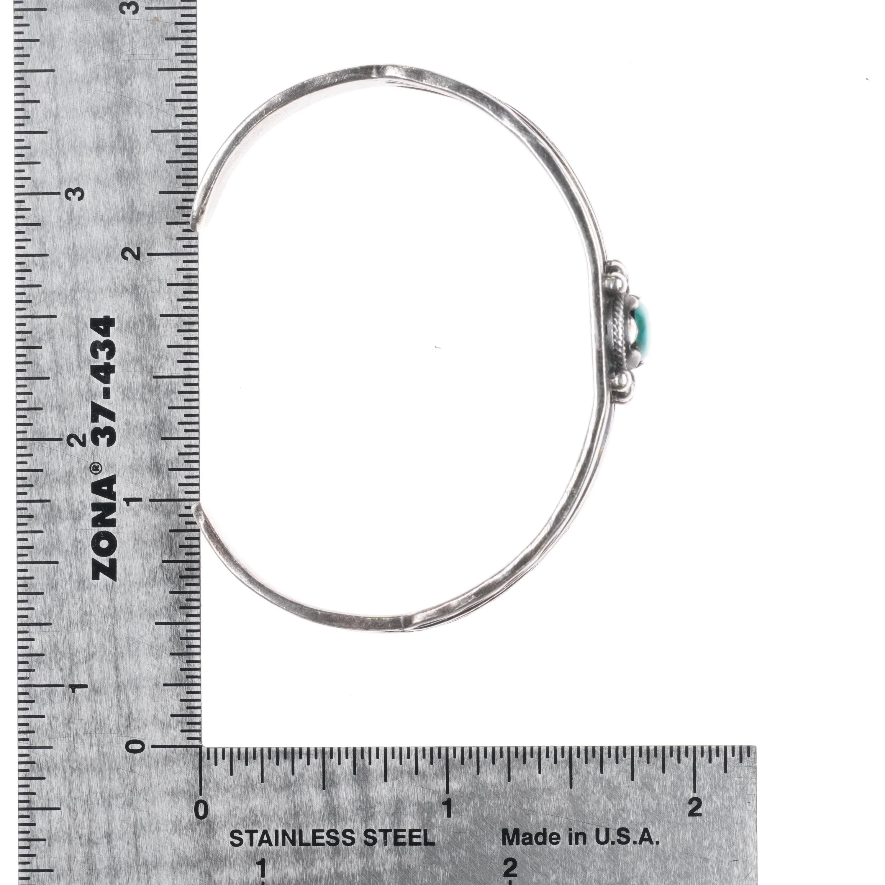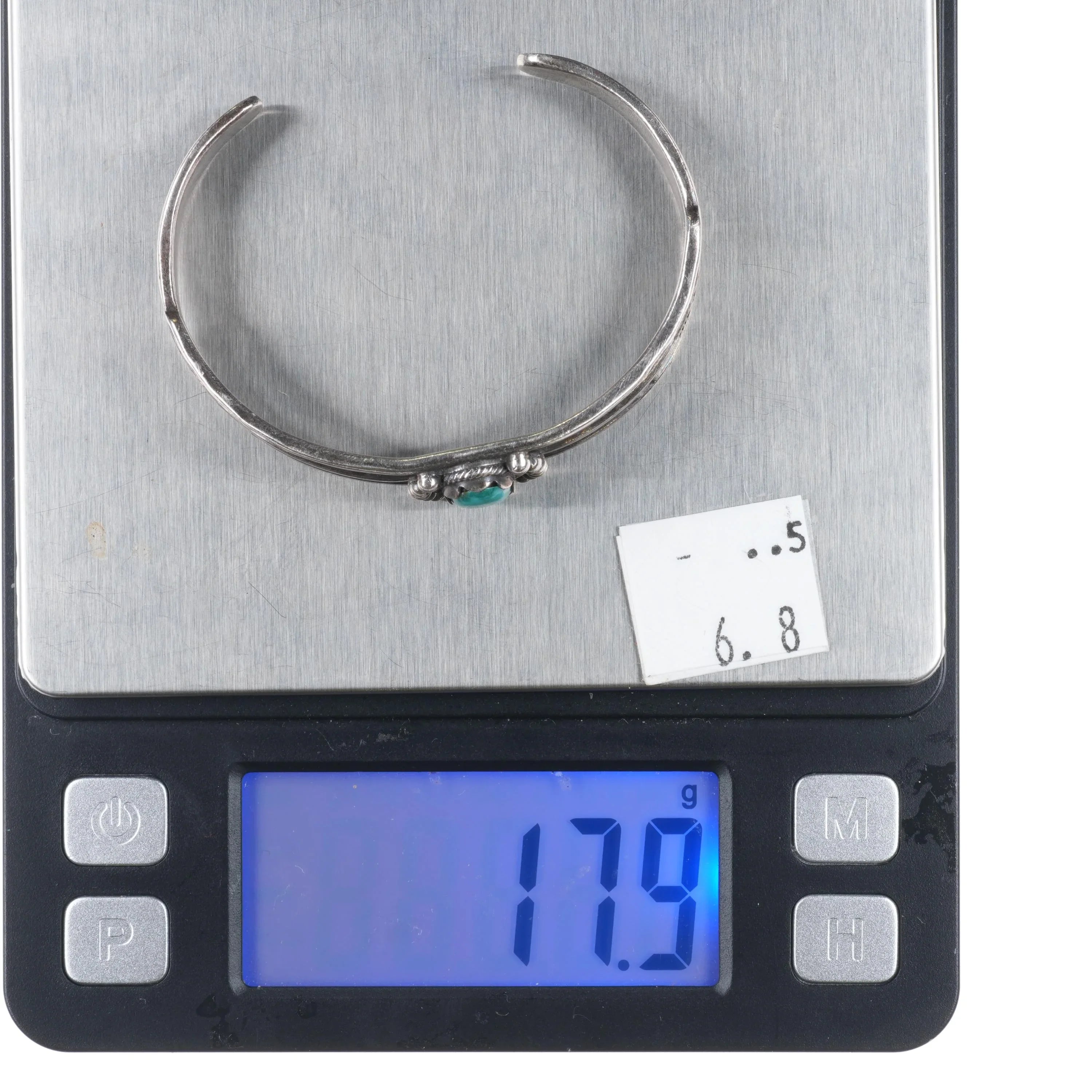6" 30‘s-40‘s Navajo sterling silver hand stamped cuff bracelet center turquoise. Tested and guaranteed solid sterling silver with no hallmarks which is very common with Native American jewelry of this era.
