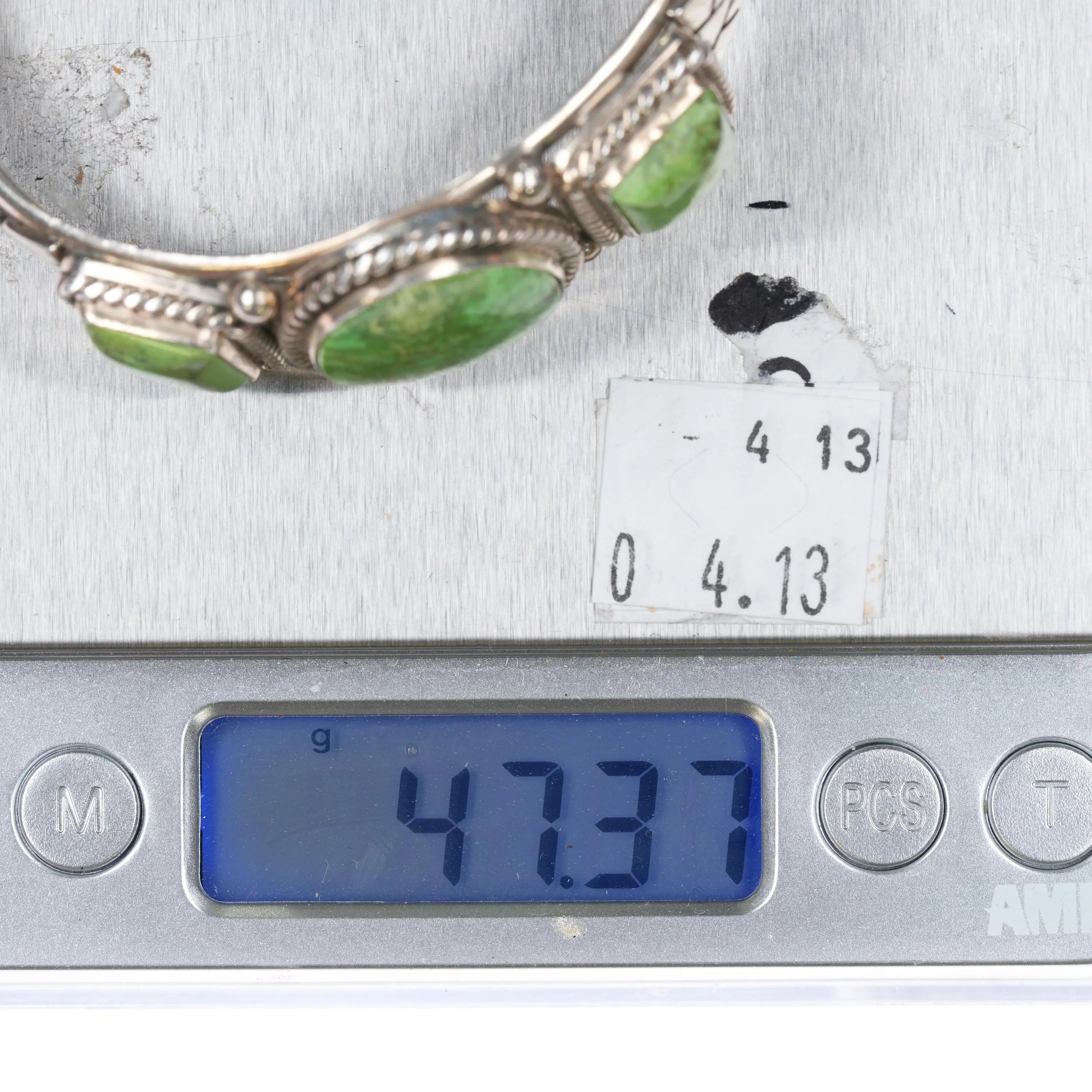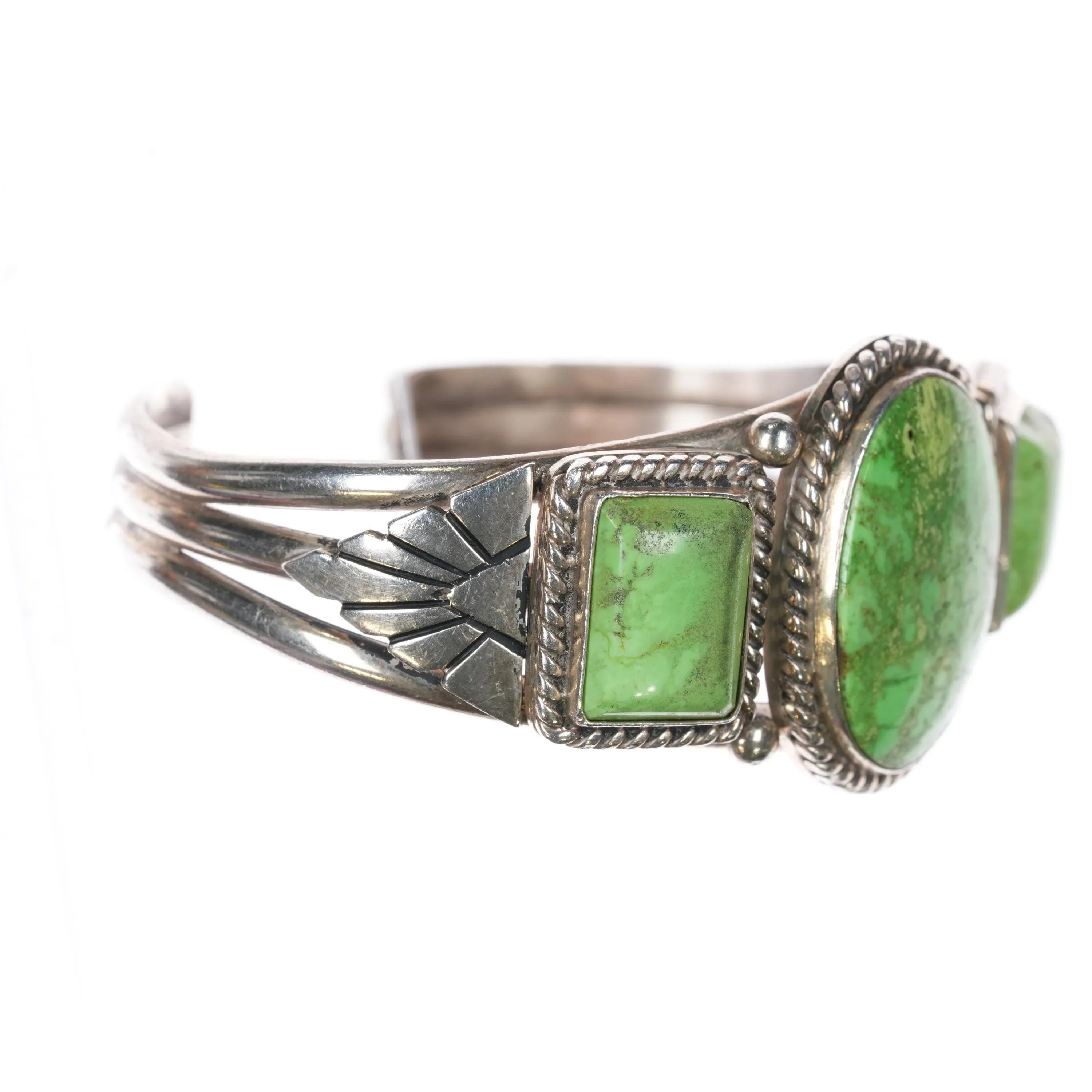 6.4" Herman Vandever Navajo sterling silver gaspeite cuff bracelet. Weight and measurements in pictures, solid sterling silver with no issues. Minimal wear circa last quarter of 20th century.