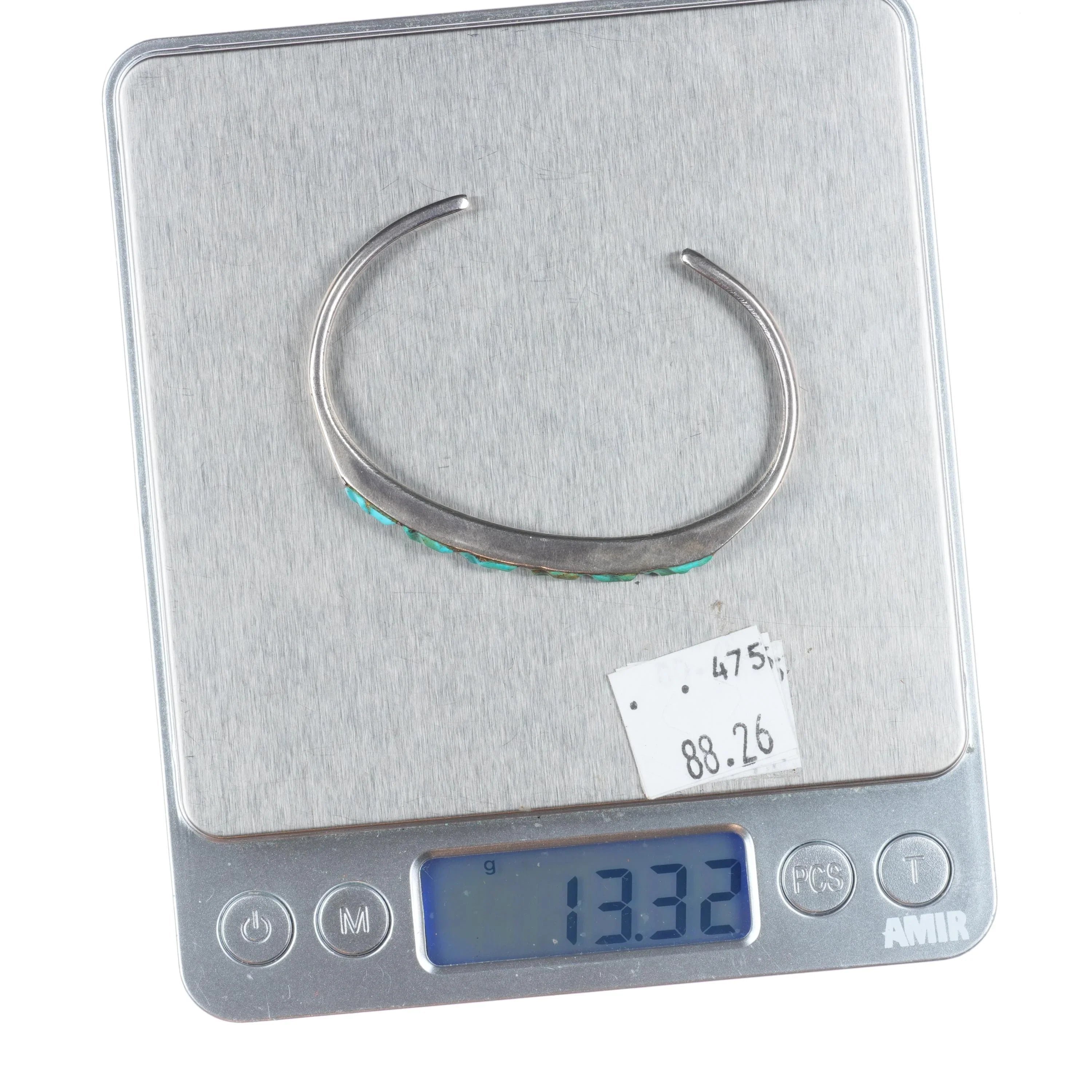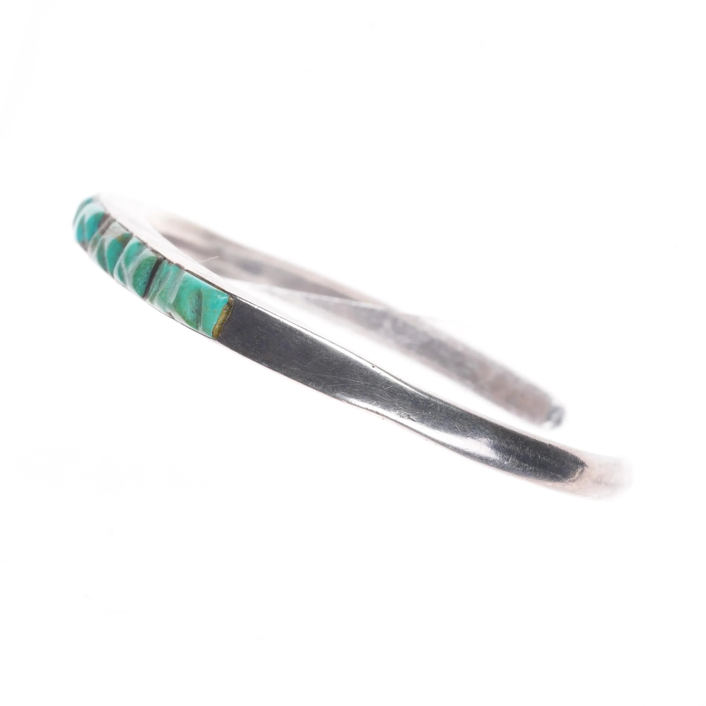 6" 40‘s-50‘s Zuni hand carved turquoise slim stacker silver cuff bracelet Tested and guaranteed solid sterling silver with weight and measurements in pictures. Circa third quarter of the 20th century. Unmarked.