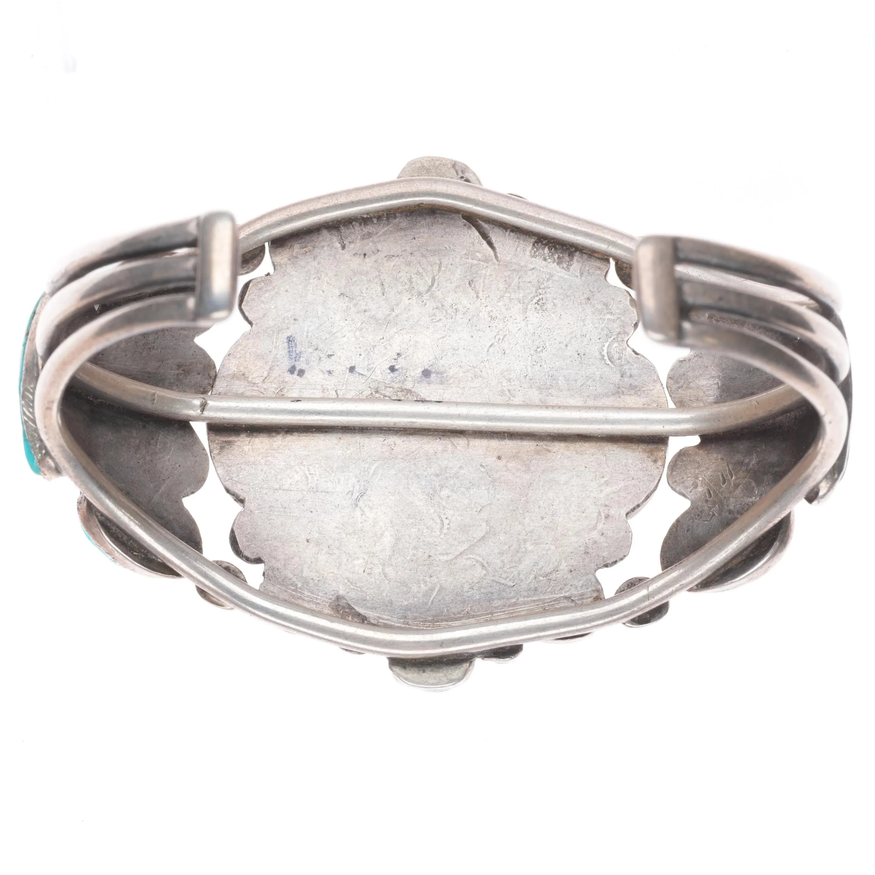 6.5" 30‘s-40‘s Navajo turquoise cluster vintage cuff bracelet sterling silver. Tested and guaranteed solid sterling silver with appropriate wear, a few of the stones are early repurposed beads with pump drilled holes as shown. One stone with old fracture. Some wear to bezels, all stones secure. Weight and measurements in pictures. Circa second quarter of the 20th century. unmarked