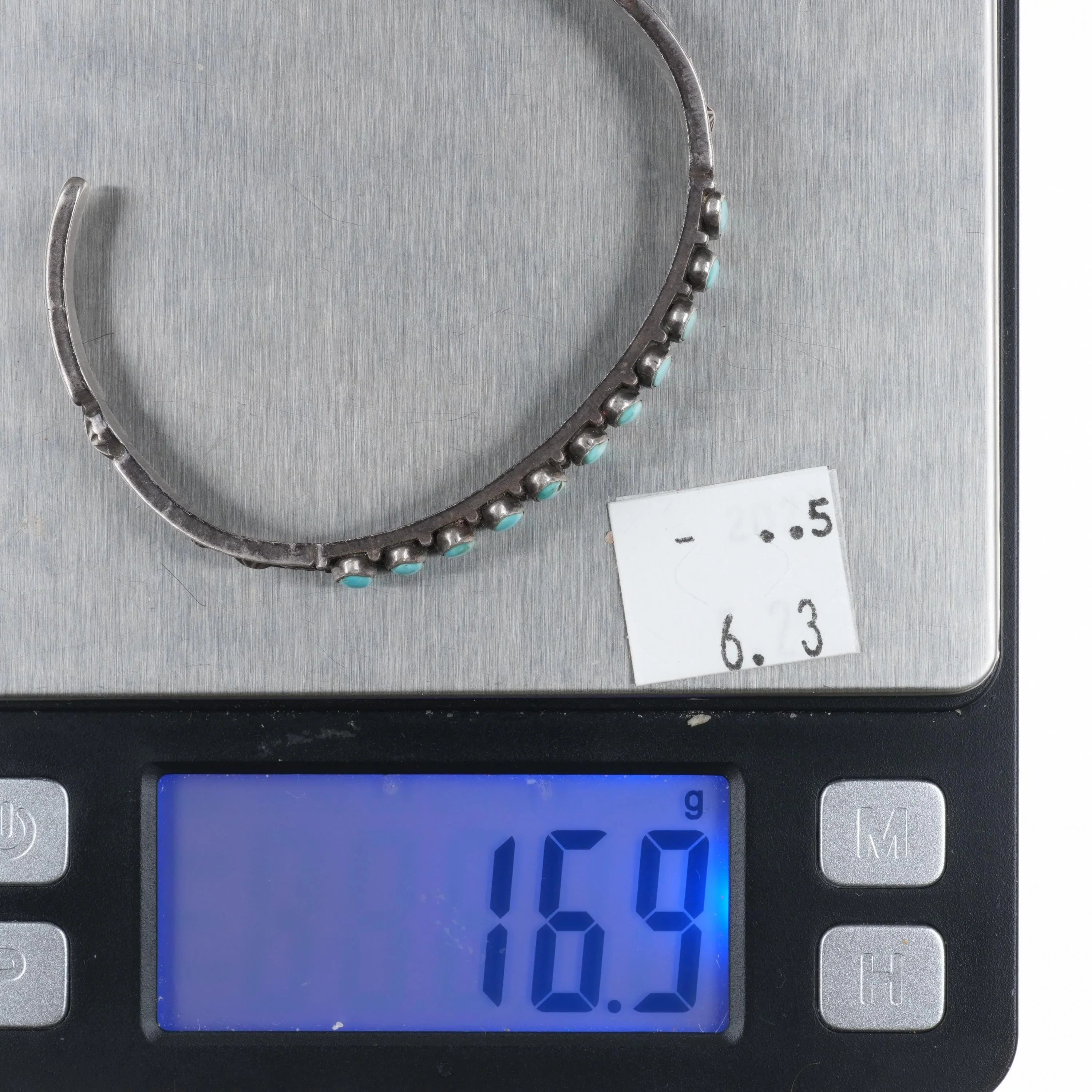 6.5" 30‘s-40‘s Vintage Navajo turquoise row cuff bracelet sterling silver. Tested and guaranteed solid sterling silver with no detectable markings. Weight and measurements in pictures. Some expected wear, no cracks or breaks. circa second quarter of the 20th century.