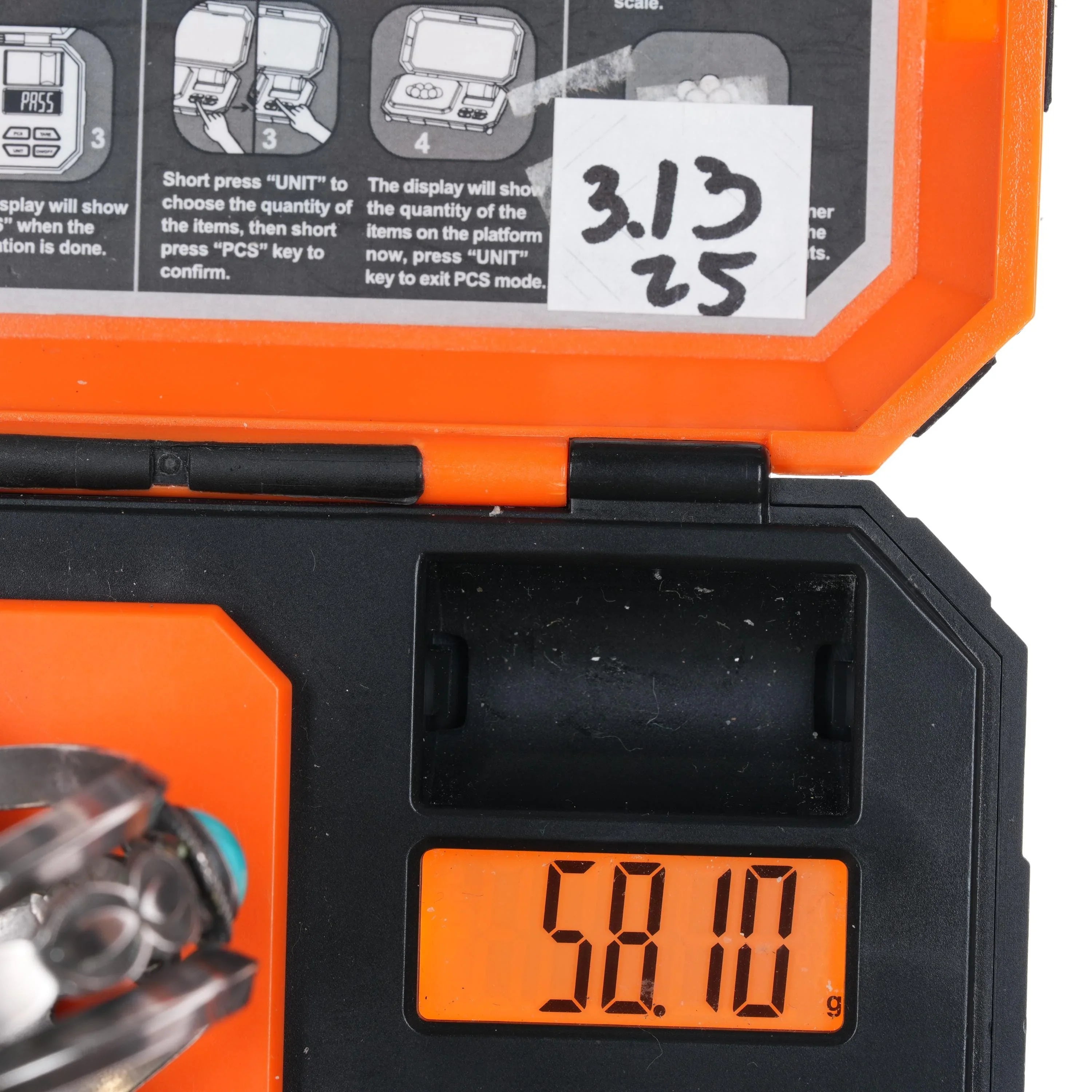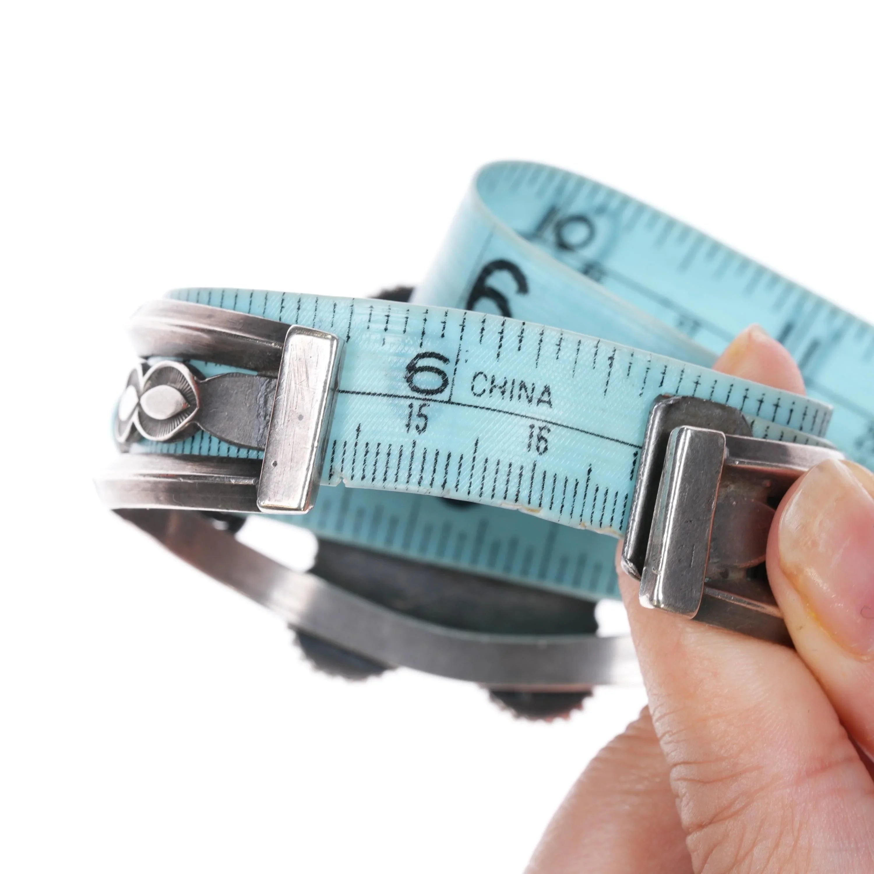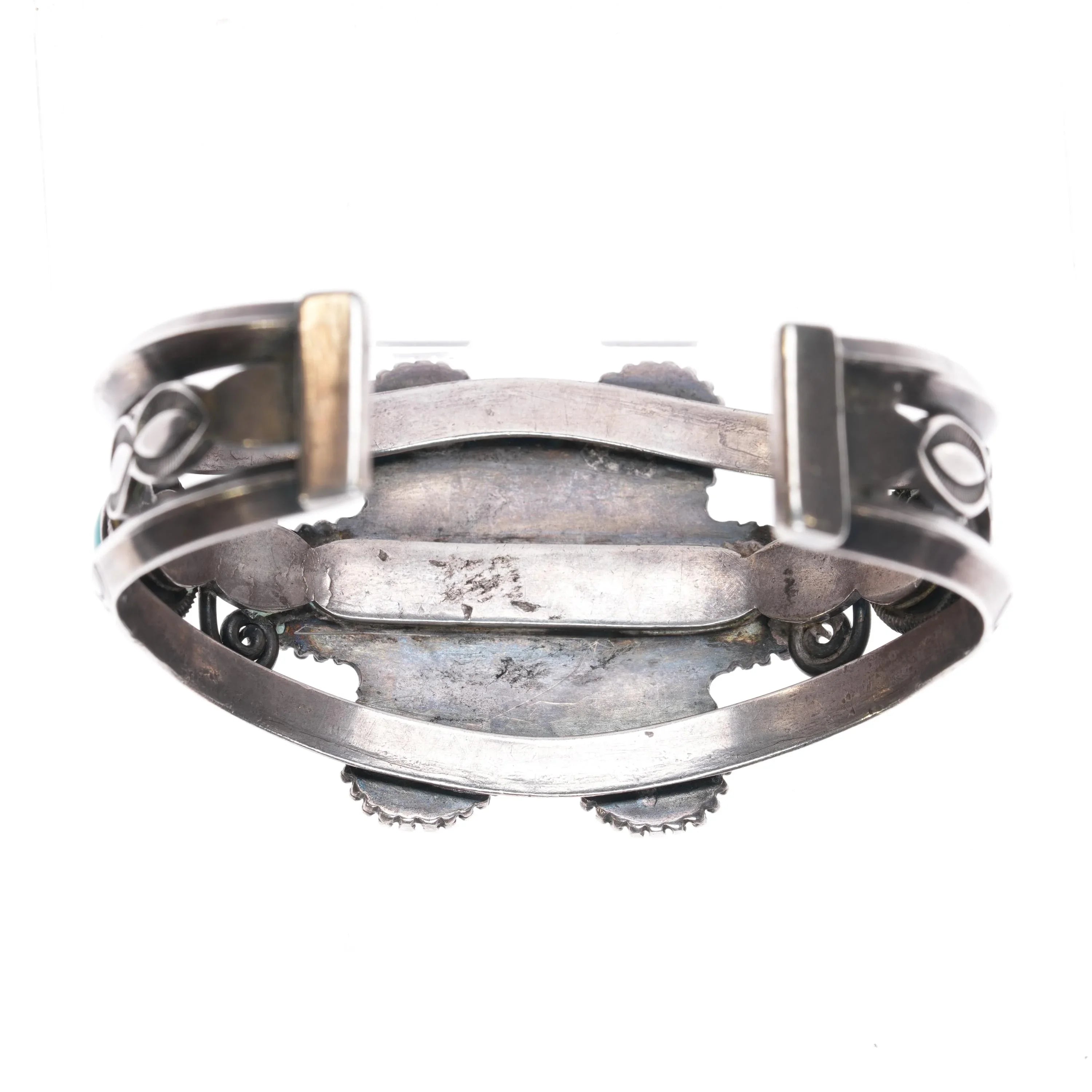 6 5/8" 1930‘s Navajo ingot silver turquoise cluster cuff bracelet F Peshlakai?. Solid sterling silver. Will fit up to a 6 5/8" wrist, gap size and other measurements in pictures. Nice, well made bracelet. one of the tiny beads outside the bezel on one side is missing, unmarked. Very clean work here, reminds of of some Fred/Frank Peshlakai pieces I have had and seen.