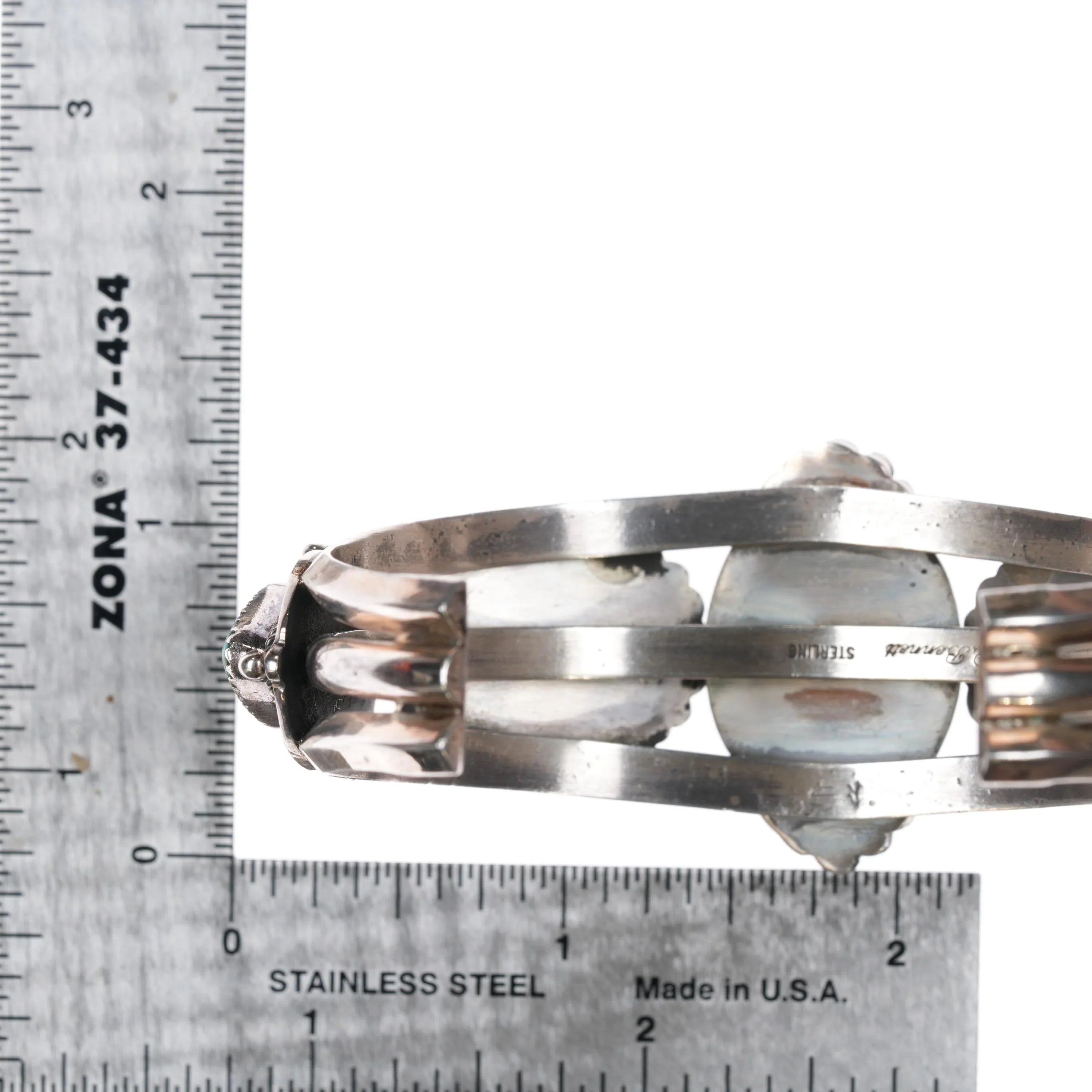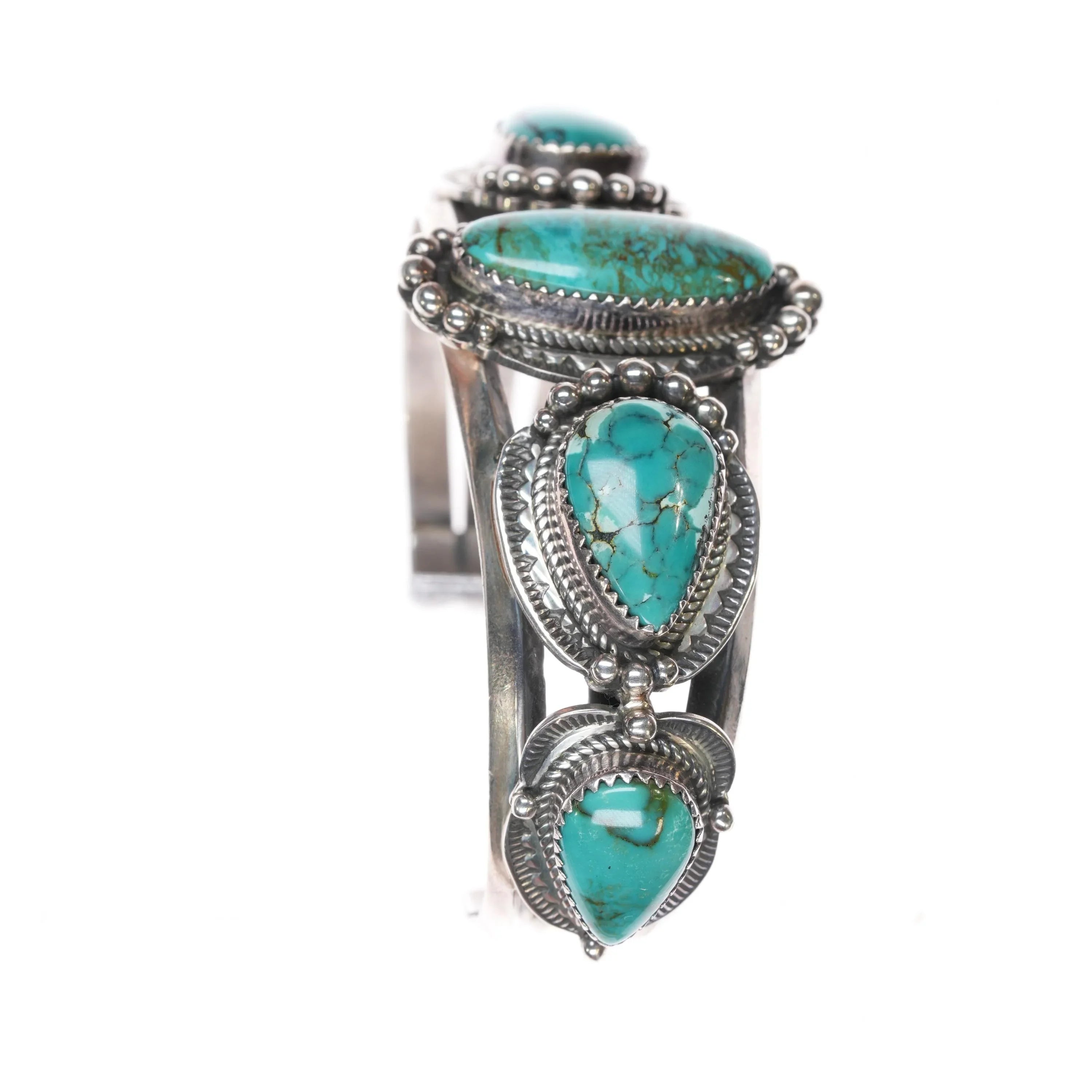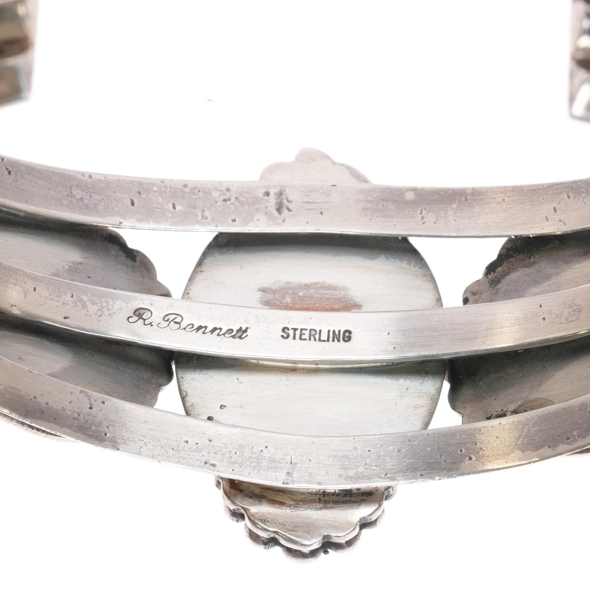 6 5/8" Ray Bennett Navajo Sterling and turquoise 5 stone cuff bracelet. Solid sterling silver. Will fit up to a 6 5/8" wrist, gap size and other measurements in pictures. Nice, well made bracelet. Marked as shown.