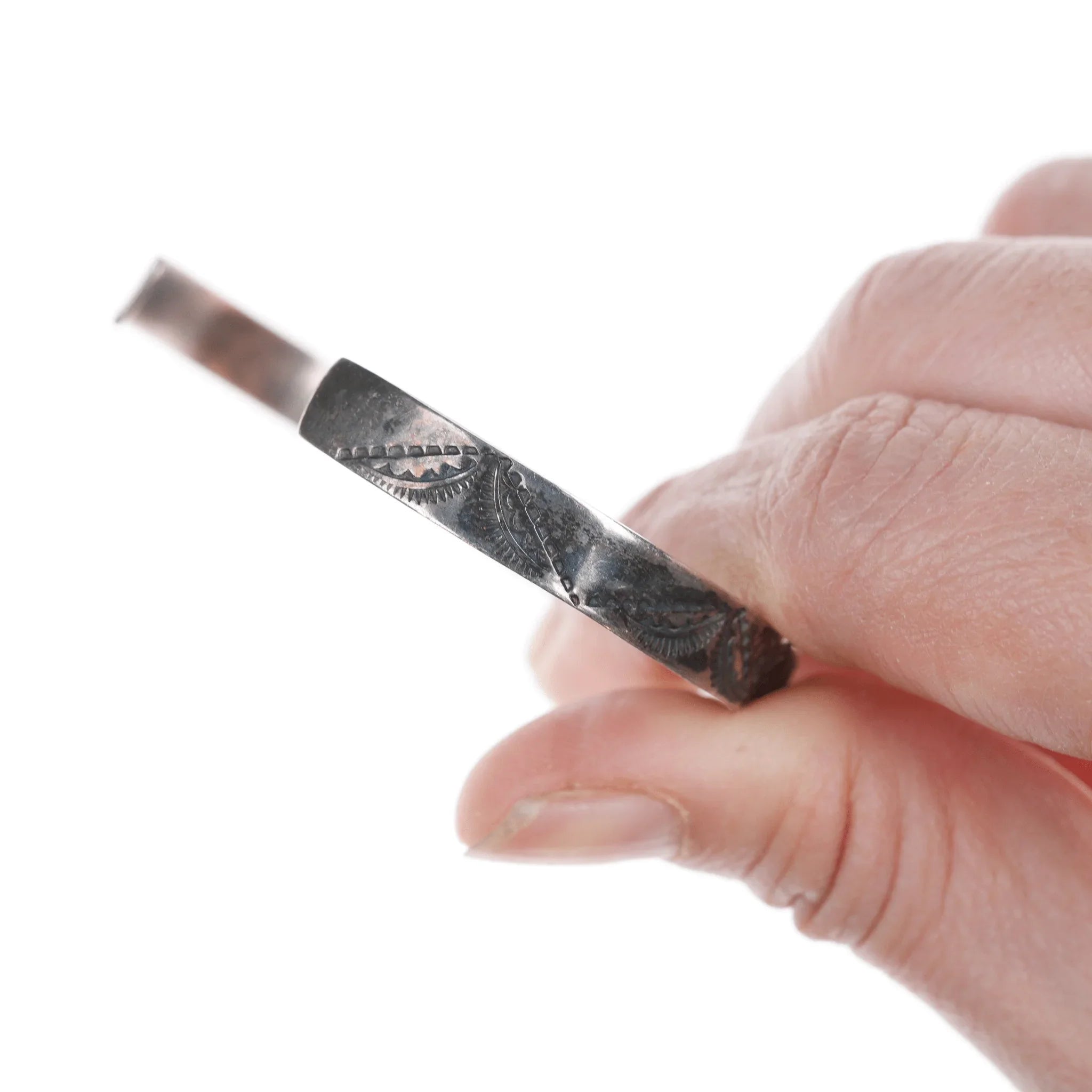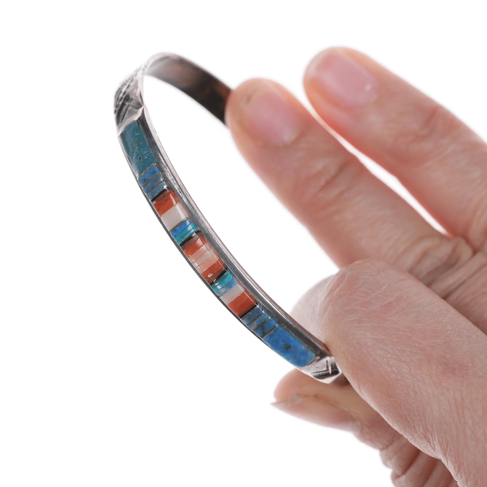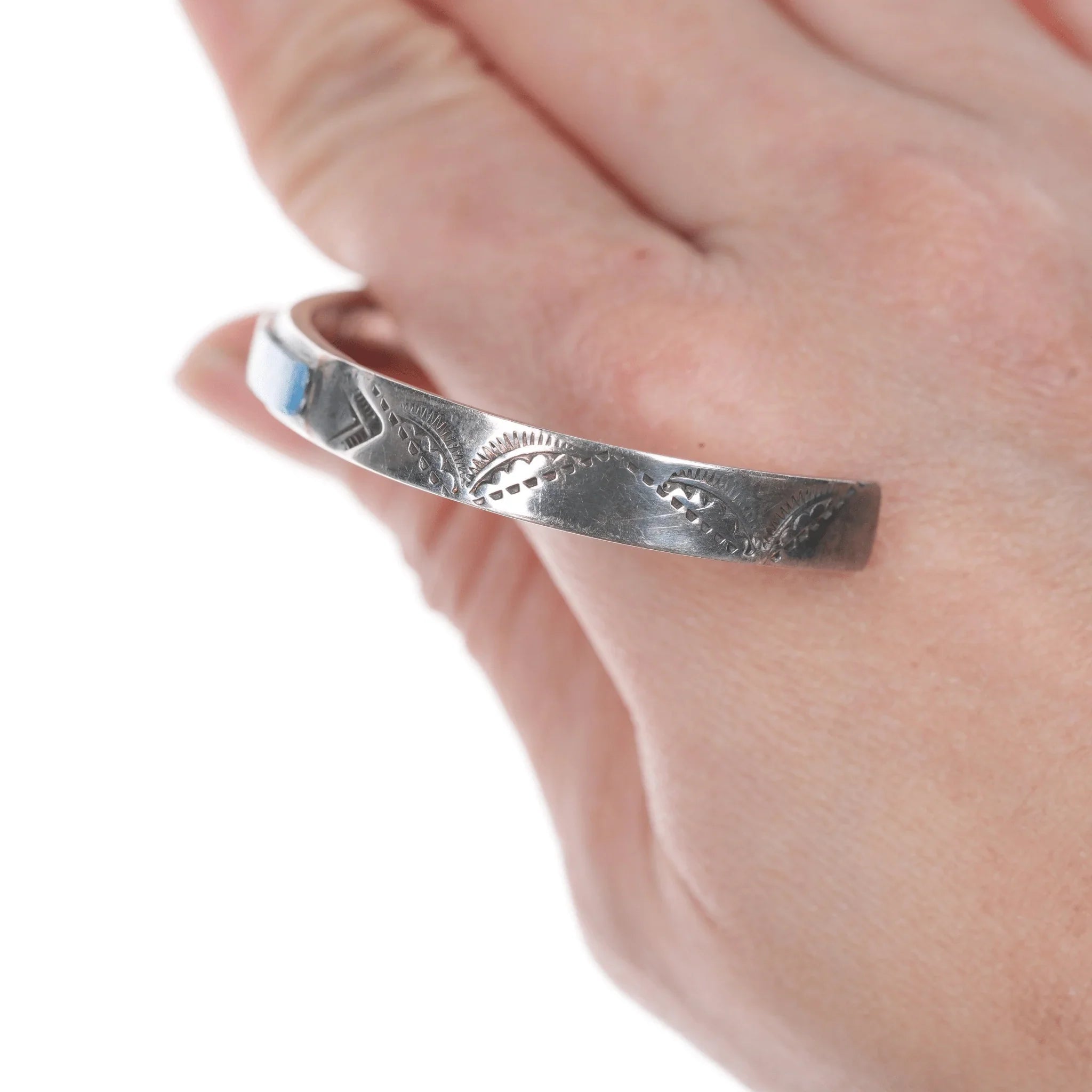 6 5/8" Vintage Zuni Silver Channel inlay cuff bracelet with stamped design .25"<br>wide in center. Damage or repair, not really sure which to one side of inlay<br>Denim Lapis. Marked or unmarked as shown in pics, weight and other measurements<br>in pics. Sorry but my jewelry is stored in a secure location and connot be<br>accessed for more pictures, videos, or measurements until sold. If you look at<br>pictures/description your question should be answered. Thank you so much for<br>your time and consideration!<br><br>All precious metals are tested and guaranteed, any Native American jewelry<br>referred to as Silver or Sterling is guaranteed to be a minimum of 90% (coin)<br>silver and possibly higher content. Anything marked is guaranteed to be what<br>it's marked, most bracelets are photographed on a 6" wrist (non hairy), rings<br>photographed on the appropriate sized finger when possible. With bracelets if<br>the measurement is not given in the description then inside circumference is<br>shown where the metal meets the number on the the cloth tape measure.
