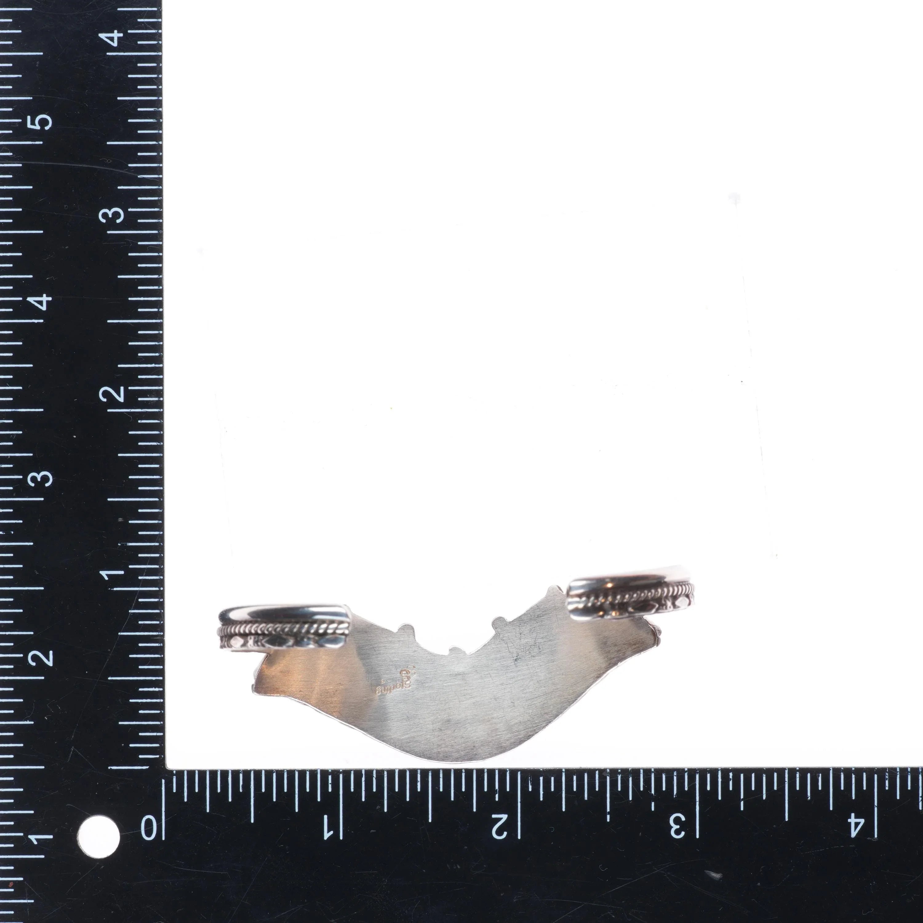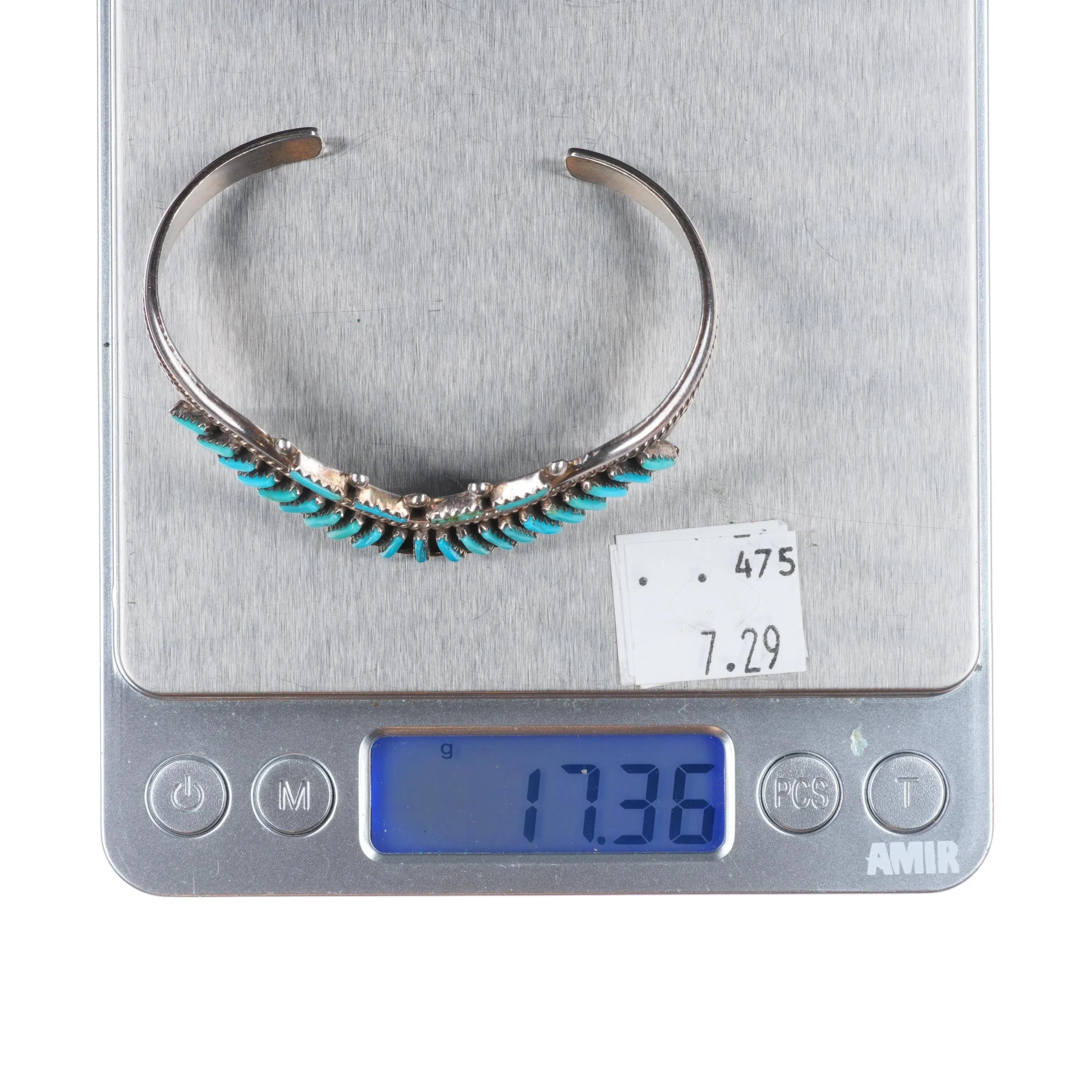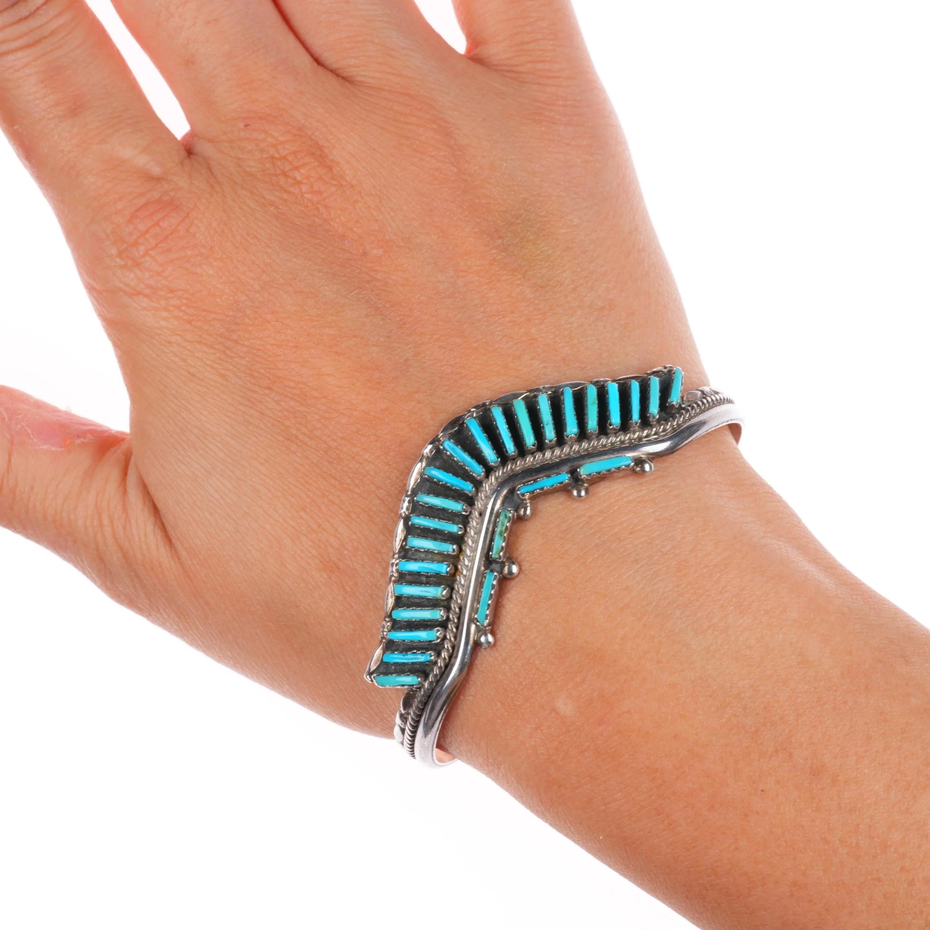 6.5" BB Zuni sterling silver turquoise curved needlepoint cuff bracelet. Tested and guaranteed solid sterling silver with weight and measurements in pictures. No damage or significant wear, signed by the artist, circa last quarter of the 20th century.