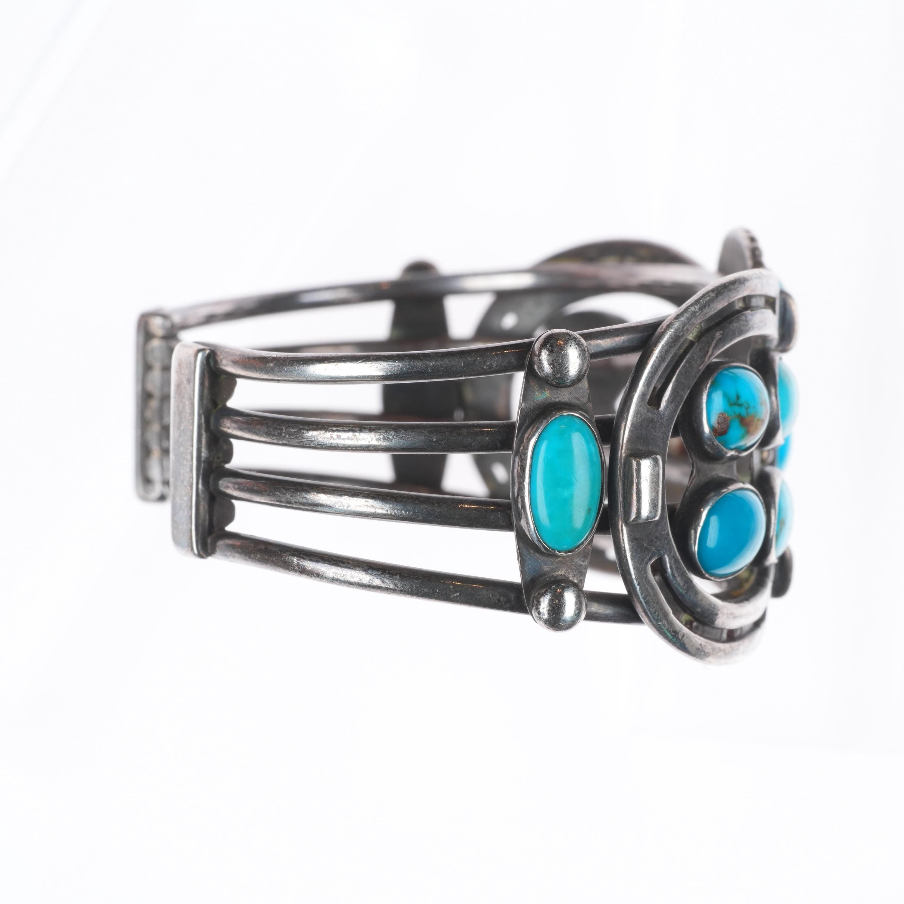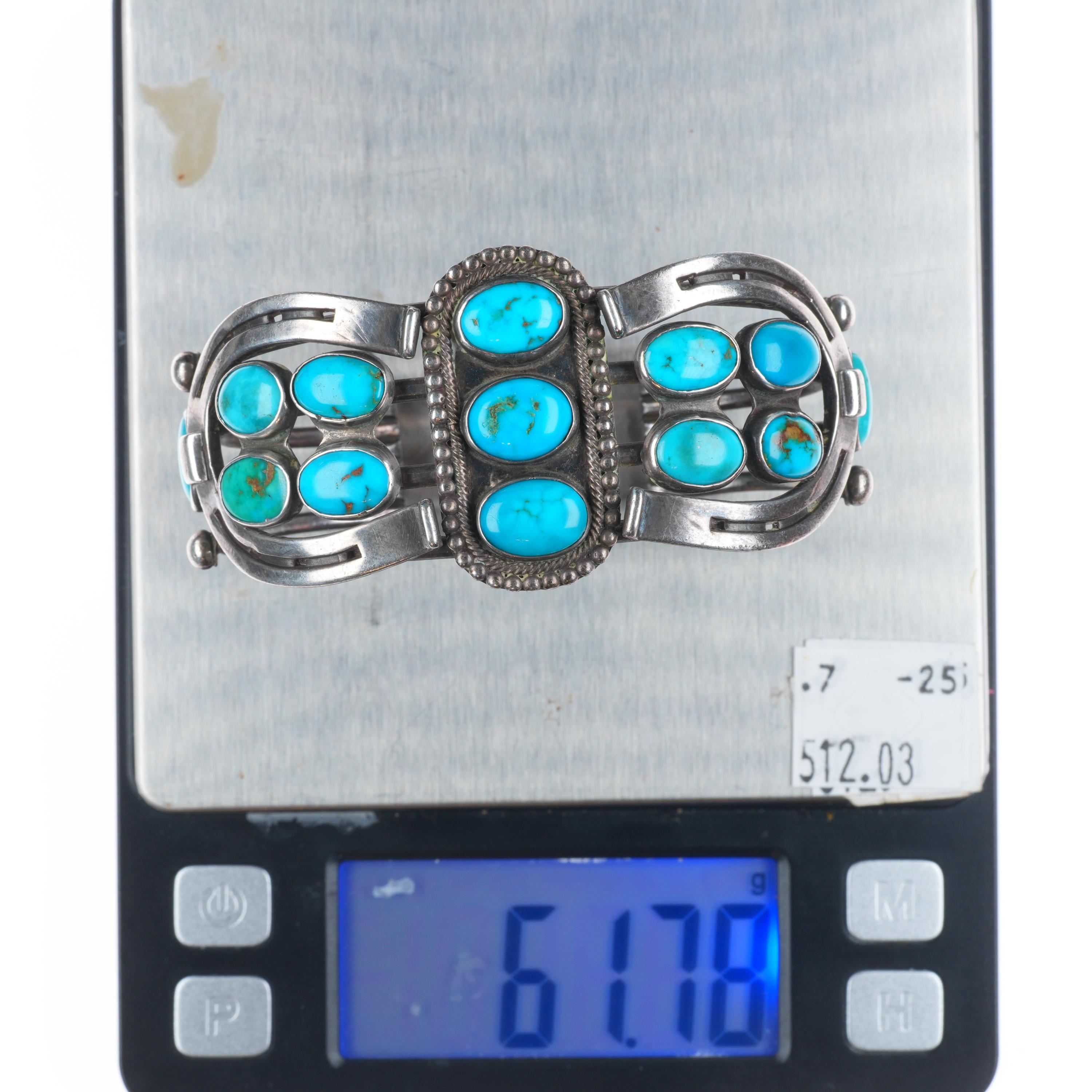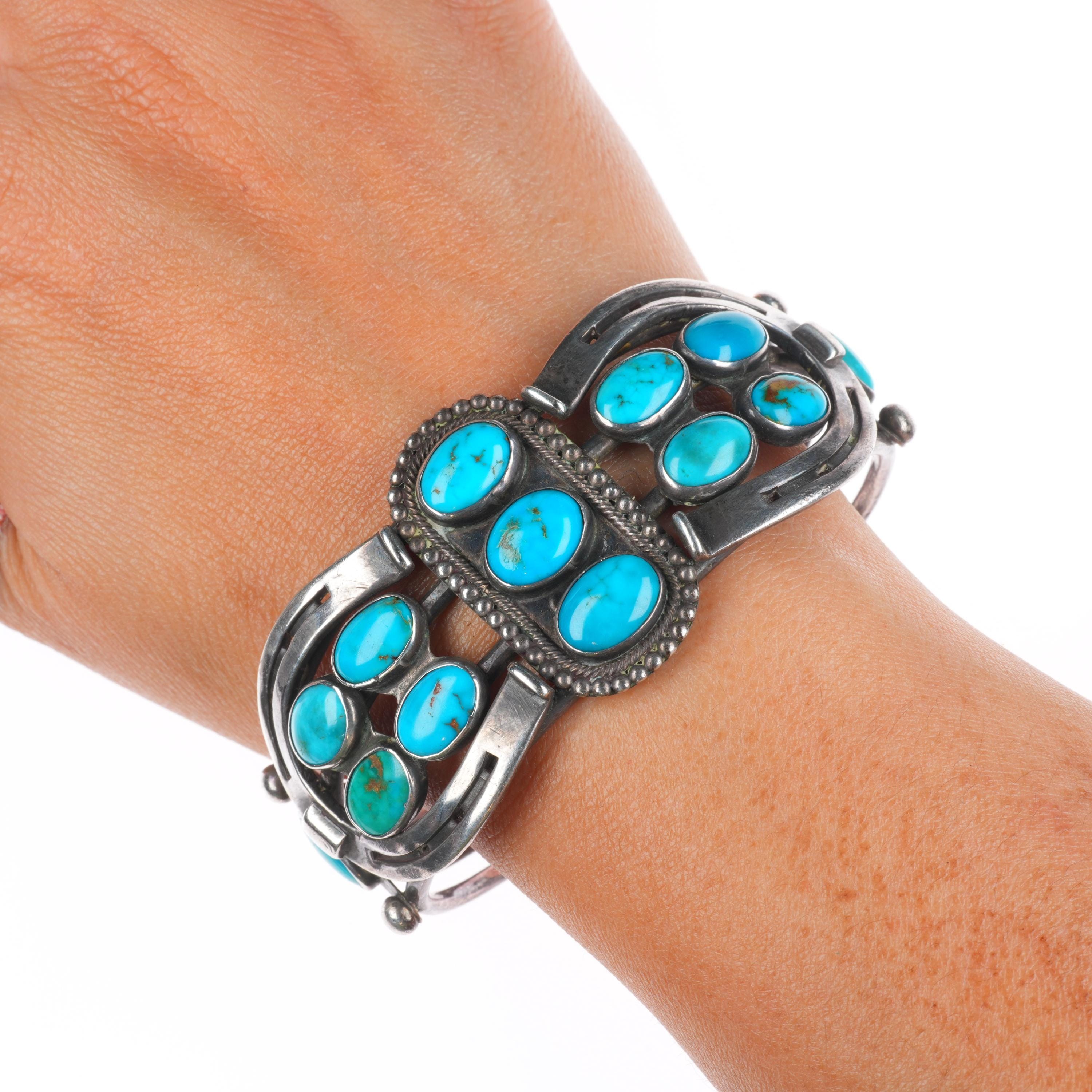 6.5" c1940 Navajo Blue Gem turquoise Horseshoes sterling silver cuff bracelet. Tested and guaranteed solid sterling silver with weight and measurements in pictures. Circa second quarter of the 20th century with some expected age appropriate wear.