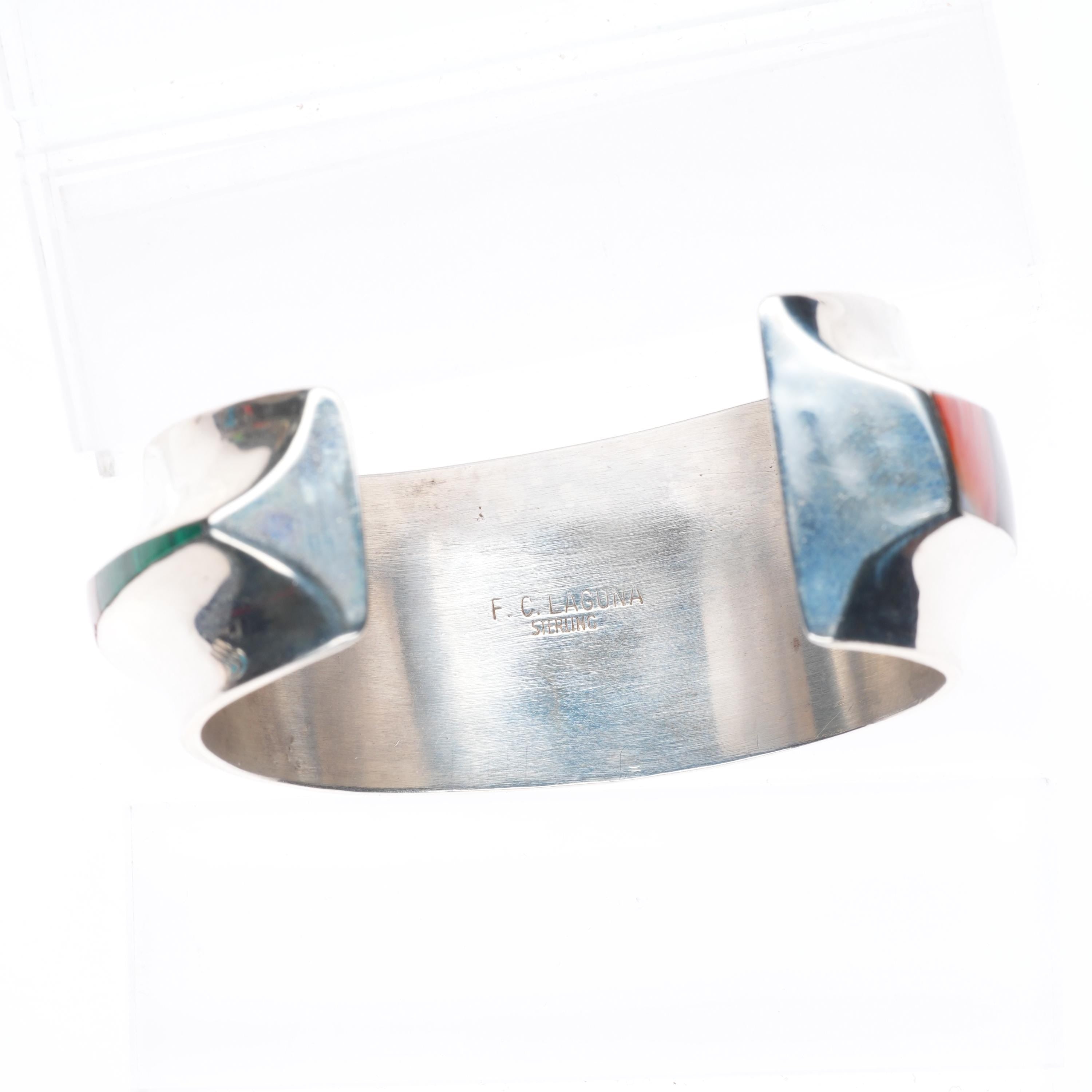 Laguna Pueblo silversmith Frank Carrillo often represents his creativity and skill in colorful, well-crafted, and distinctively one-of-a-kind jewelry items. He skillfully cuts gemstones such as turquoise, lapis, and spiny oyster shell, and creates colorful mosaics in his jewelry. Swirling water designs and geometric patterns, executed in silver overlay style often frame the gemstones. Frank Carrillo signs his jewelry as F.C. LAGUNA and STERLING.