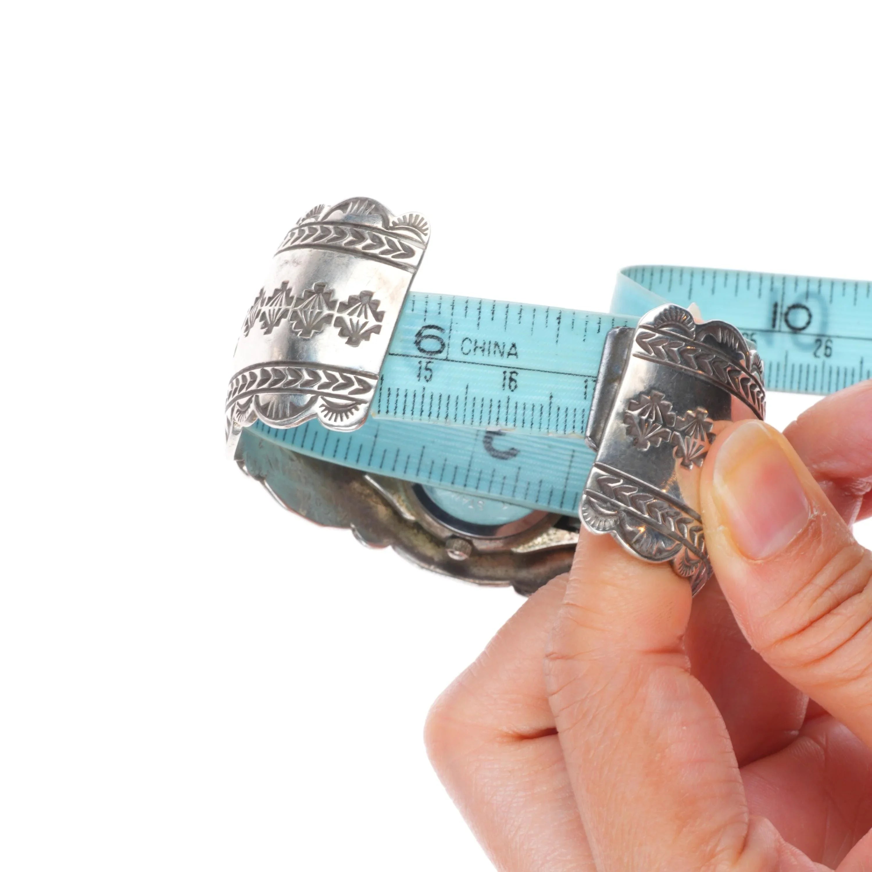 6.65" B Soce Navajo sterling silver heavy stamped watch cuff bracelet. Selling the watch bracelet shown, tested and guaranteed solid sterling silver. Weight and measurements in pictures. Watch needs a battery.