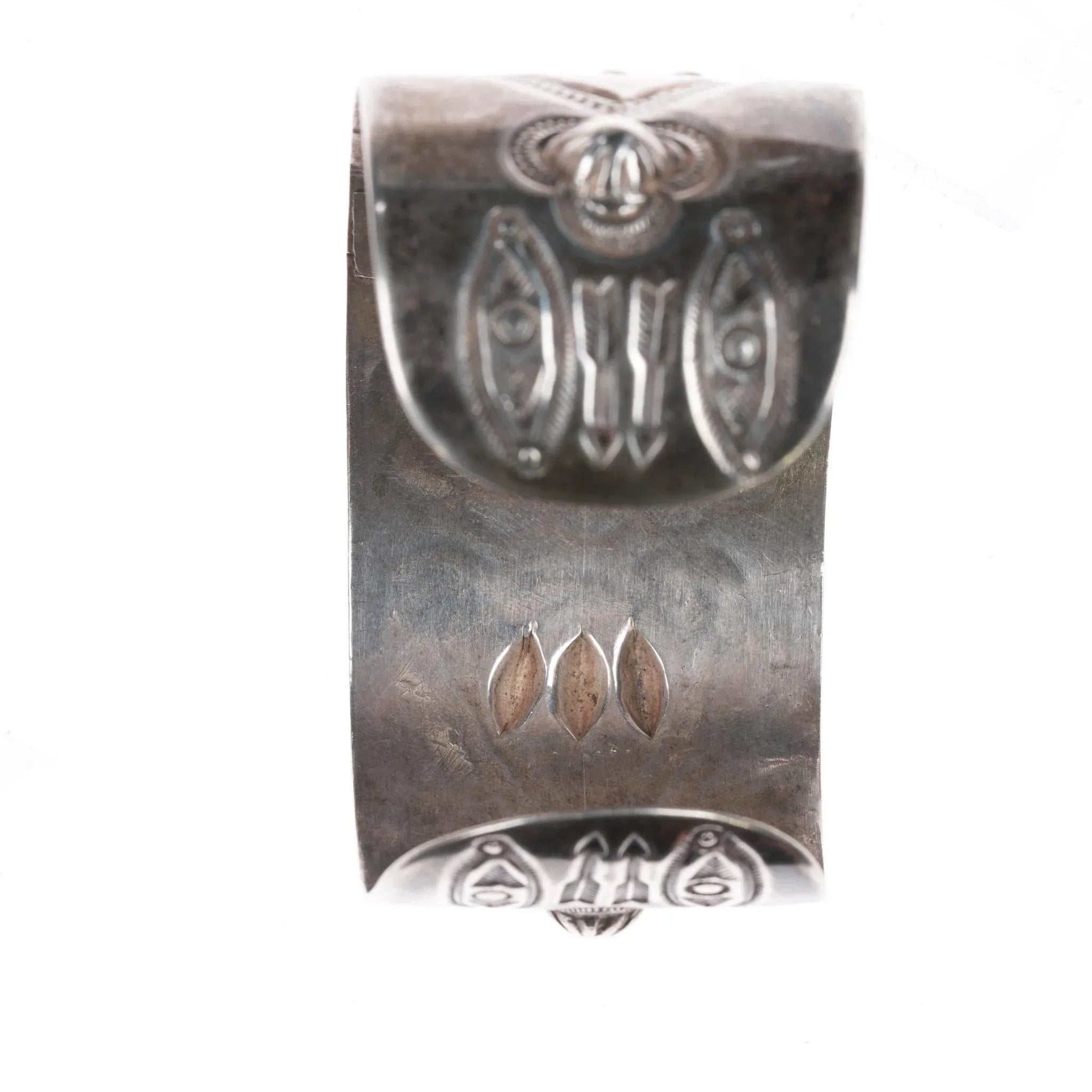 6 7/8" c1940‘s Navajo stamped repousse silver cuff bracelet with turquoise. Very old repair with brace added to interior center. Weight and measurements in pics.