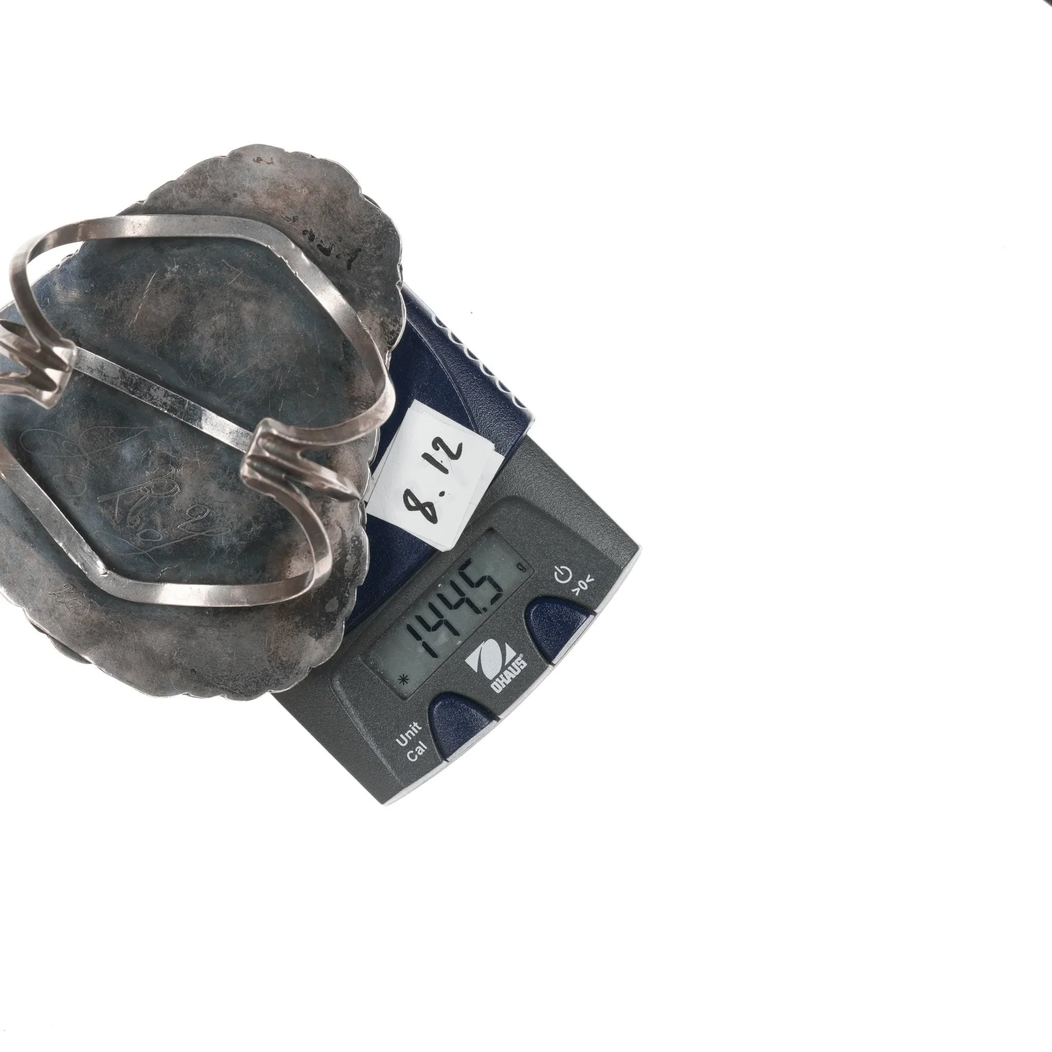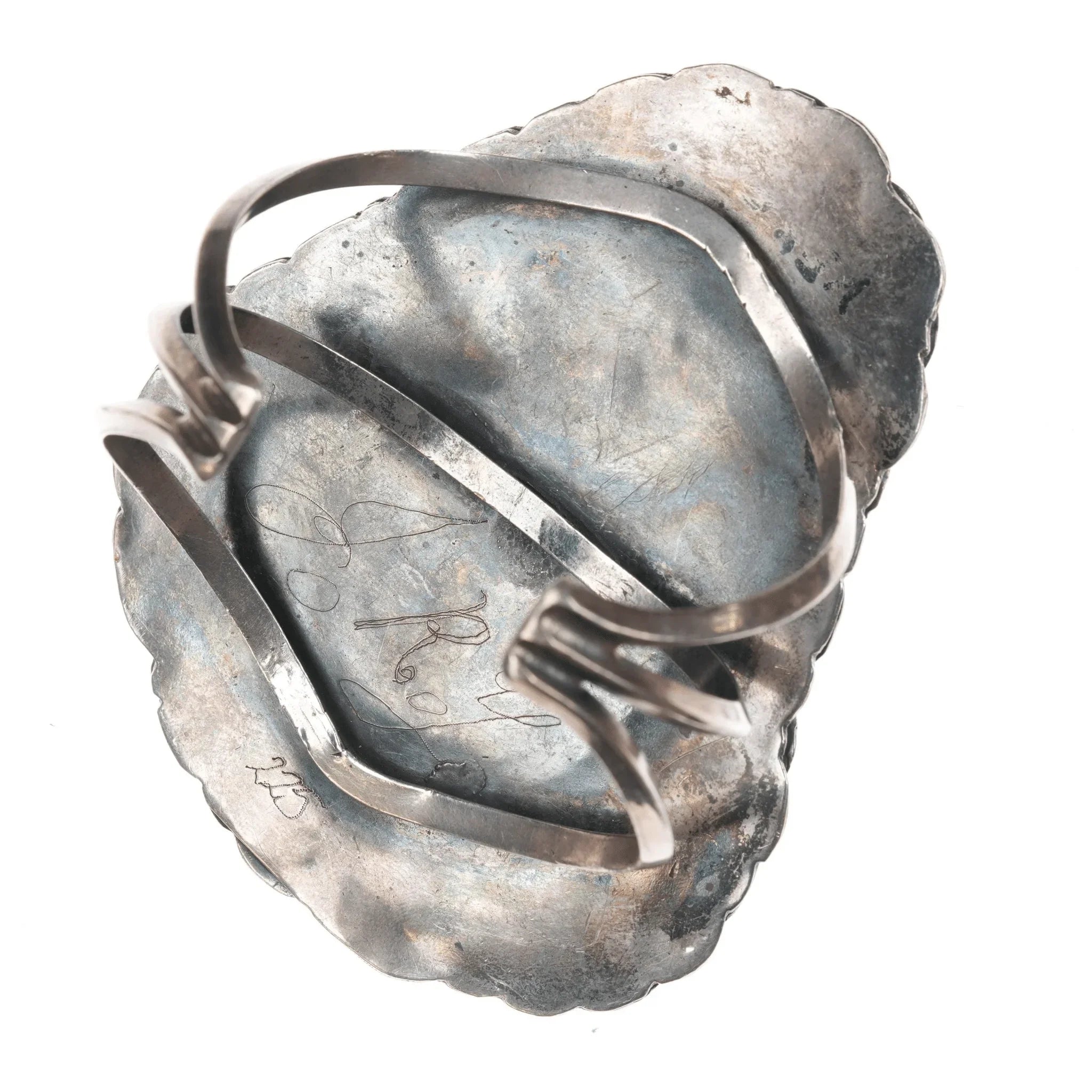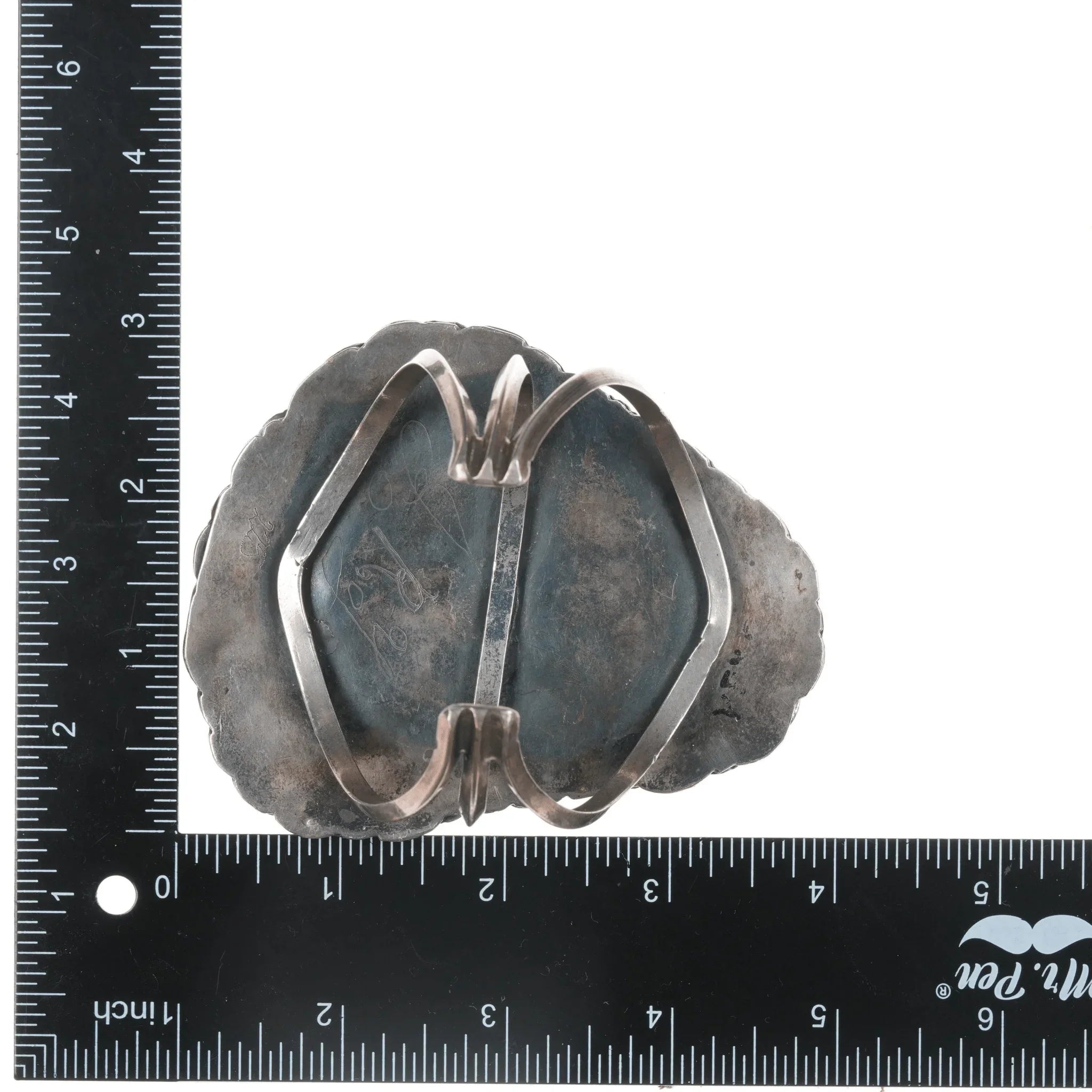 6 7/8" Huge Vintage Ceremonial Kingman turquoise slab sterling cuff bracelet. circa 60's-70's, Signed J.R.Y. Stone secure in bezel with one small fracture near the tip.