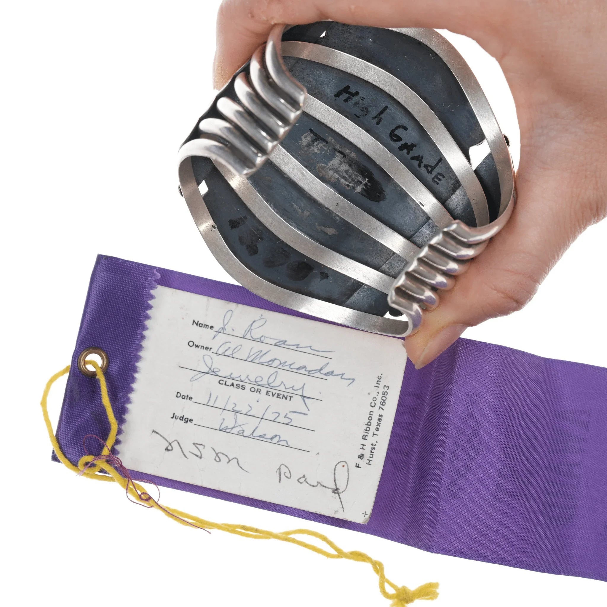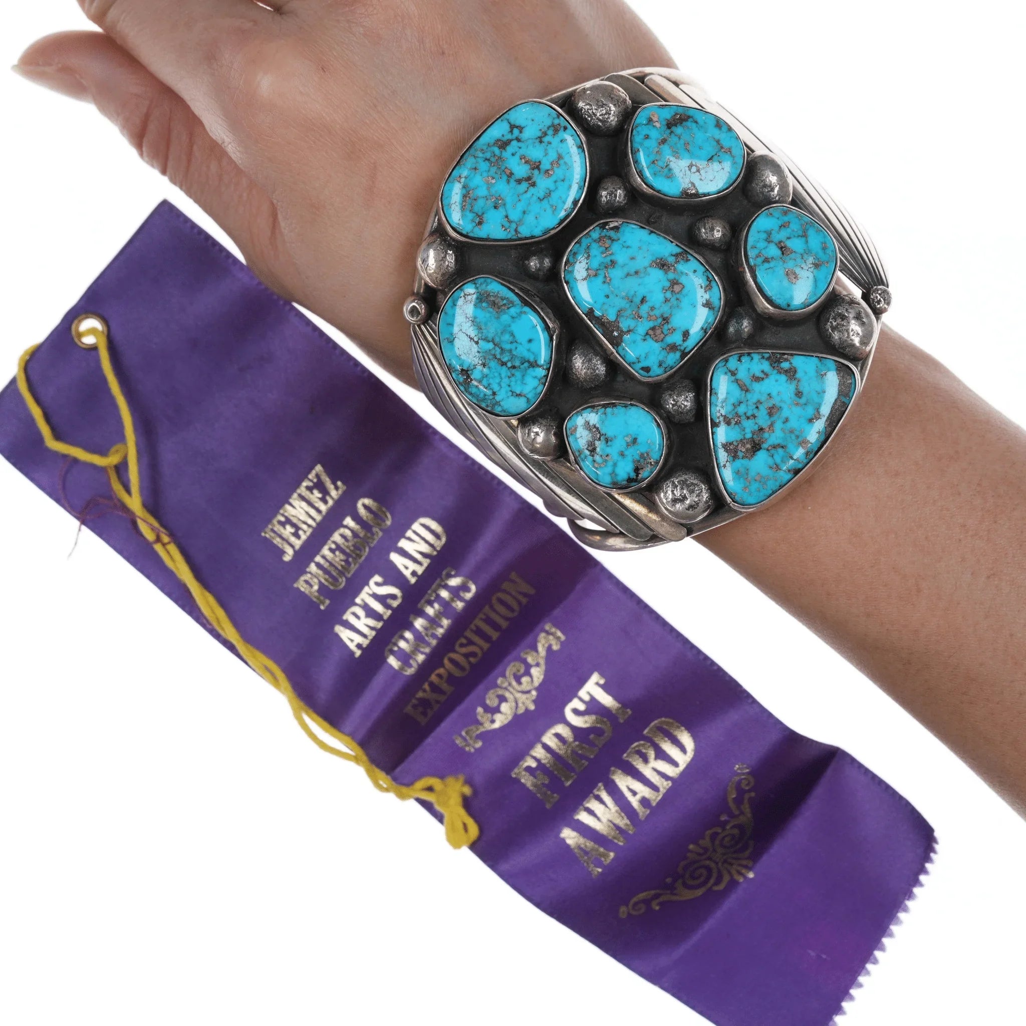 6 7/8" Jerry Roan Navajo 1975 First Prize winning cuff bracelet. 5 3/8" plus 1.5" gap. No apparent marks but very high quality. I acquired it with this ribbon and believe they go together.<br><br><br> Marked or unmarked as shown in pics, weight and other measurements in pics. Sorry but my jewelry is stored in a secure location and cannot be accessed for more pictures,<br>videos, or measurements until sold. If you look at pictures/description your<br>question should be answered. Thank you so much for your time and consideration!<br><br>All precious metals are tested and guaranteed. A Native American jewelry piece referred to as "silver" or "ingot" is guaranteed to be at least 90% silver. Bracelets are photographed on a 6" women's wrist.