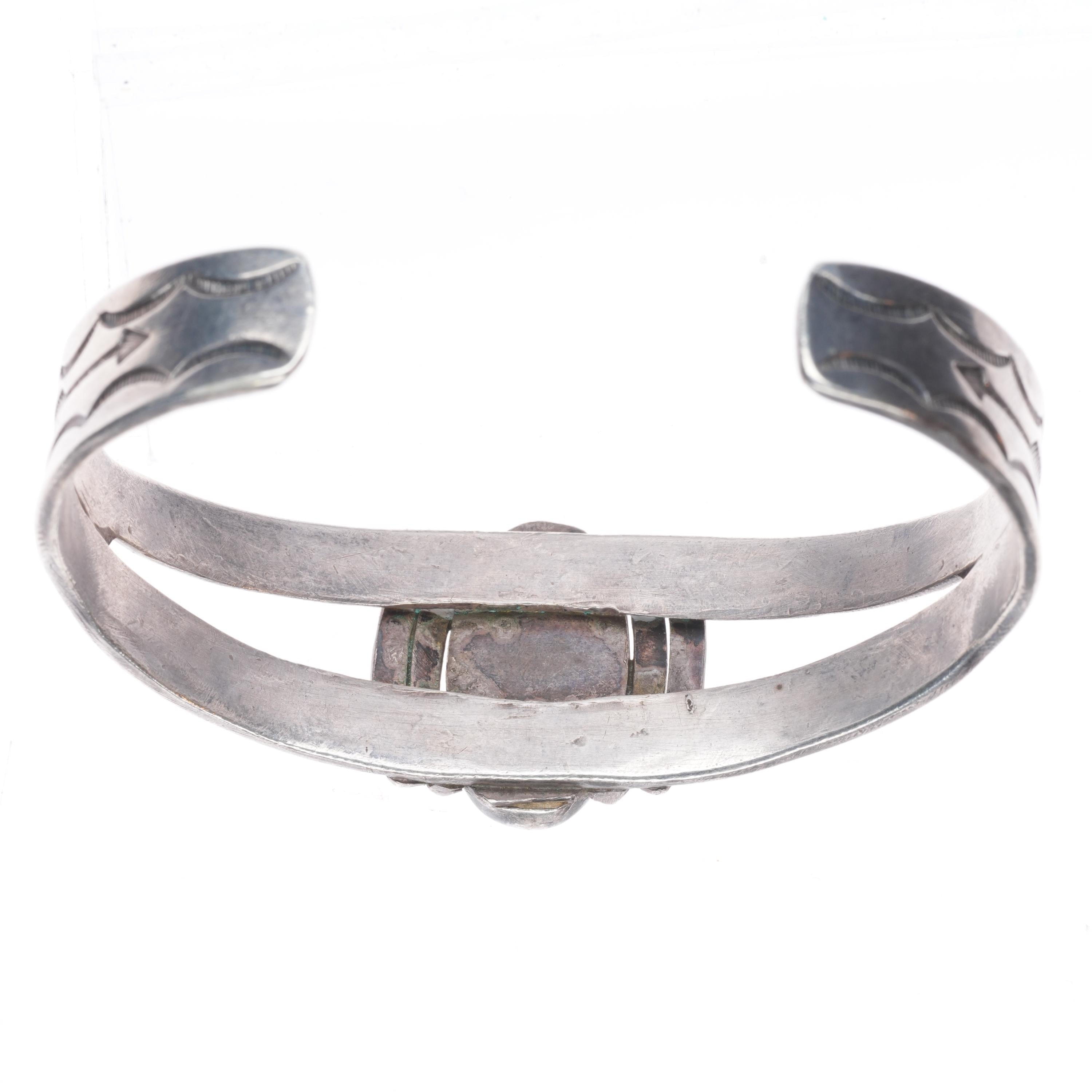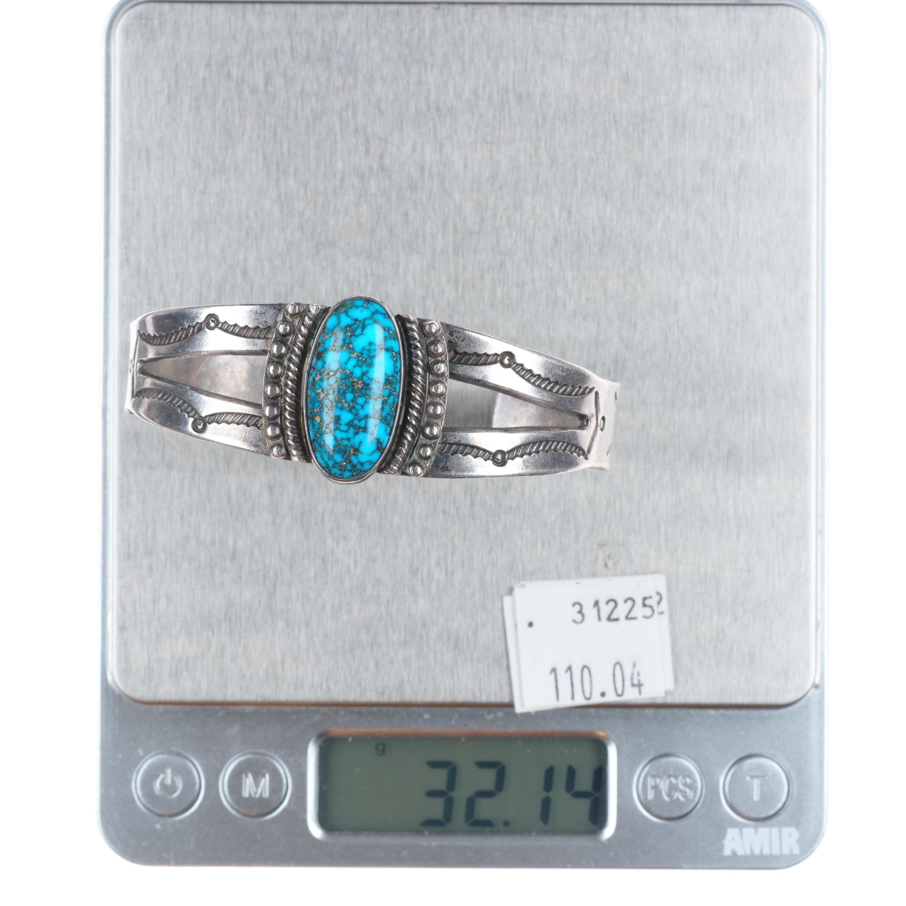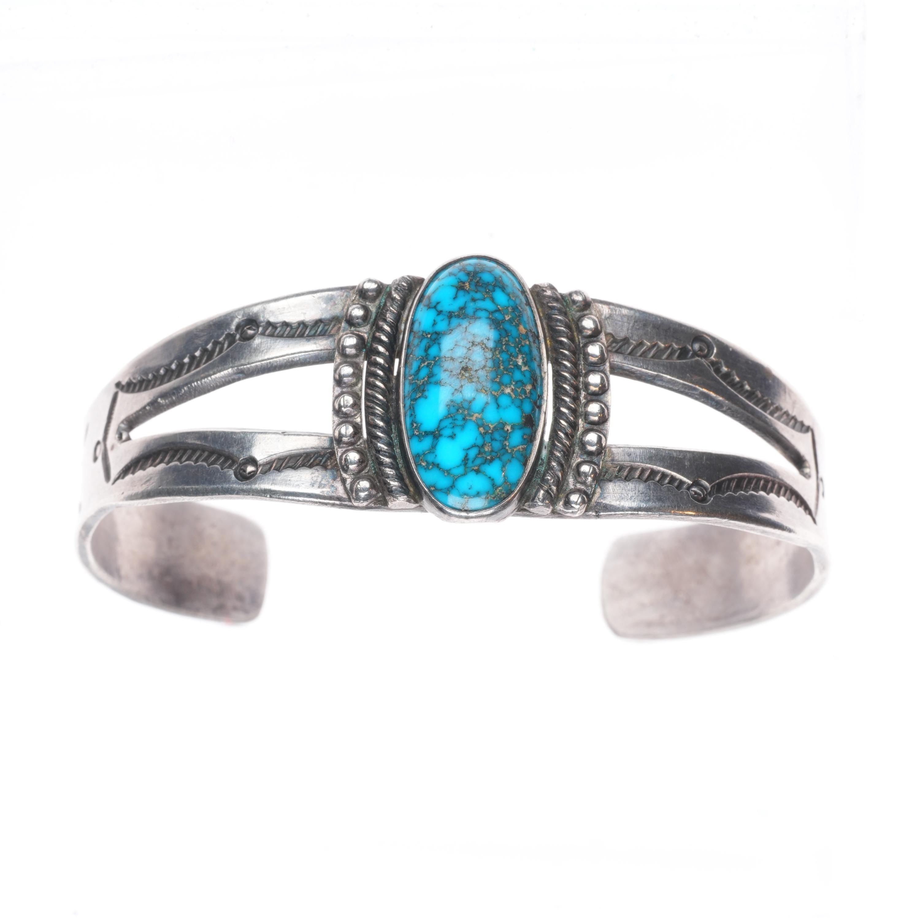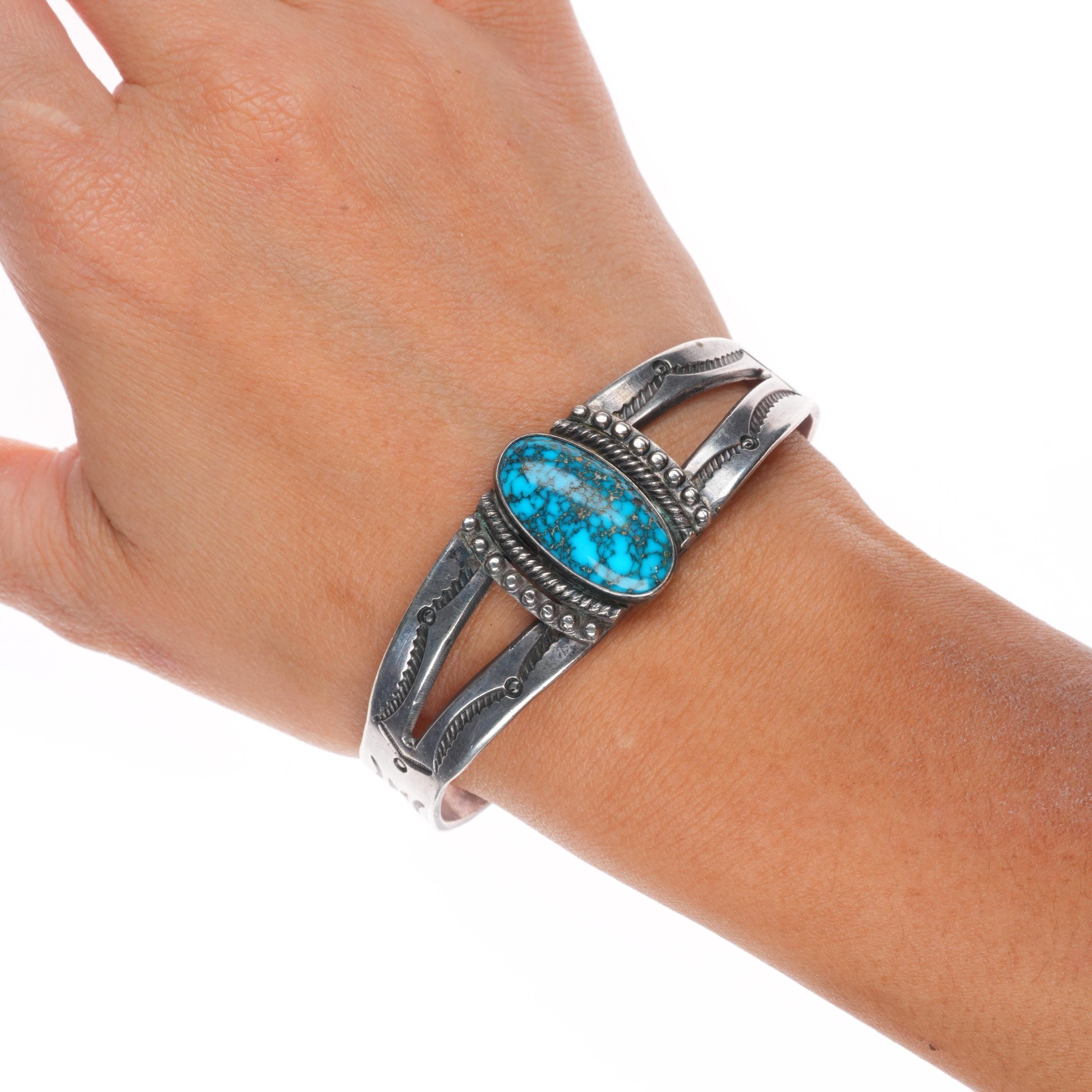 6.7" c1940 Navajo Lone Mountain turquoise vintage sterling silver cuff bracelet. Tested and guaranteed solid sterling silver with weight and measurements in pictures. Circa second quarter of the 20th century. Fits up to a 6.7" wrist without adjustment, though .25" or more of careful adjustment is typically very simple. Any adjustment will change the gap size of course which is shown in the pictures.