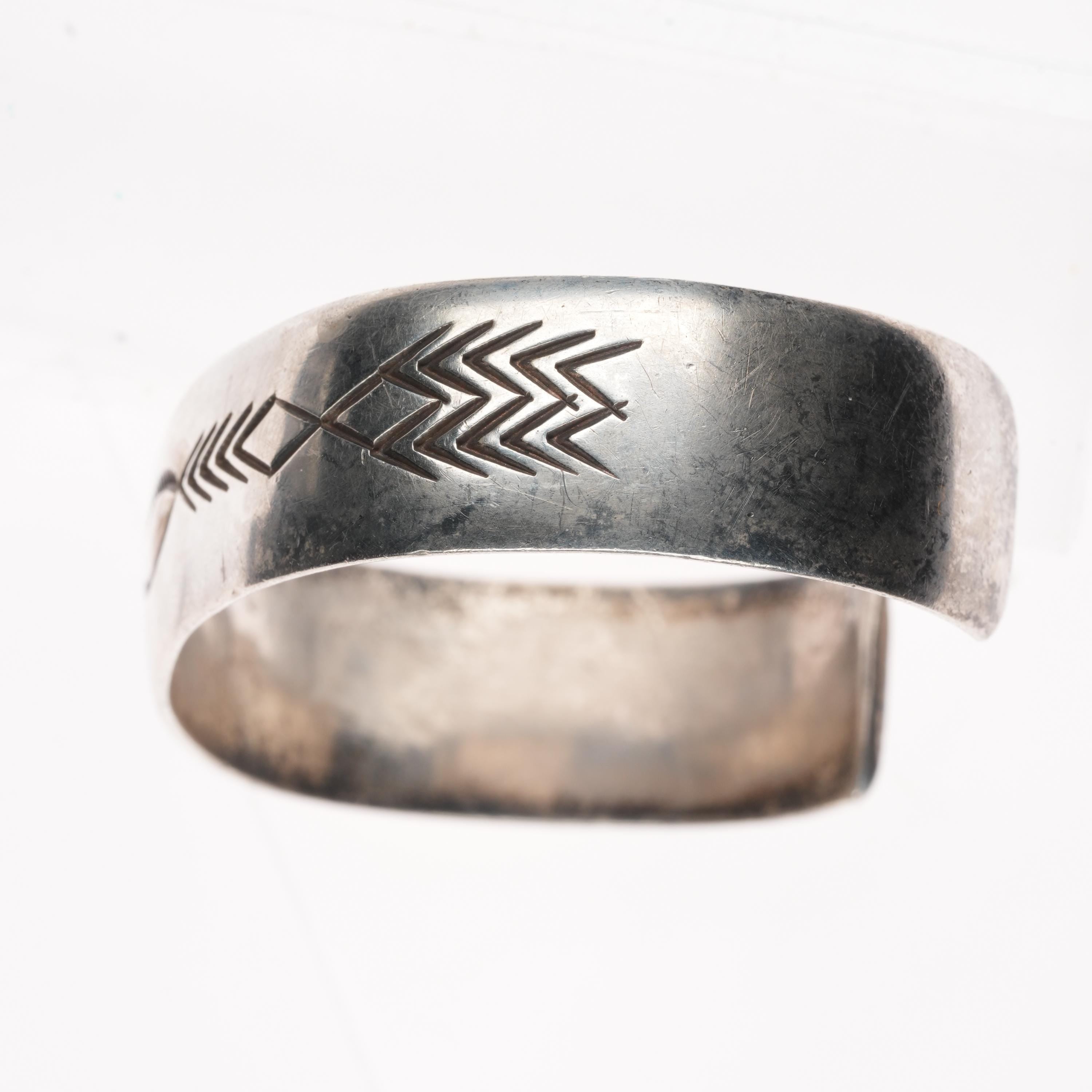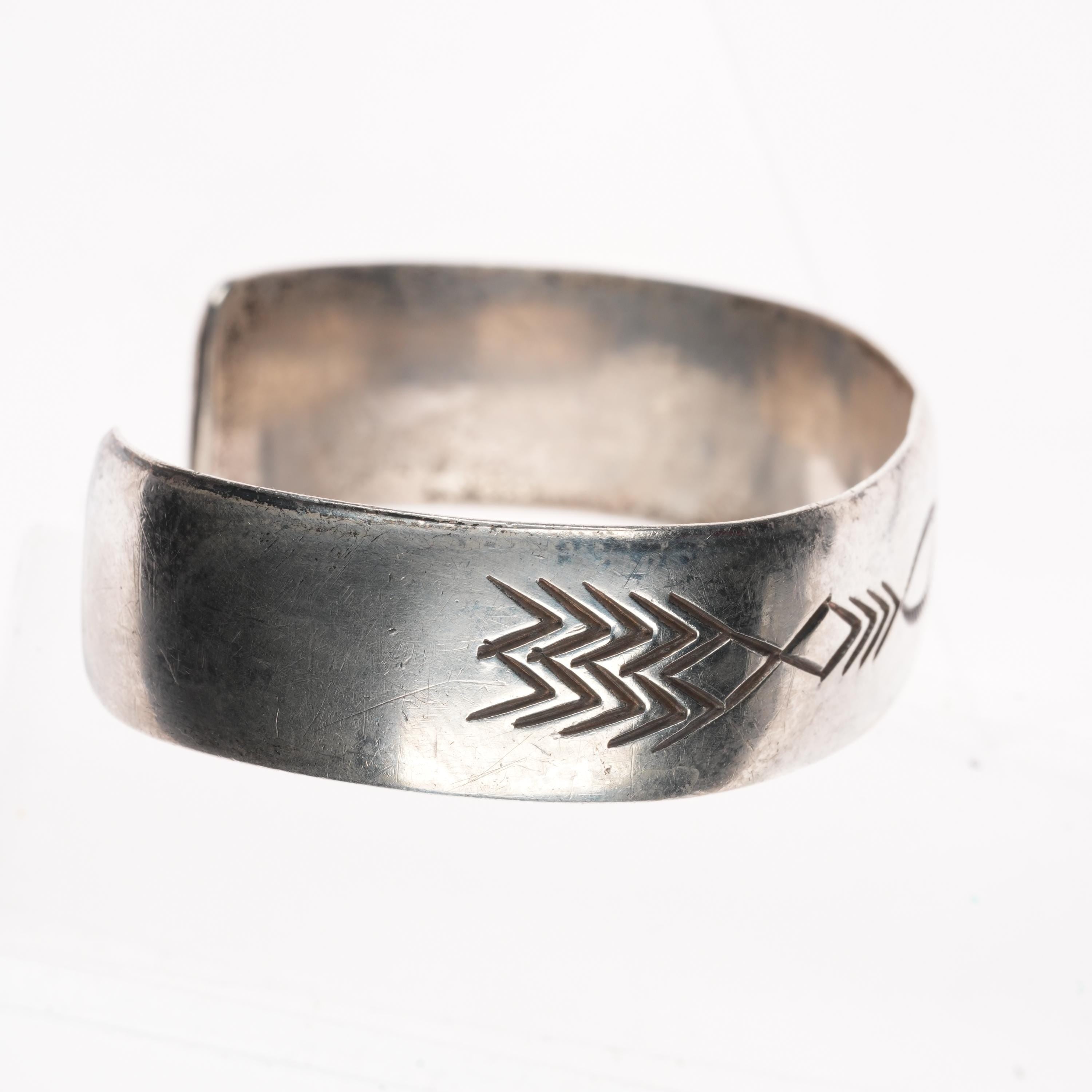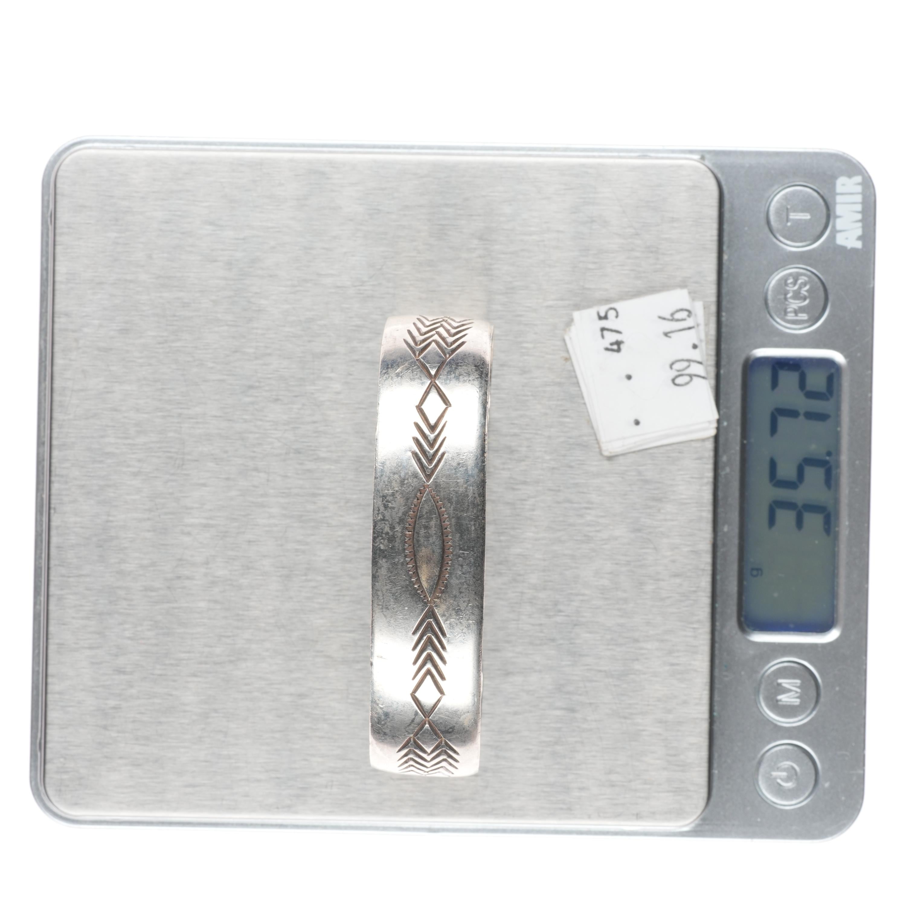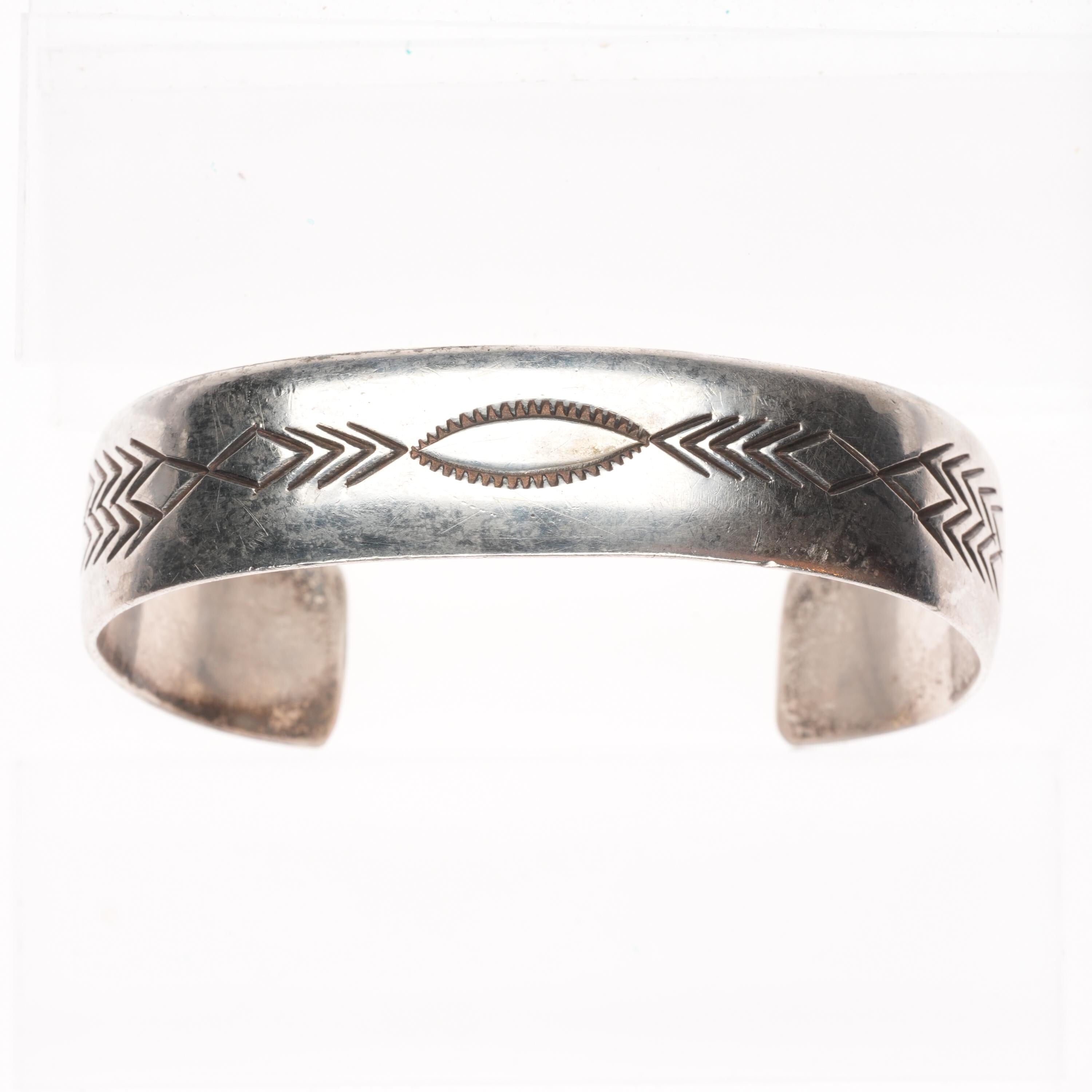 6.7" Vintage Navajo sterling silver hand stamped sterling silver cuff bracelet. Tested and guaranteed solid sterling silver with weight and measurements in pictures. Circa third quarter of the 20st century. Unmarked.