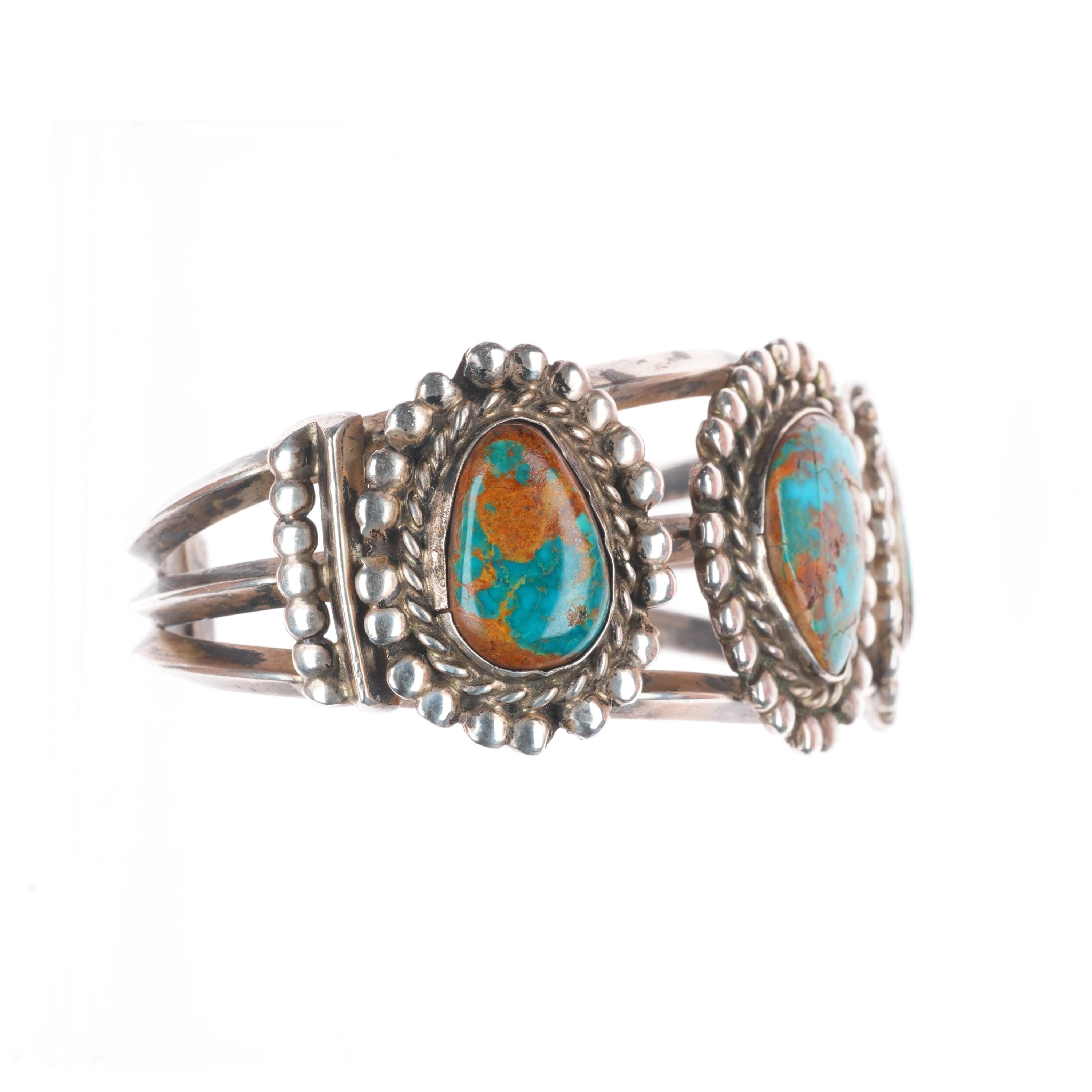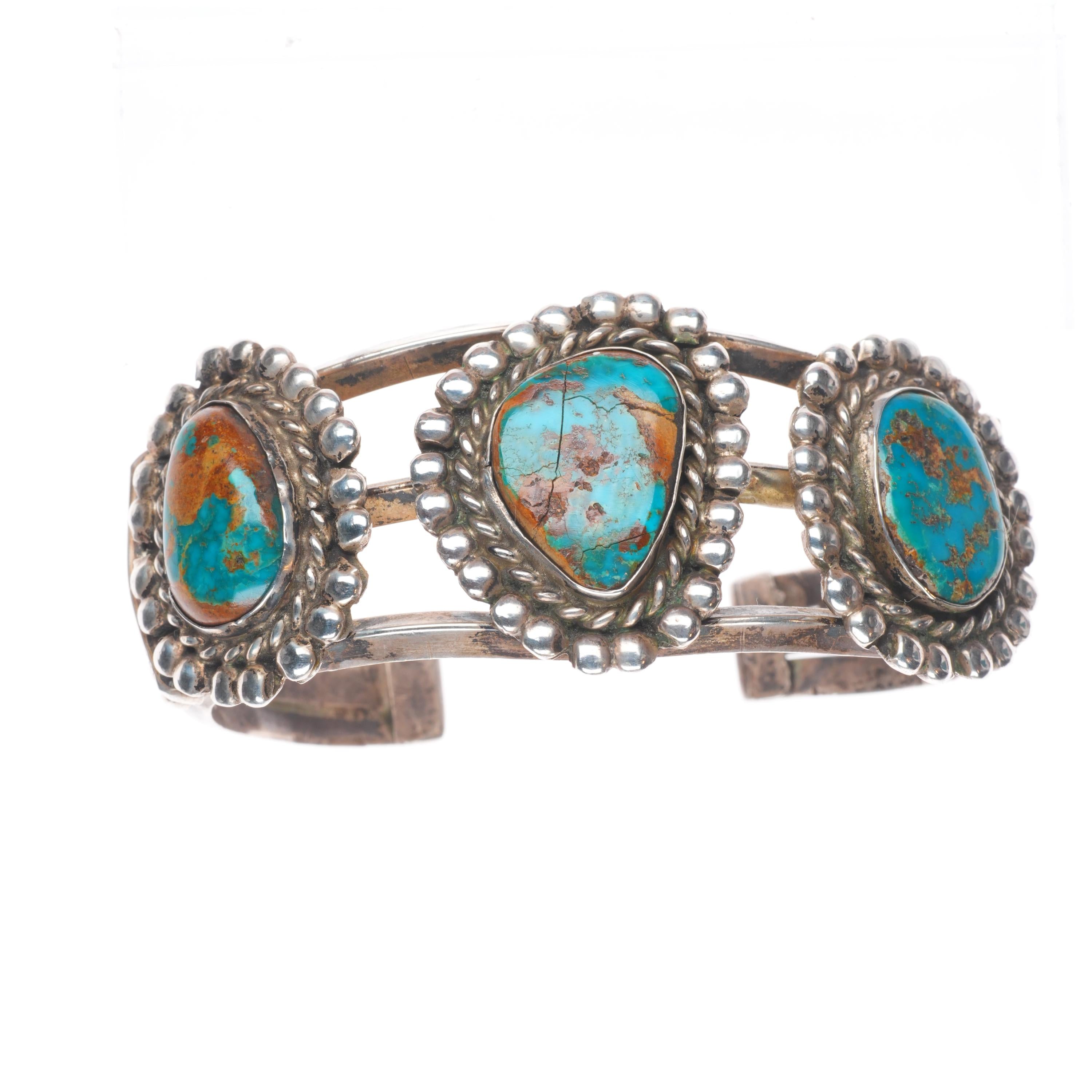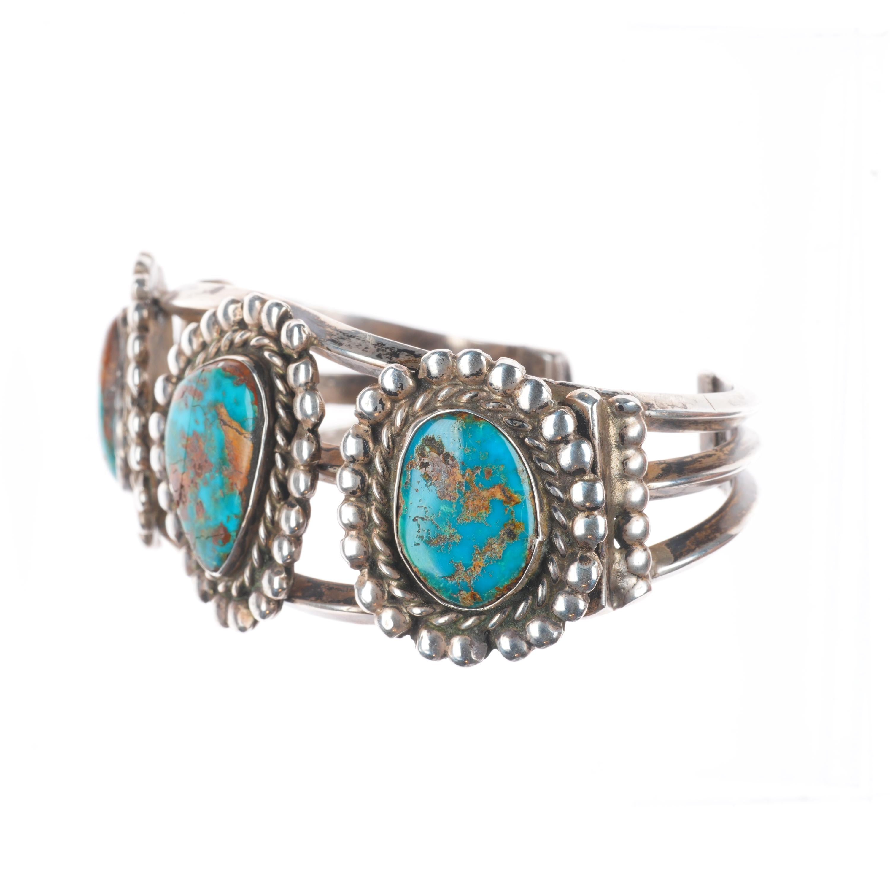 6.7" Vintage Navajo Sterling silver high grade turquoise cuff bracelet. Beautiful natural turquoise likely from a Nevada mine. Tested and guaranteed solid sterling silver with weight and measurements in pictures. Overall expected wear with apparent circa mid 20th century. Center stone with old fracture, all stones secure.